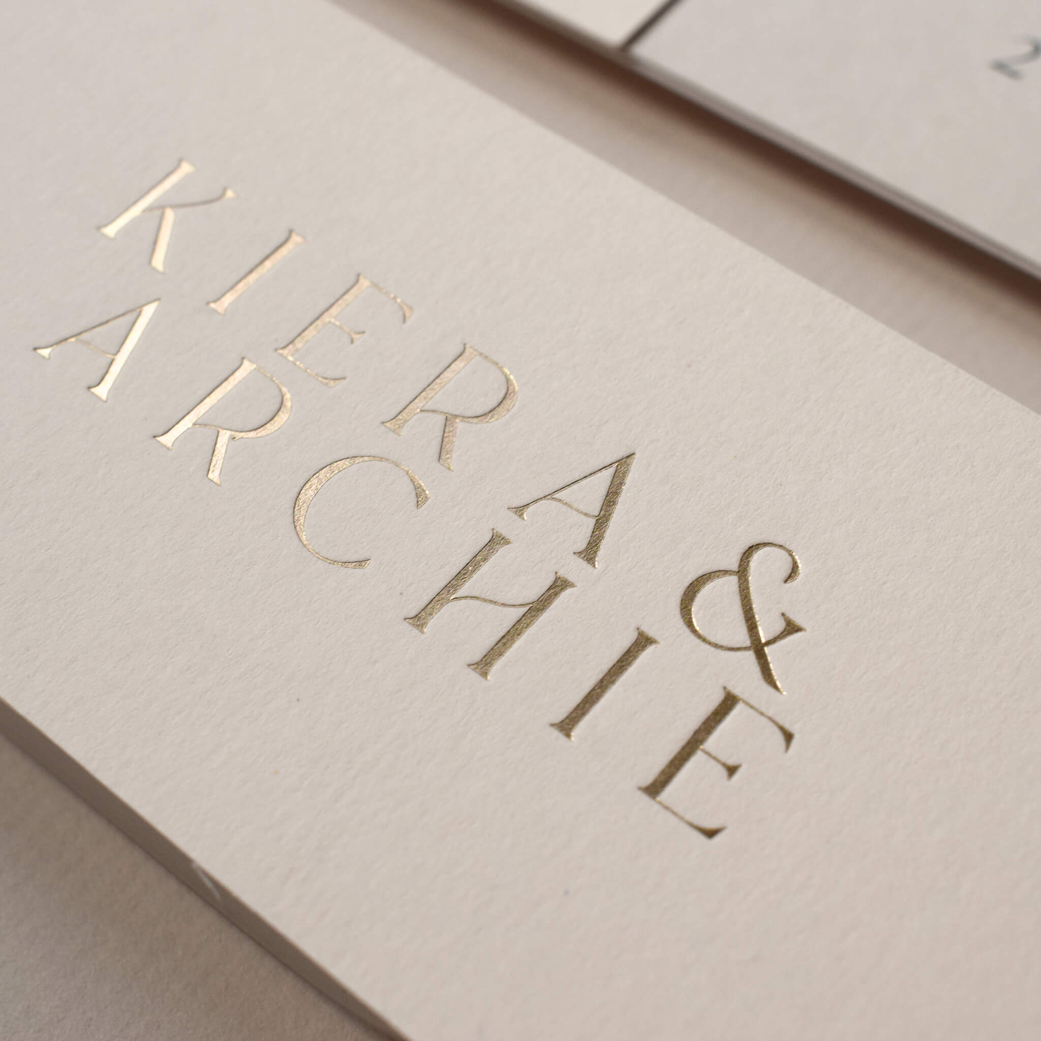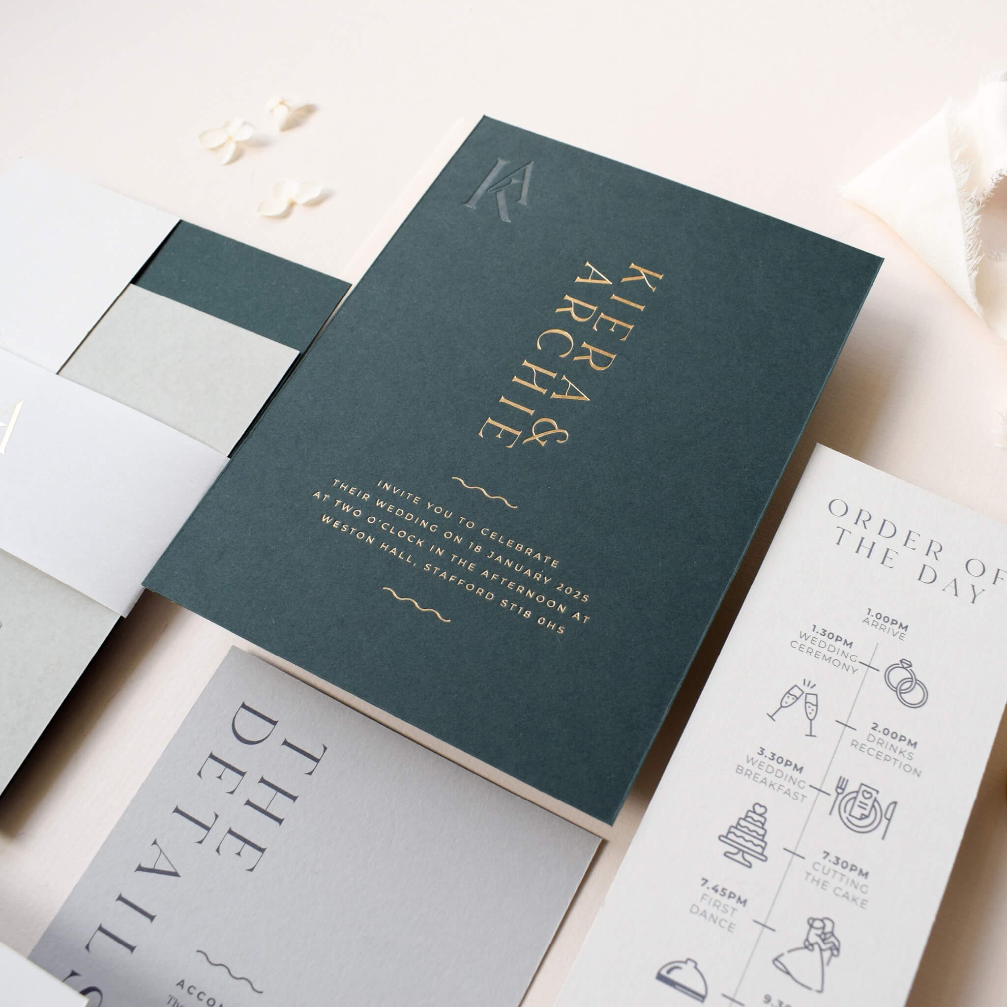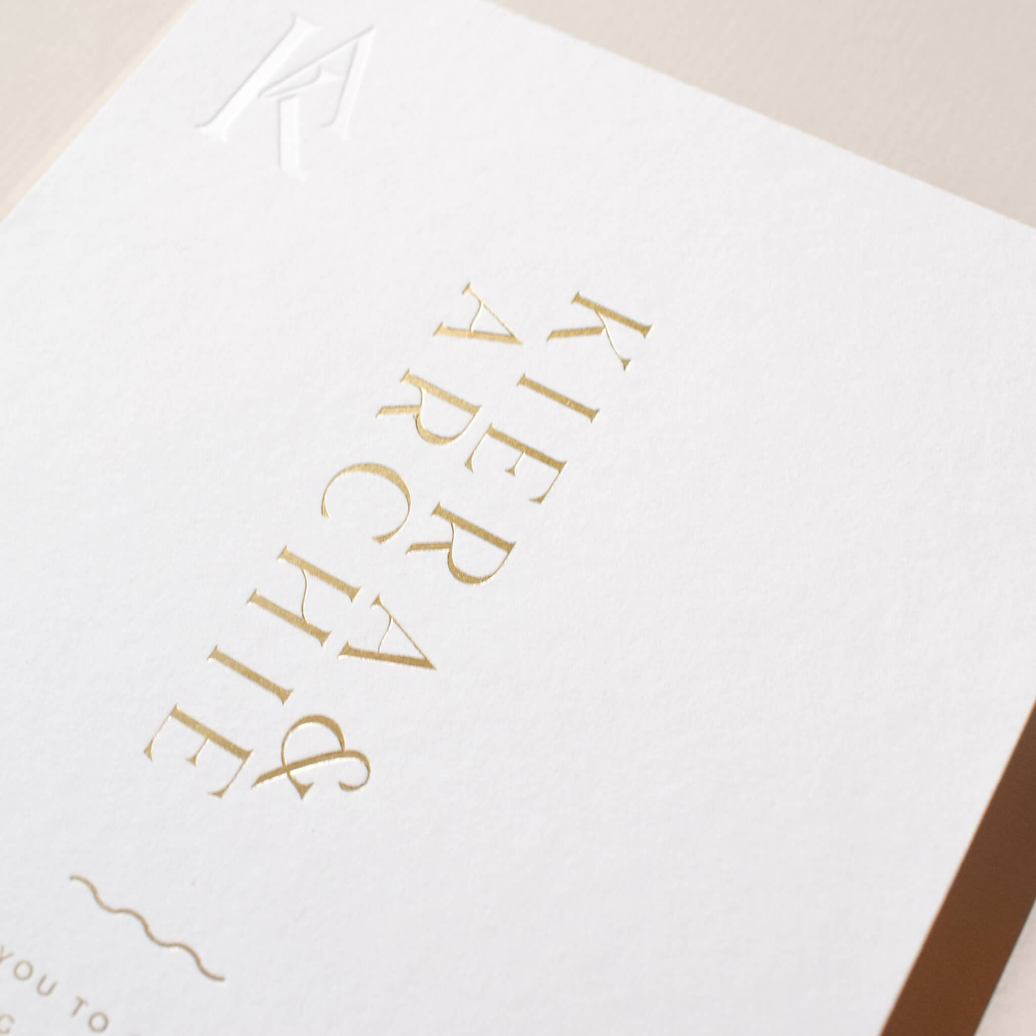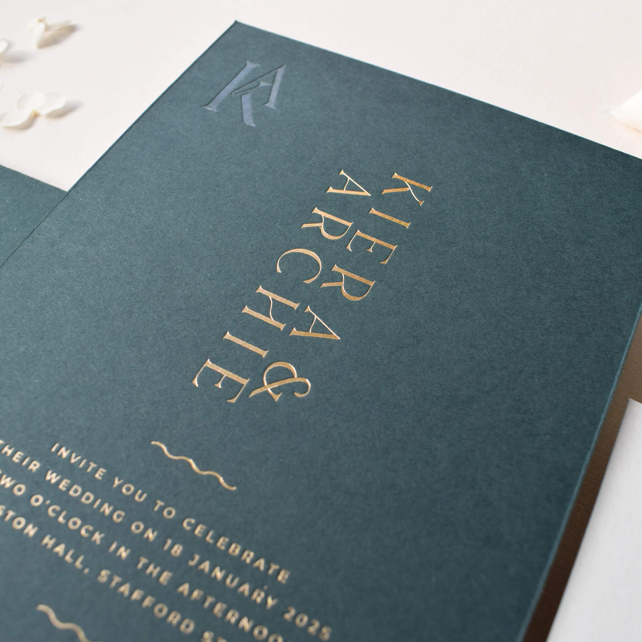 The Aliferous wedding stationery suite embodies a perfect blend of minimalism and elegance. Your names are displayed in bespoke, vertical typography, exuding opulence with hot foil printing. The design has a clean, modern aesthetic with a touch of classic charm. The bespoke monogram in the top corner adds a sophisticated personal touch. This collection radiates a sense of luxury, capturing the essence of a modern celebration with a timeless allure.