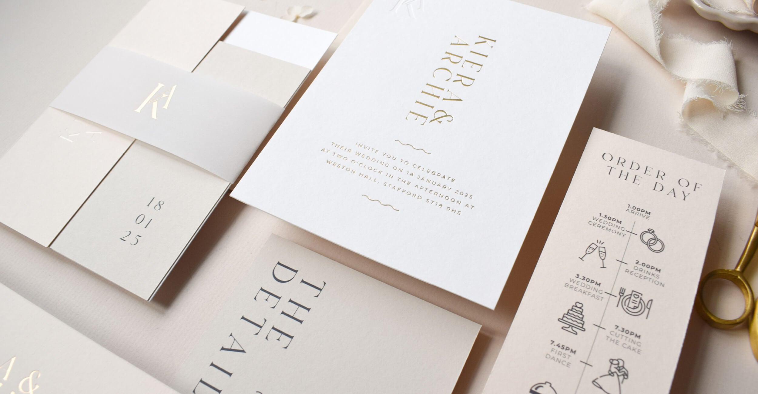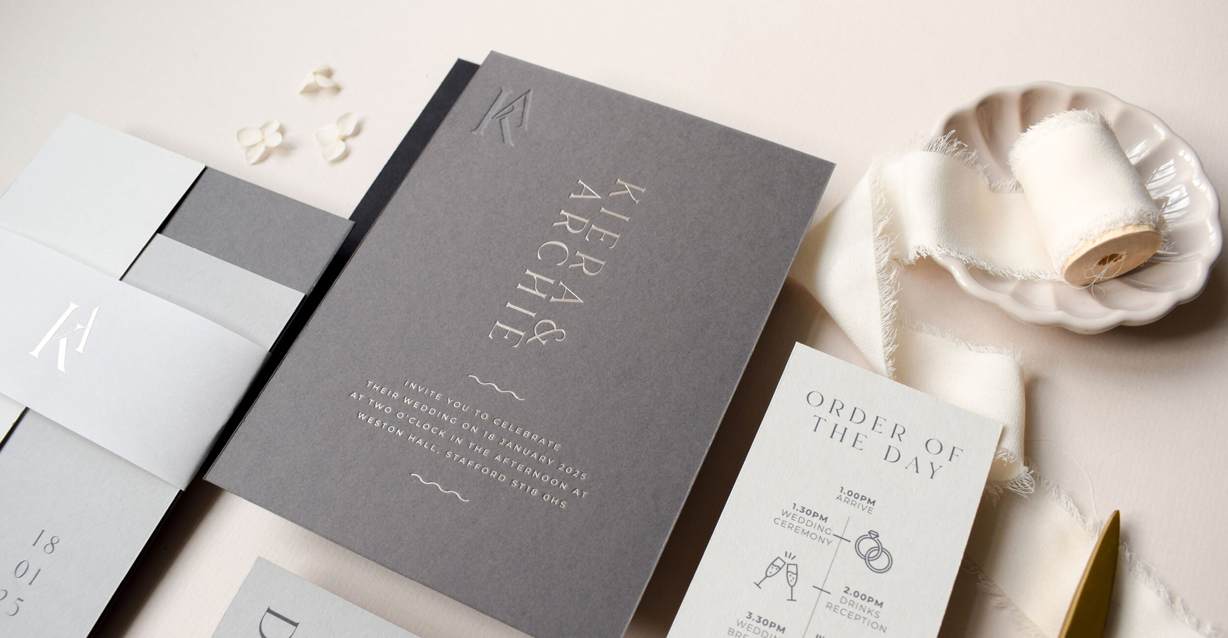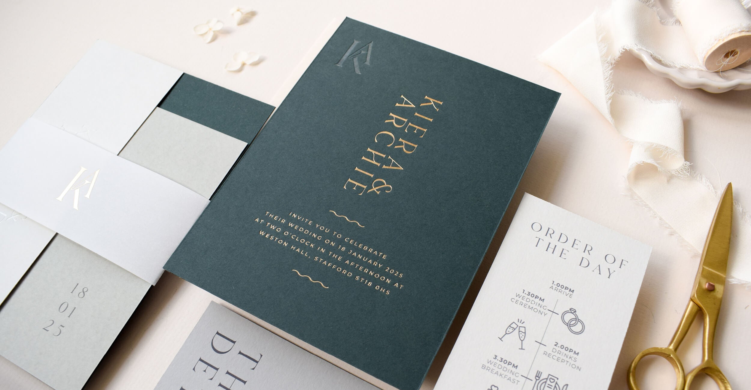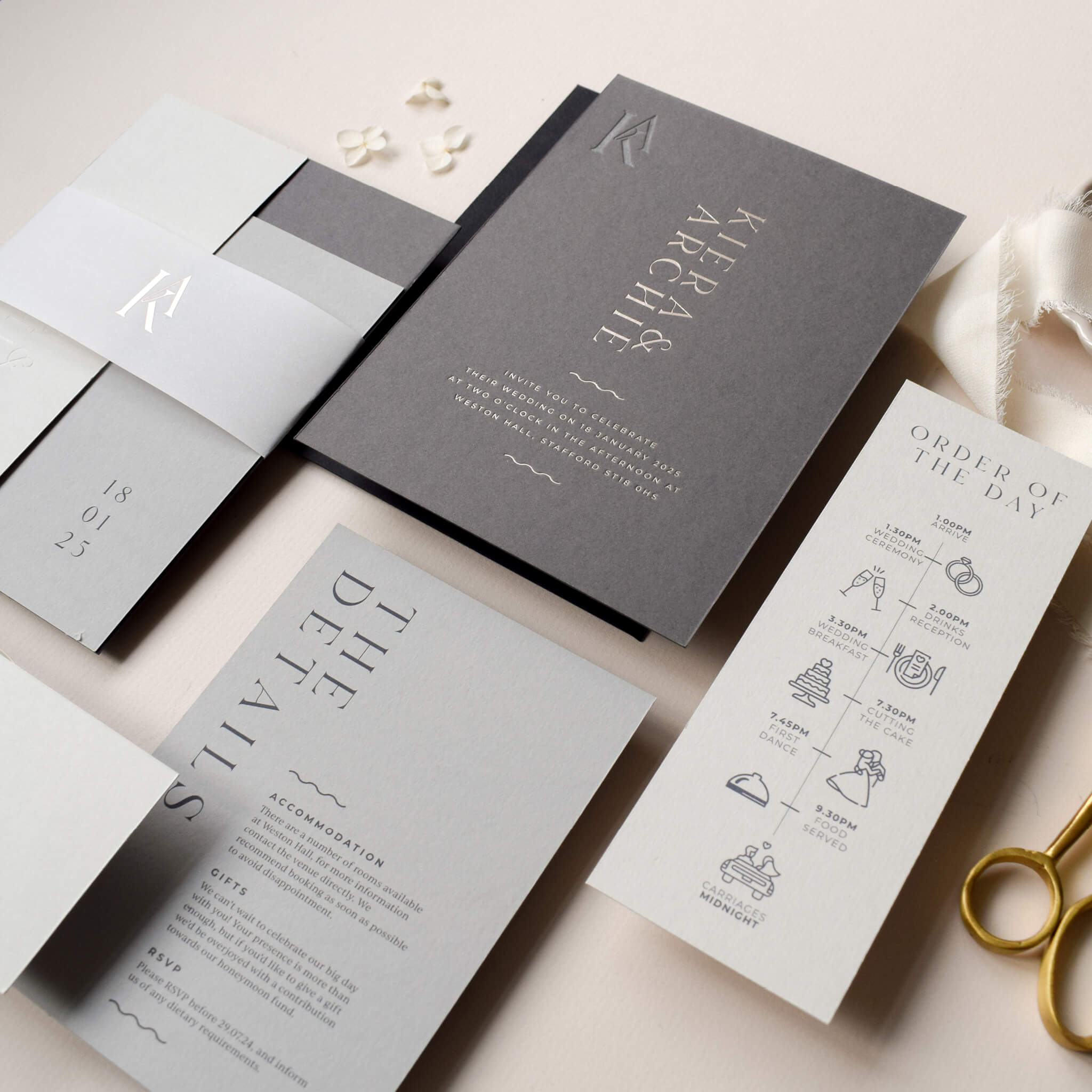 The Aliferous wedding stationery suite embodies a perfect blend of minimalism and elegance. Your names are displayed in bespoke, vertical typography, exuding opulence with hot foil printing. The design has a clean, modern aesthetic with a touch of classic charm. The bespoke monogram in the top corner adds a sophisticated personal touch. This collection radiates a sense of luxury, capturing the essence of a modern celebration with a timeless allure.