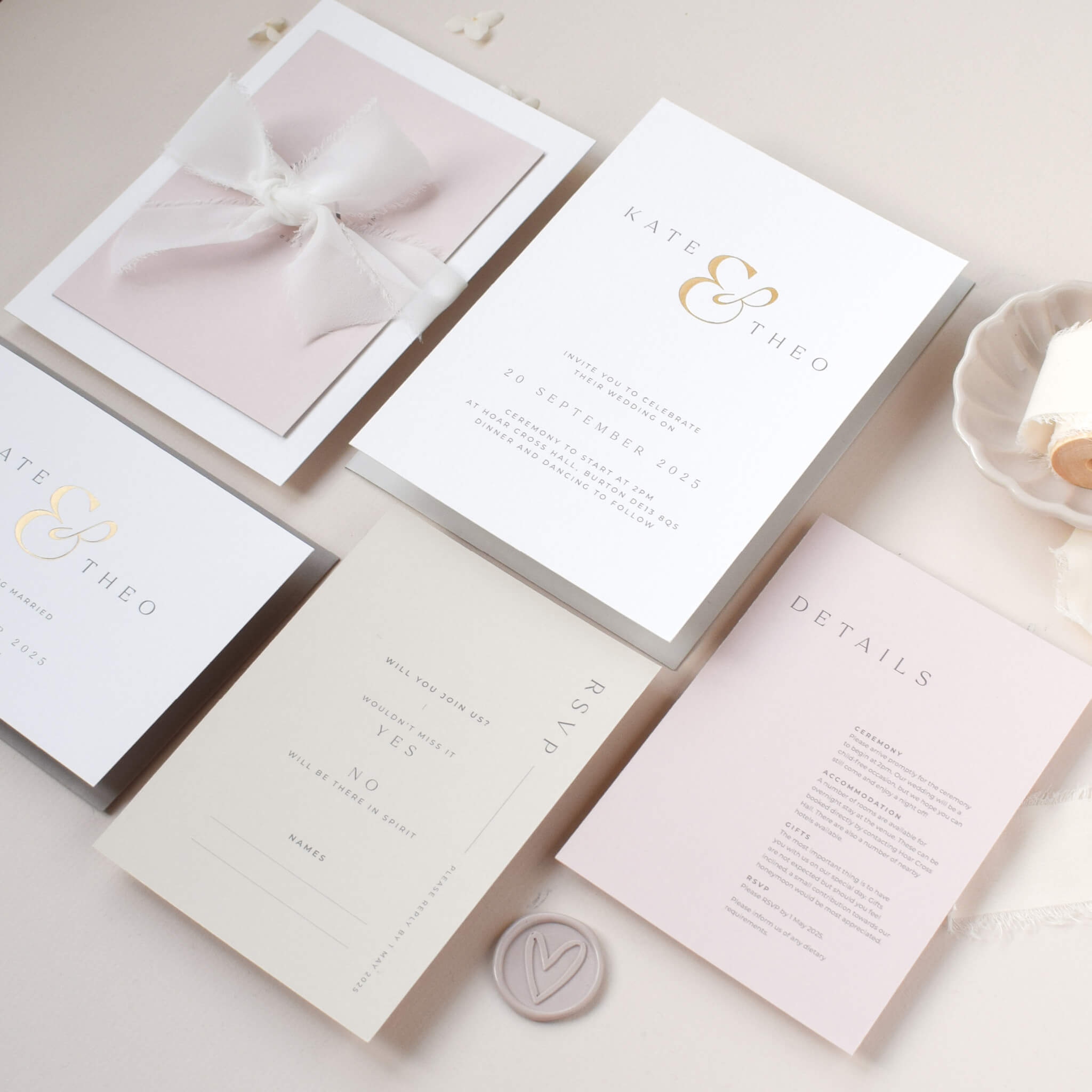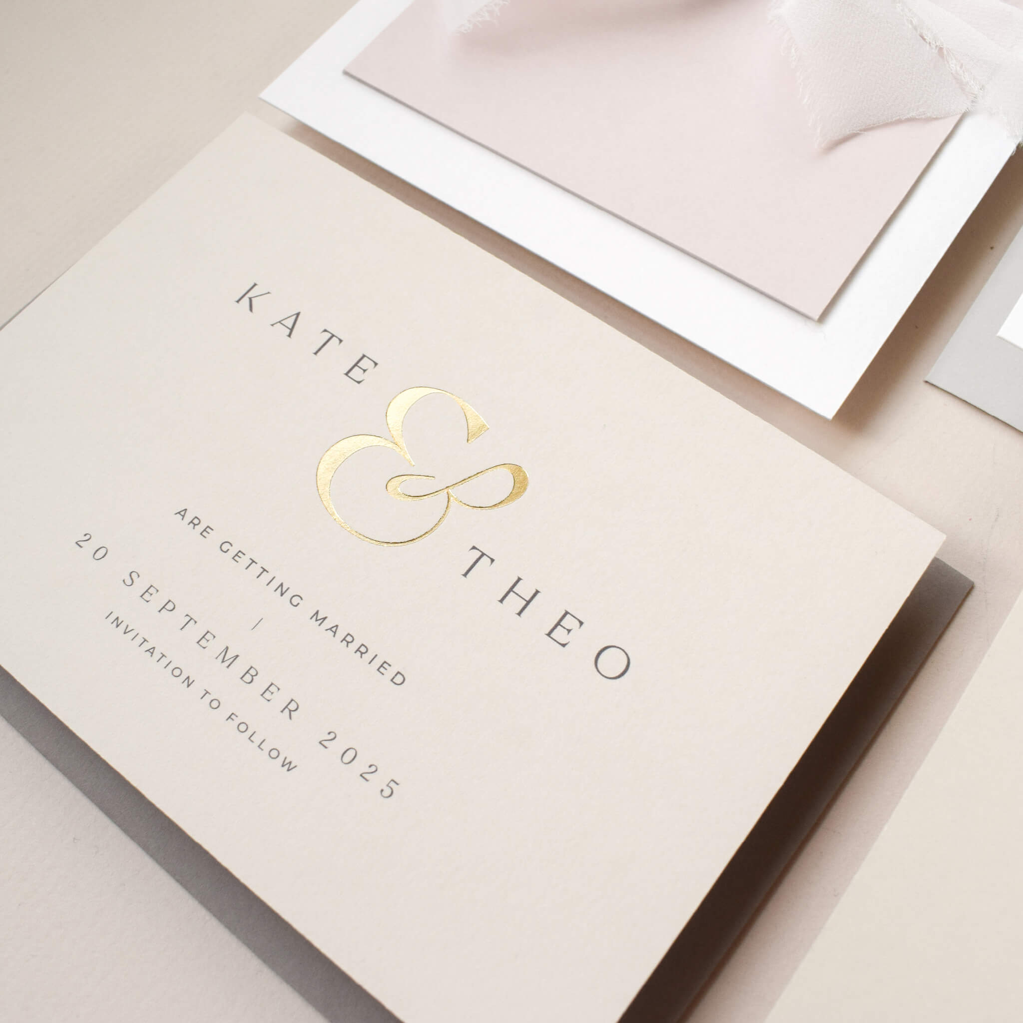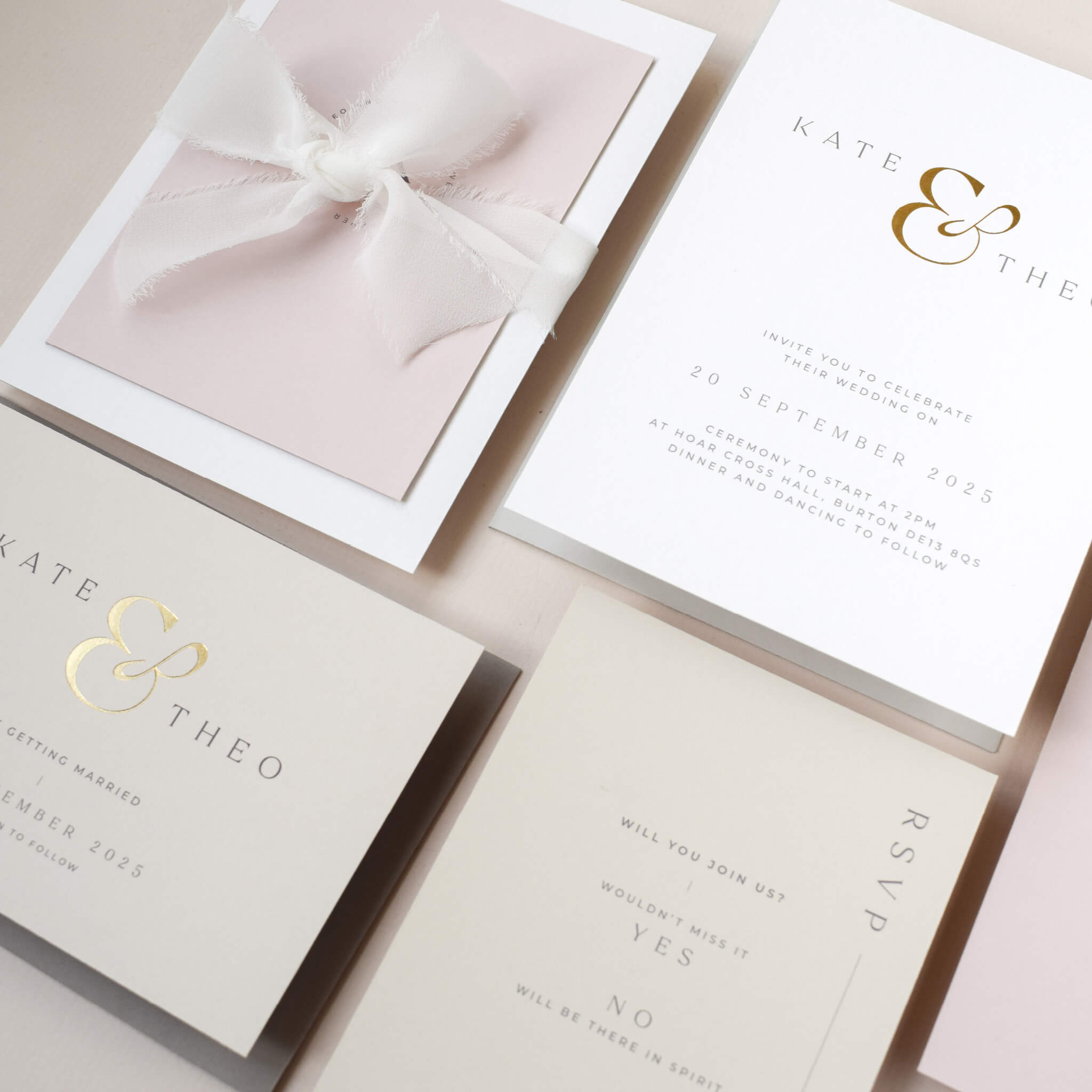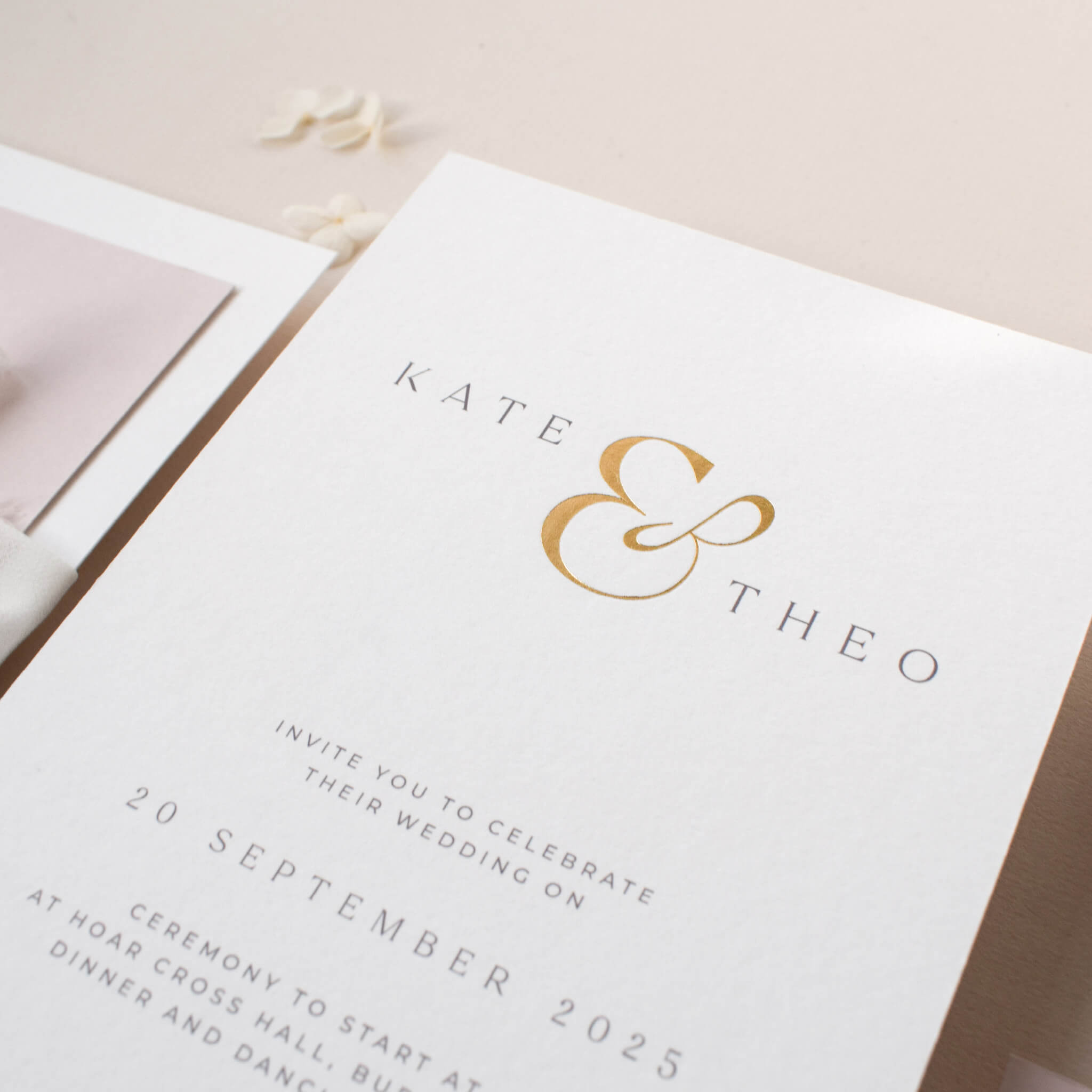 The Ampersand collection is understated elegance at its absolute best, the minimalistic design of the suite is complimented perfectly by an exquisite ampersand, which has been brought to life with gold foil. The combination of modern typography, white space and classic design give each element a feeling of grace and quiet dignity.