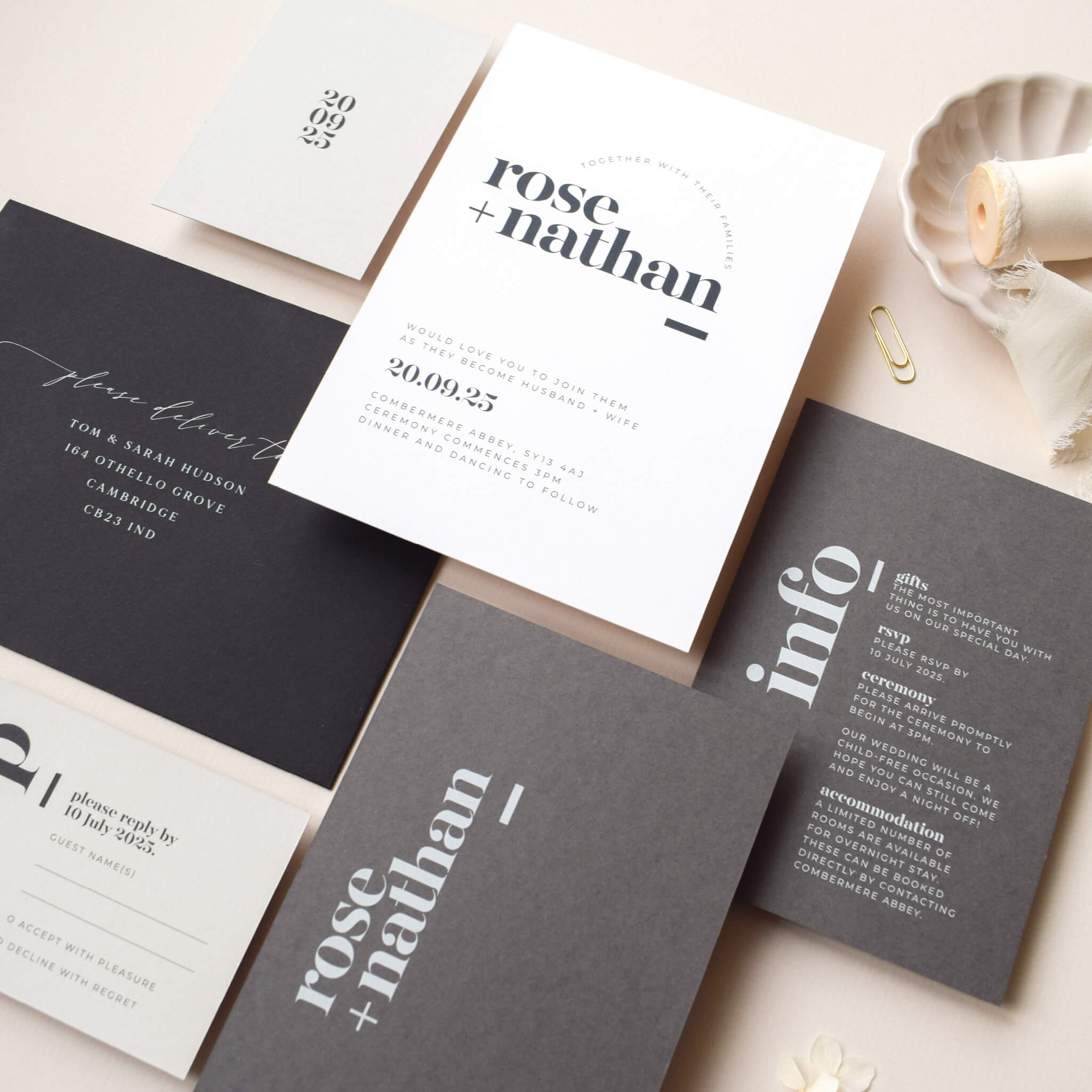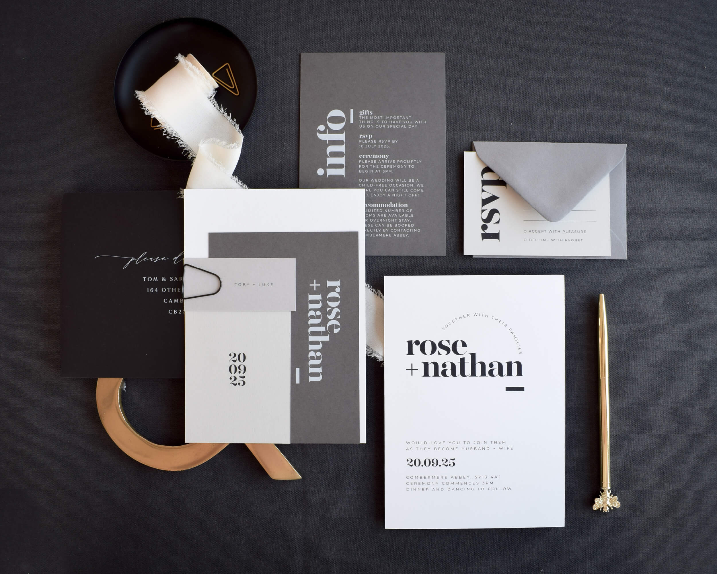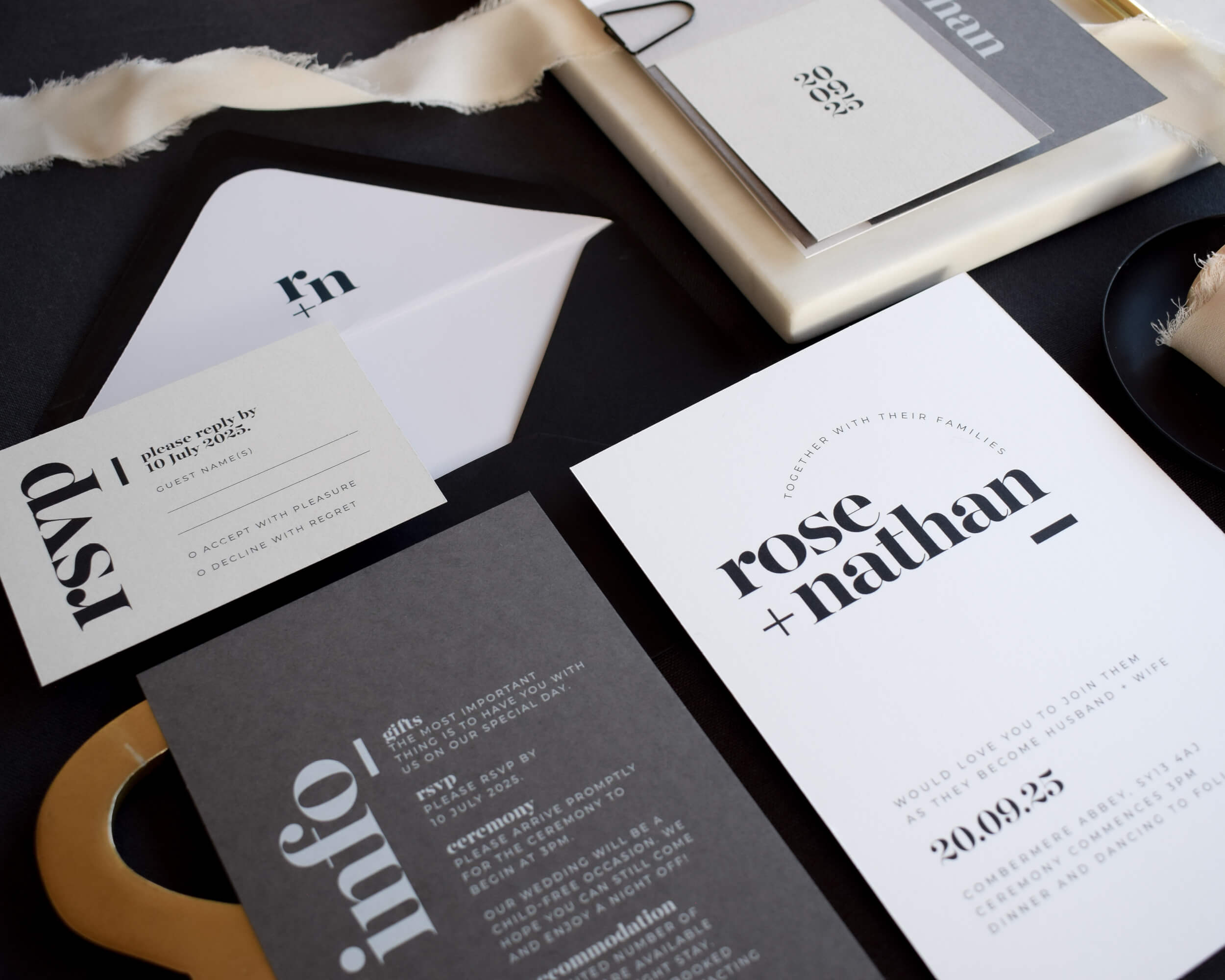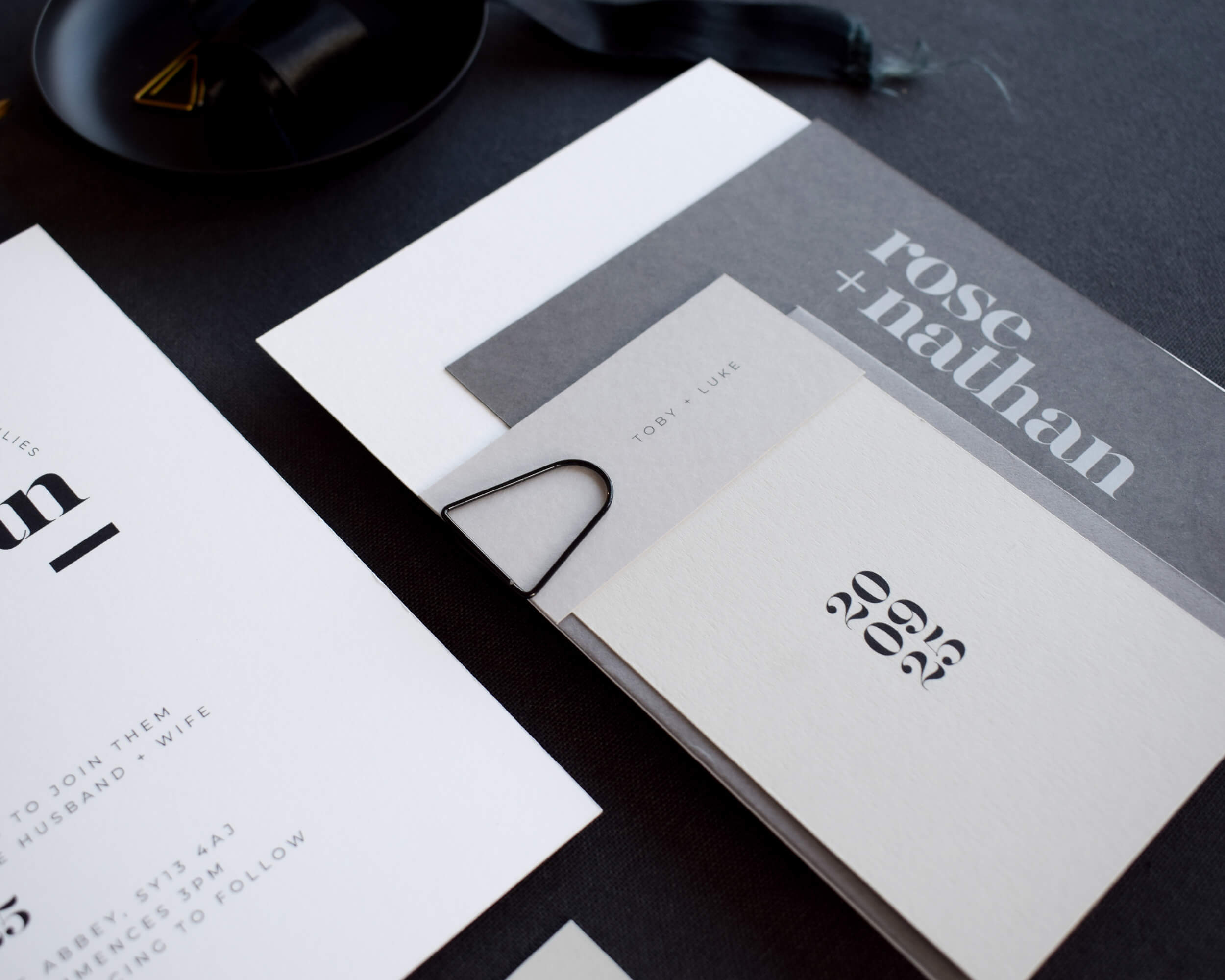 The Equinox is not for the faint of heart. Combining bold typography and a monochromatic colour scheme this modern wedding suite for design conscious couples is moving and memorable. Each aspect has been perfectly and precisely aligned for perfect assembly, allowing your guests to reveal each element piece by piece.