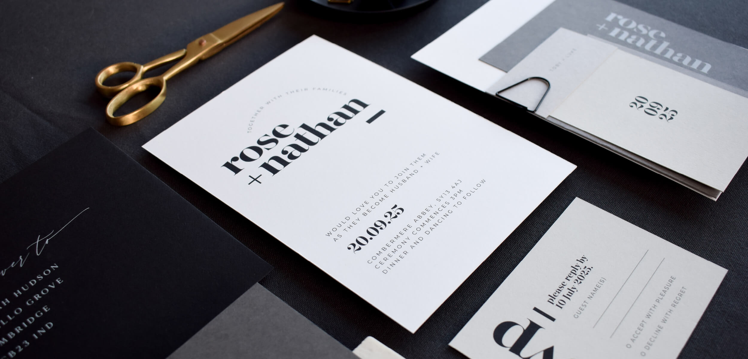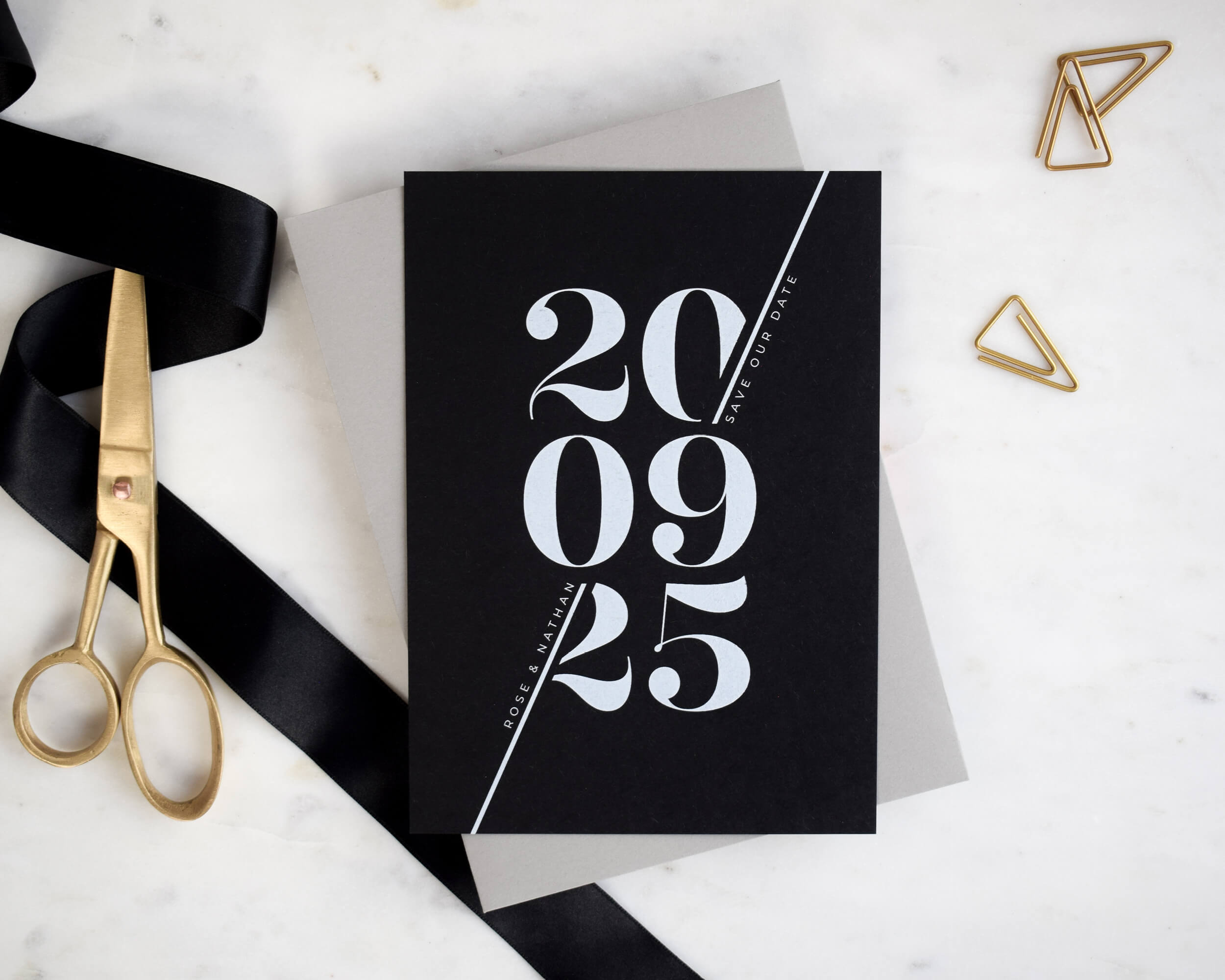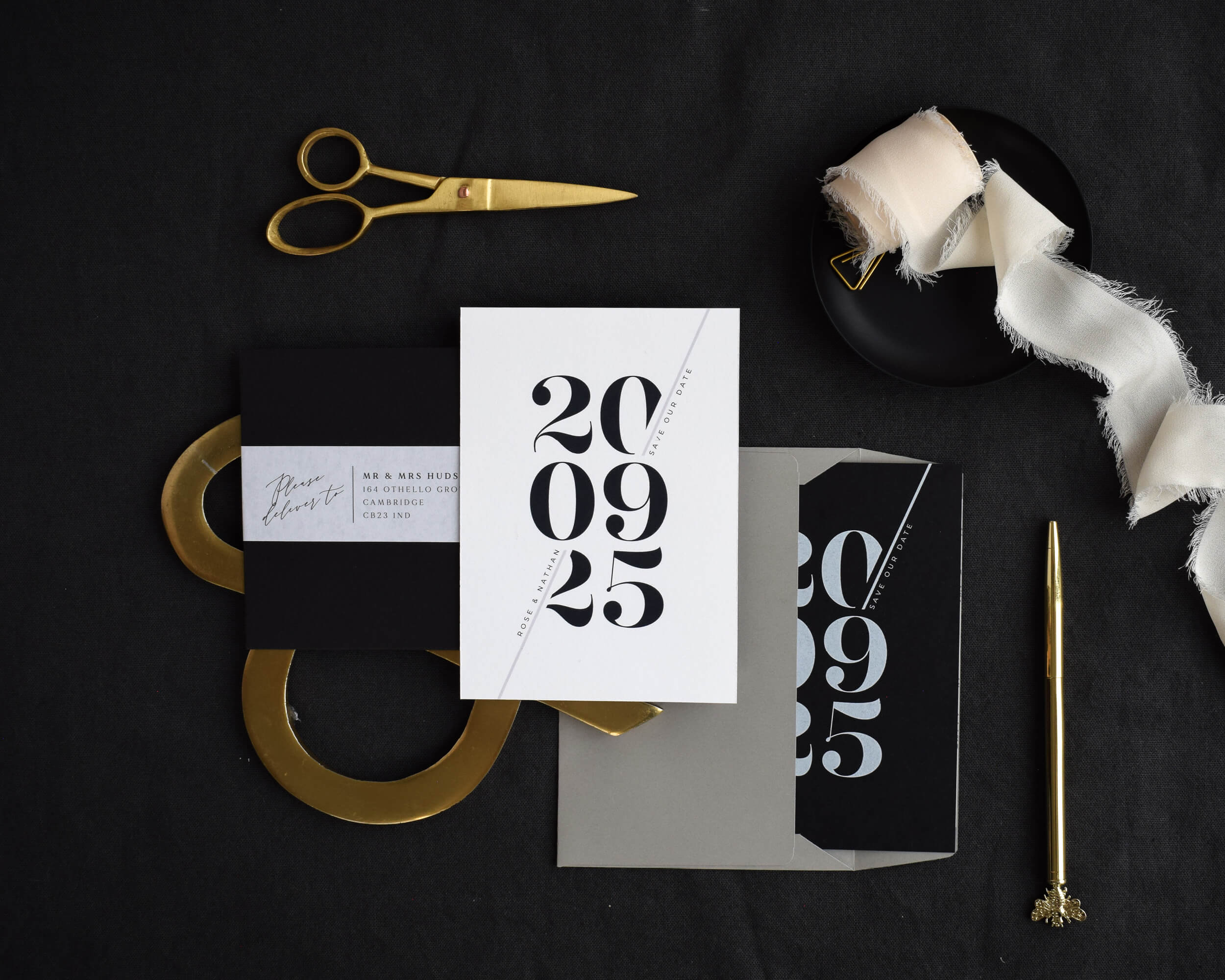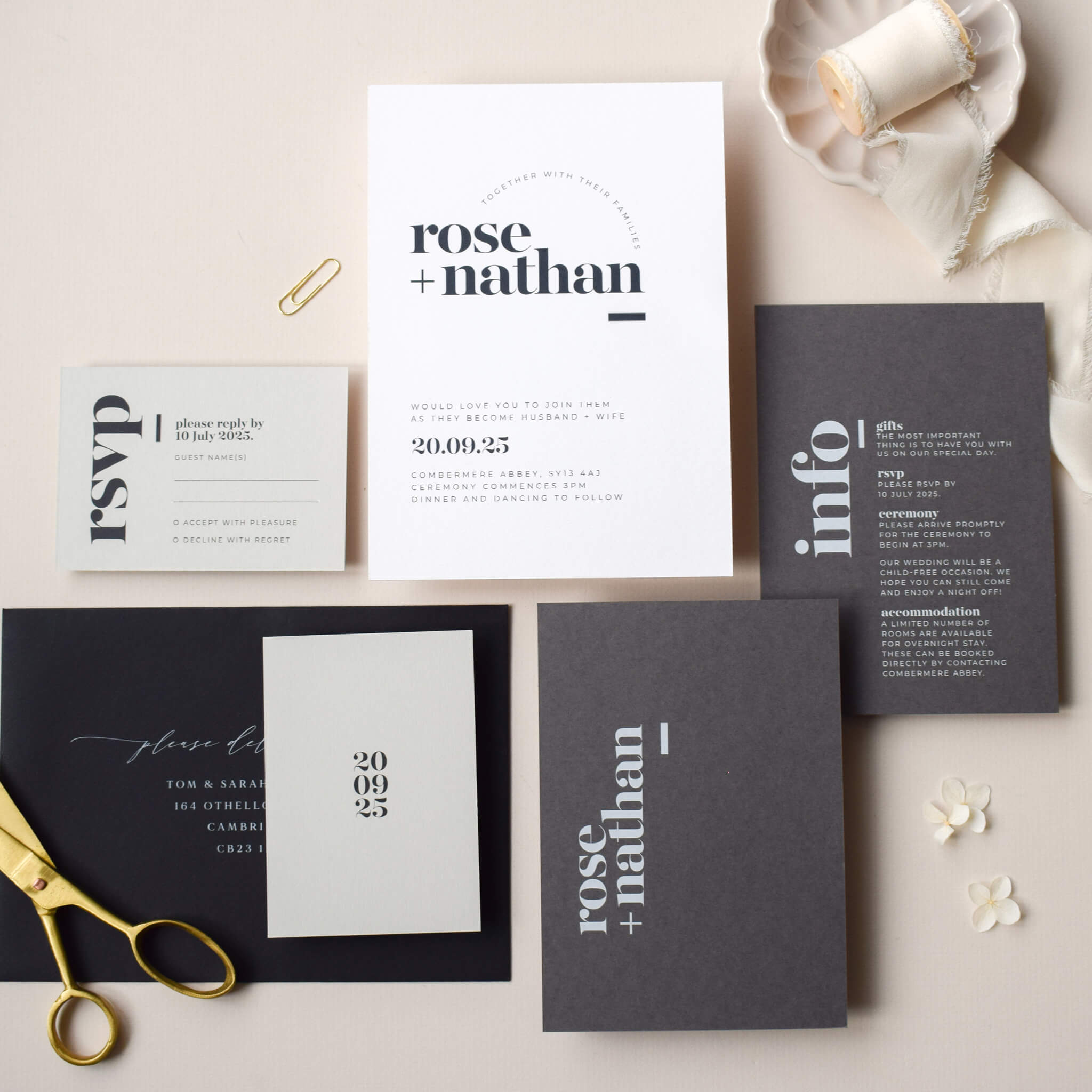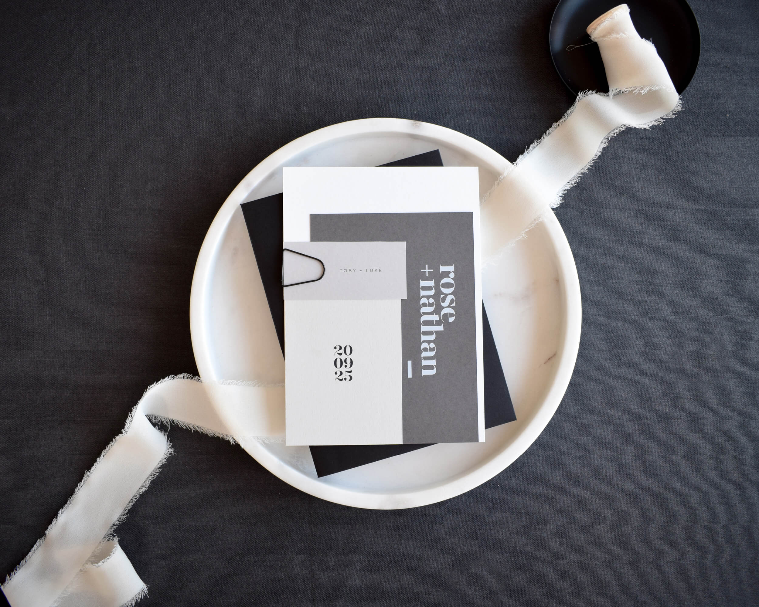 The Equinox is not for the faint of heart. Combining bold typography and a monochromatic colour scheme this modern wedding suite for design conscious couples is moving and memorable. Each aspect has been perfectly and precisely aligned for perfect assembly, allowing your guests to reveal each element piece by piece.