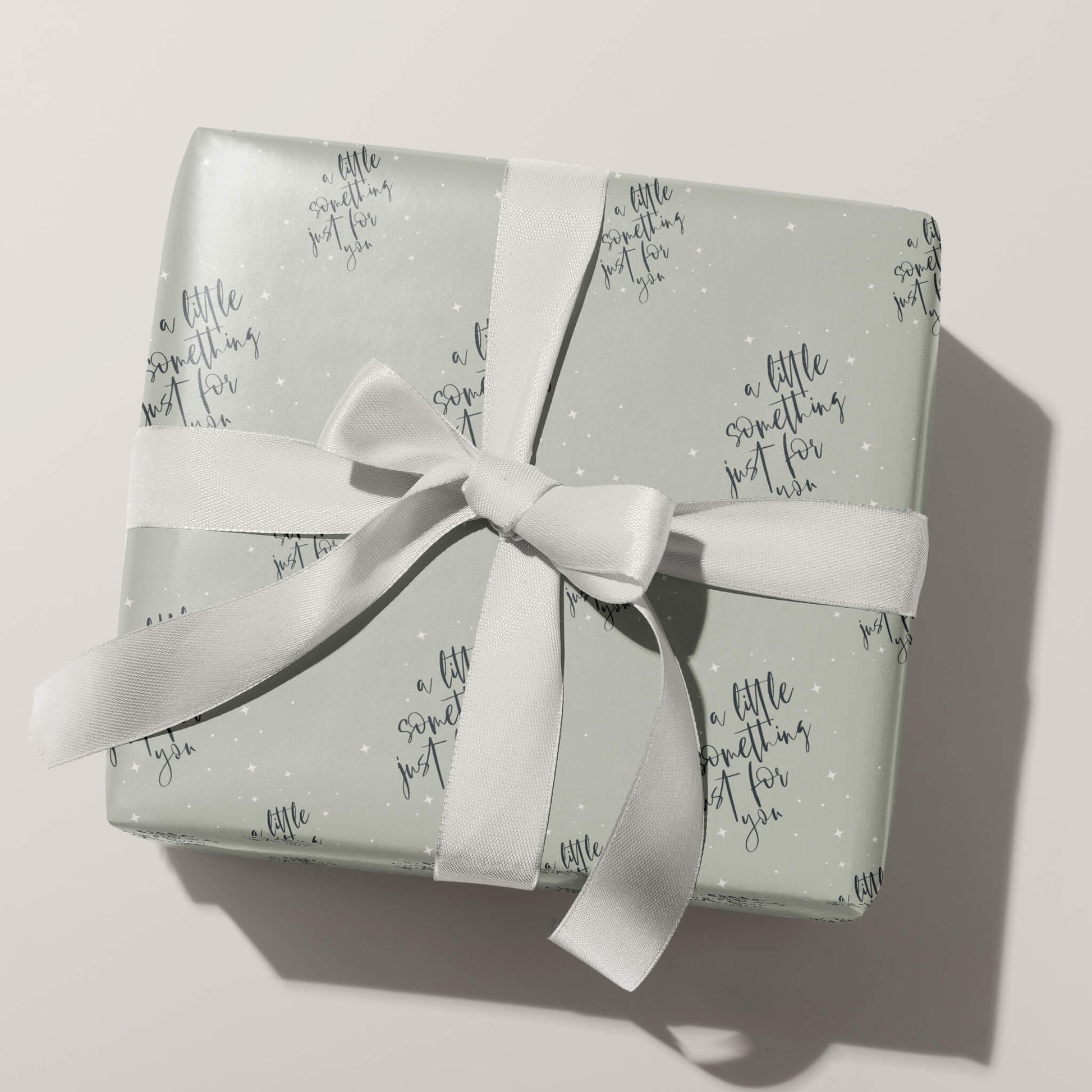 Two sheets of luxury gift wrap featuring the words ‘A little something just for you’ in a beautiful calligraphy style, surrounded by stars and printed on a sage green colour background. This wrapping paper is printed on thick premium matte paper which can be re-used or recycled.
