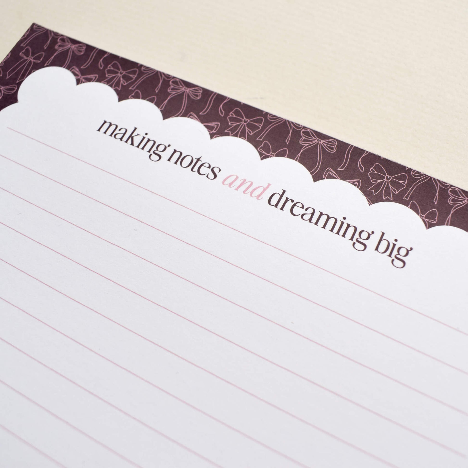 The perfect balance of style and function, this A5 notepad makes everyday note-taking a joy. Designed with a rich plum scallop border, soft pink bows and 50 pages of smooth white paper, it brings a feminine touch to your desk. Each page is lined in pink for neat note-taking, topped with the uplifting header “making notes and dreaming big.” Compact yet practical, this pretty notepad is ideal for writing lists, capturing ideas or adding a little luxury to your stationery collection.