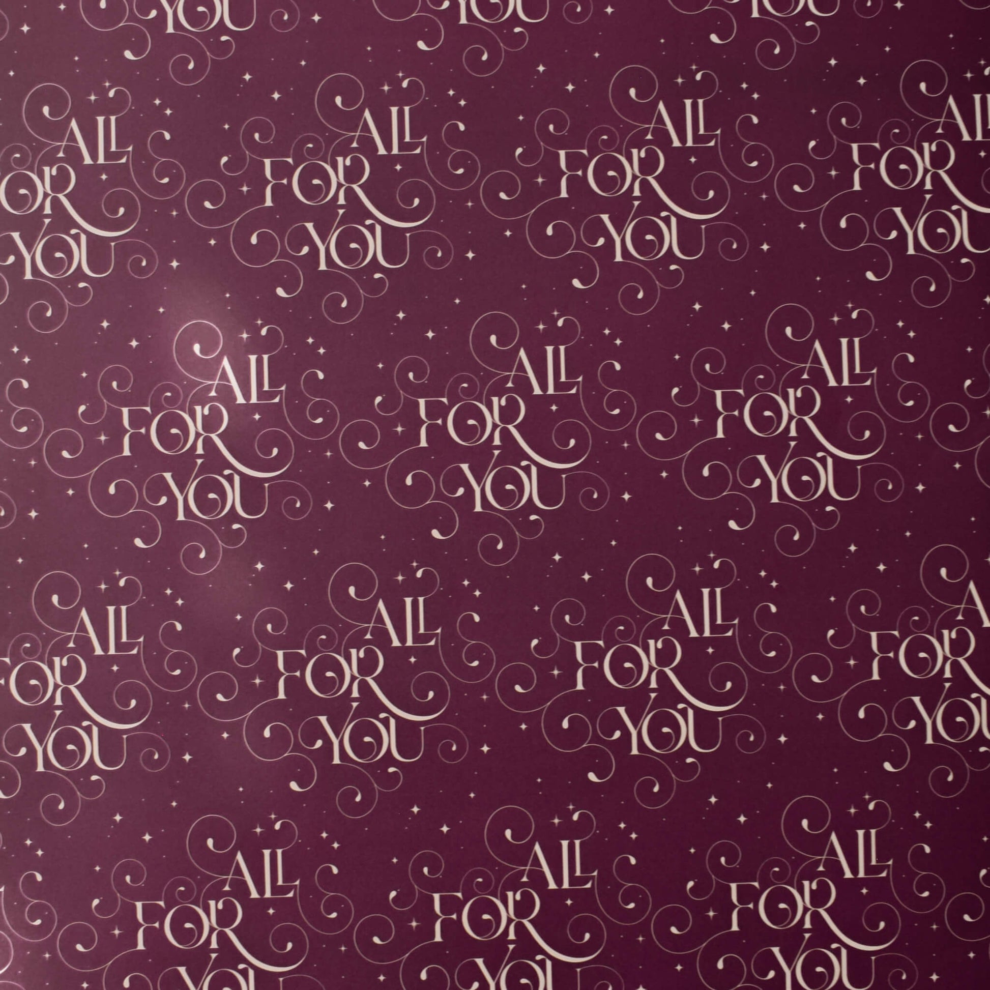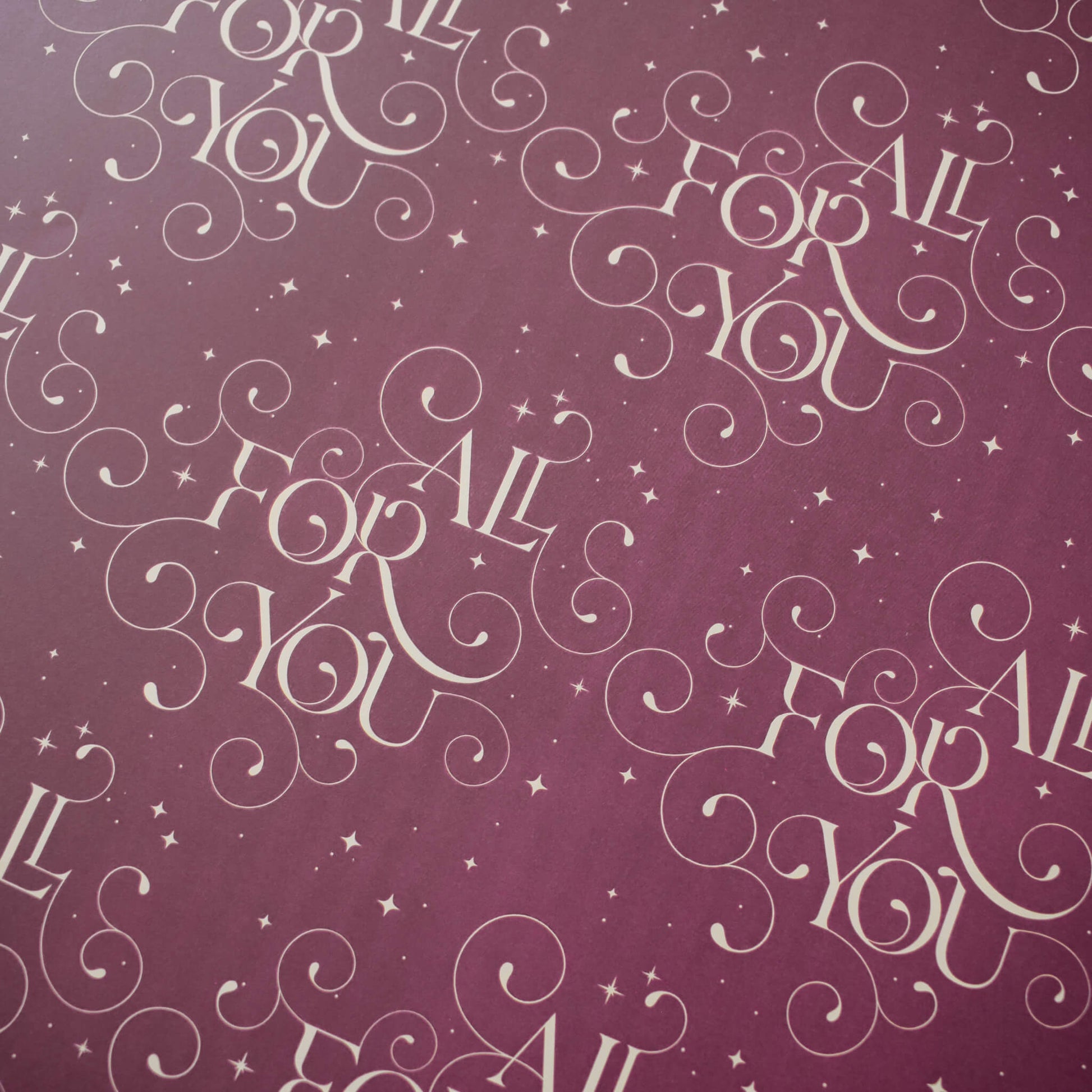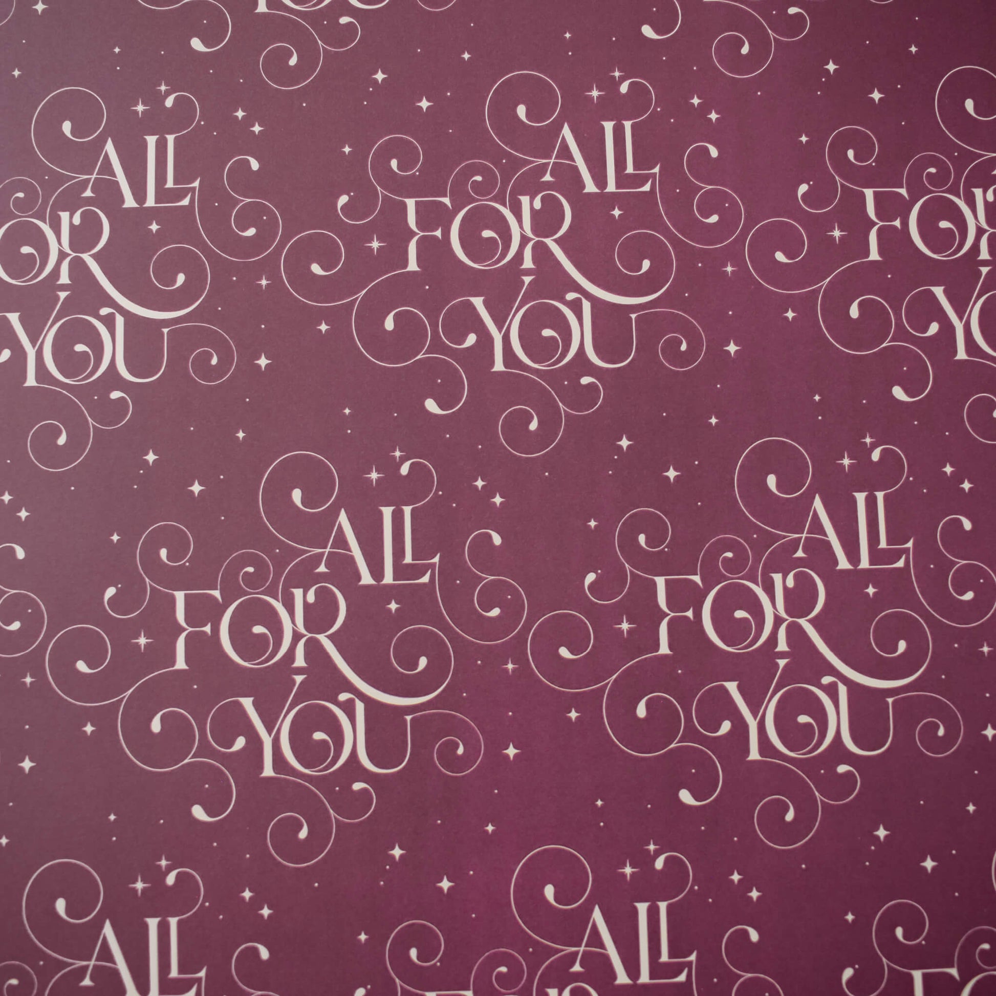 Two sheets of luxury gift wrap featuring the phrase ‘All For You’ in an elegant typographic design with delicate flourishes. The design is printed in a soft camel tone on a rich burgundy background, creating a timeless and stylish look.