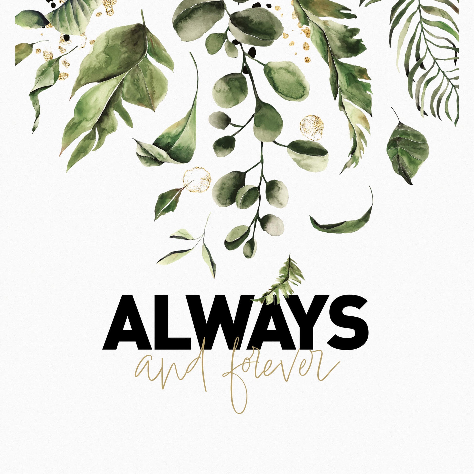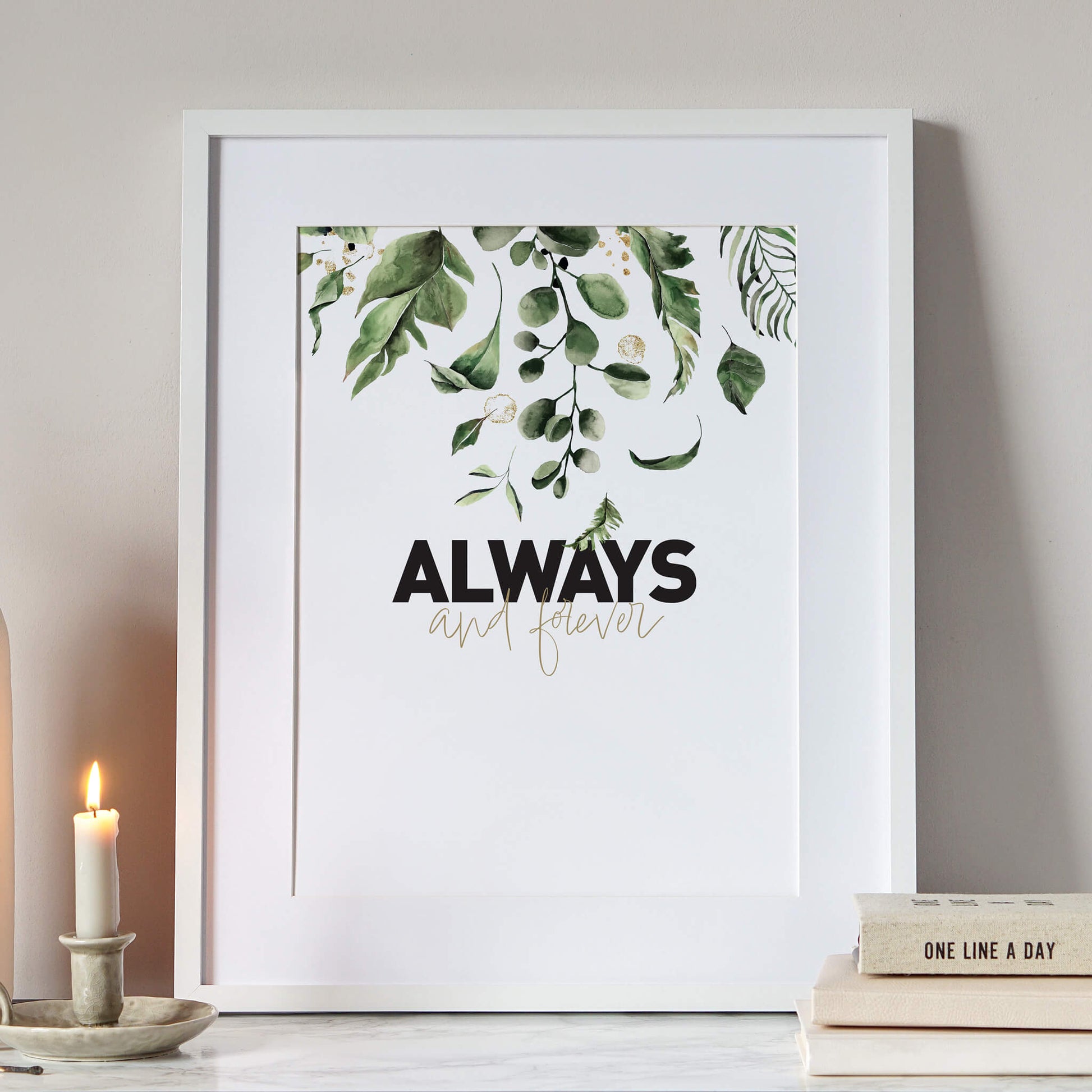 This botanical print feature the words 'Always and Forever'underneath a selection of exquisite painterly green leaves that are falling delicately from the top of the page.
