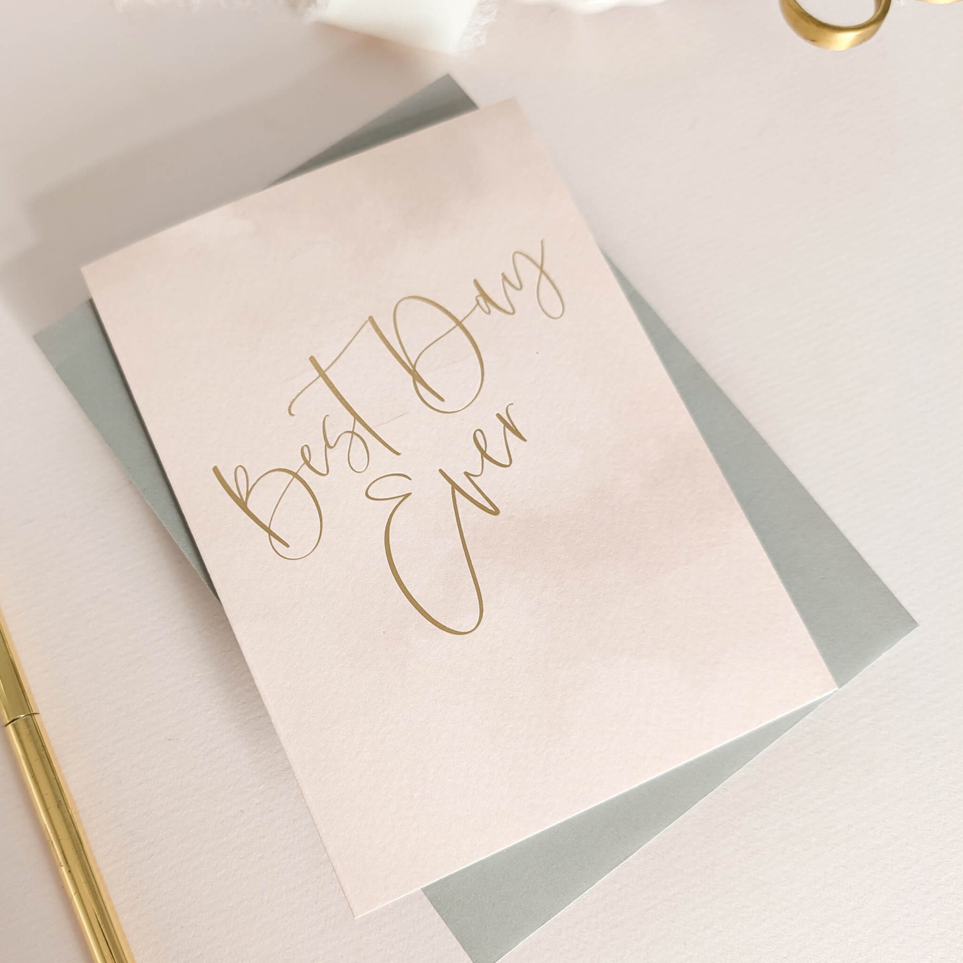 This luxury greetings card features the words 'Best Day Ever' in modern, beautiful calligraphy, printed in exquisite gold foil onto a warm beige, textured painted-style background. Designed to celebrate life’s most memorable moments, this elegant card is perfect for weddings, anniversaries, engagements, or milestone birthdays.