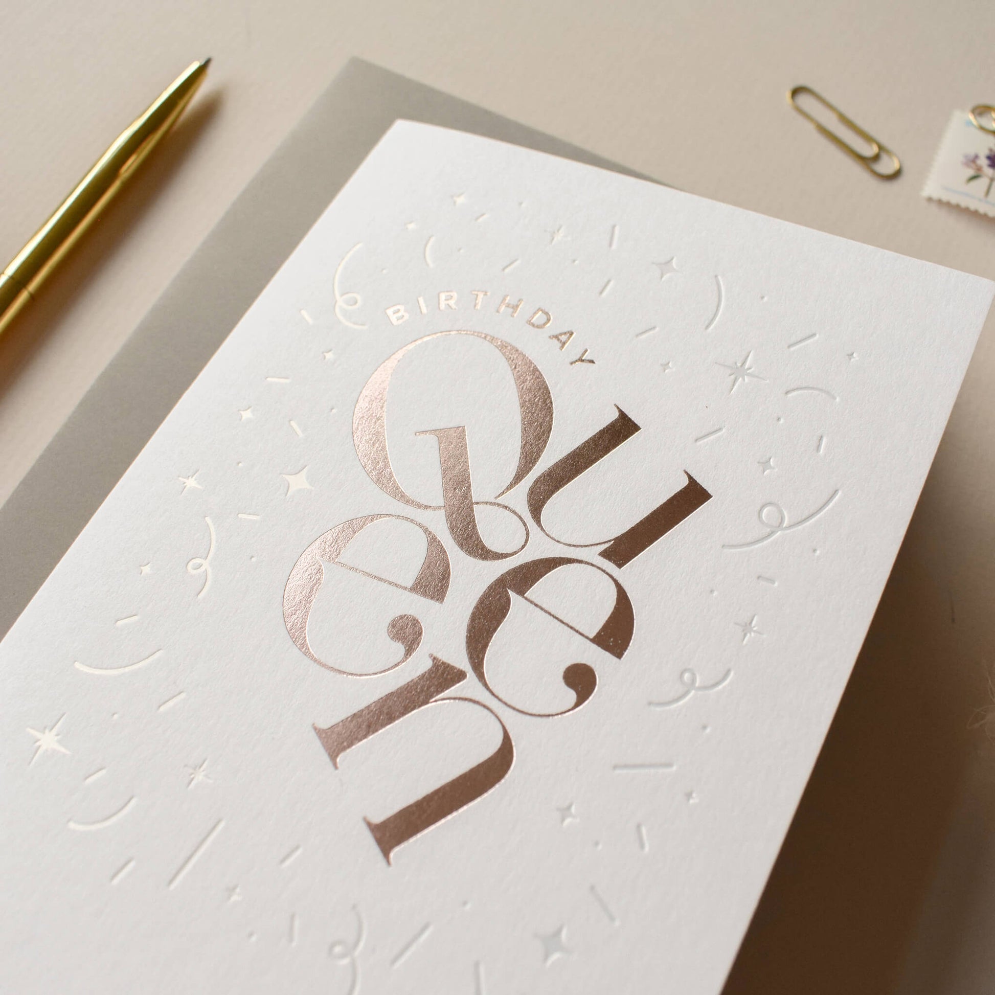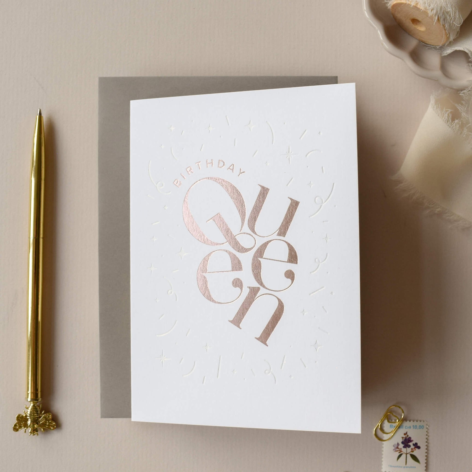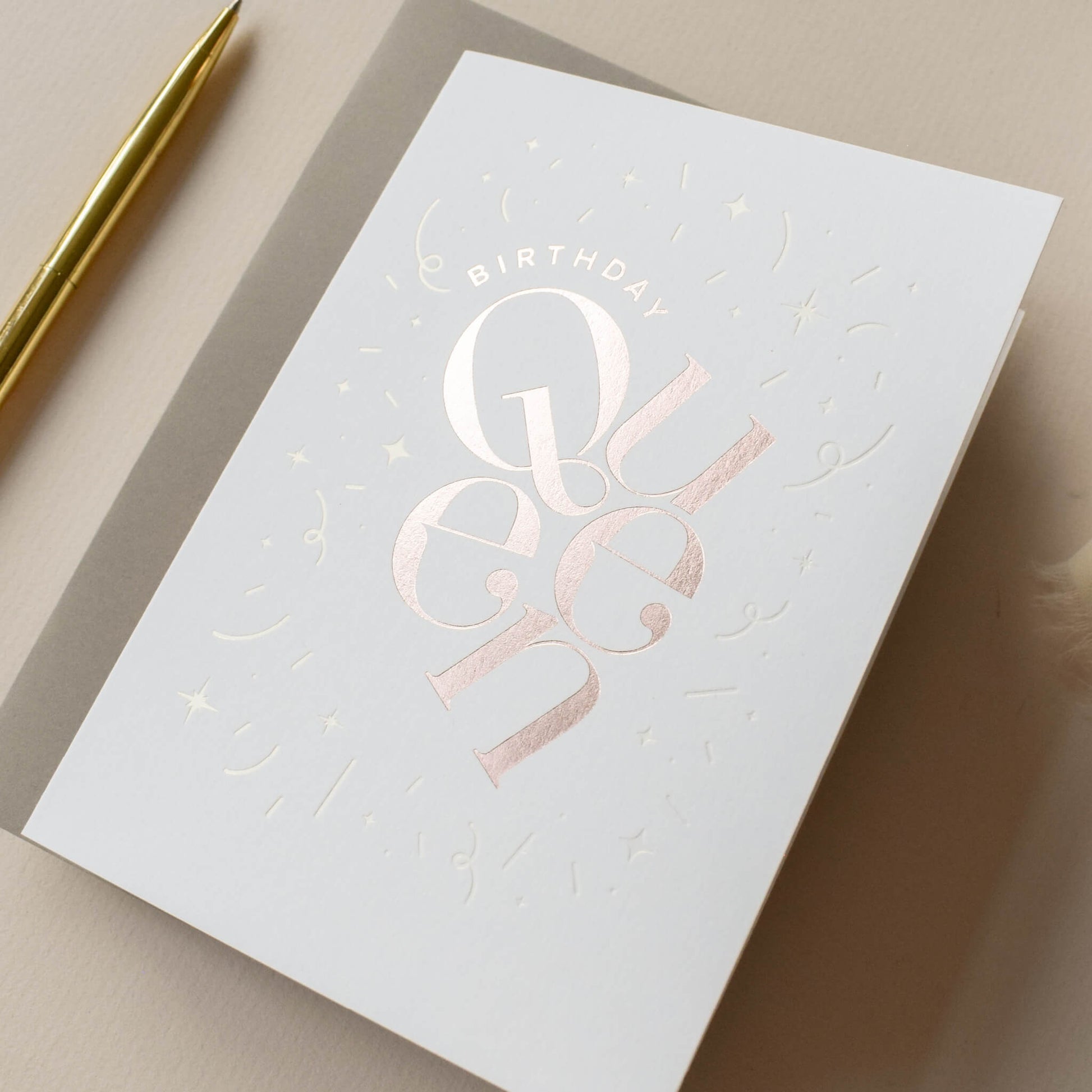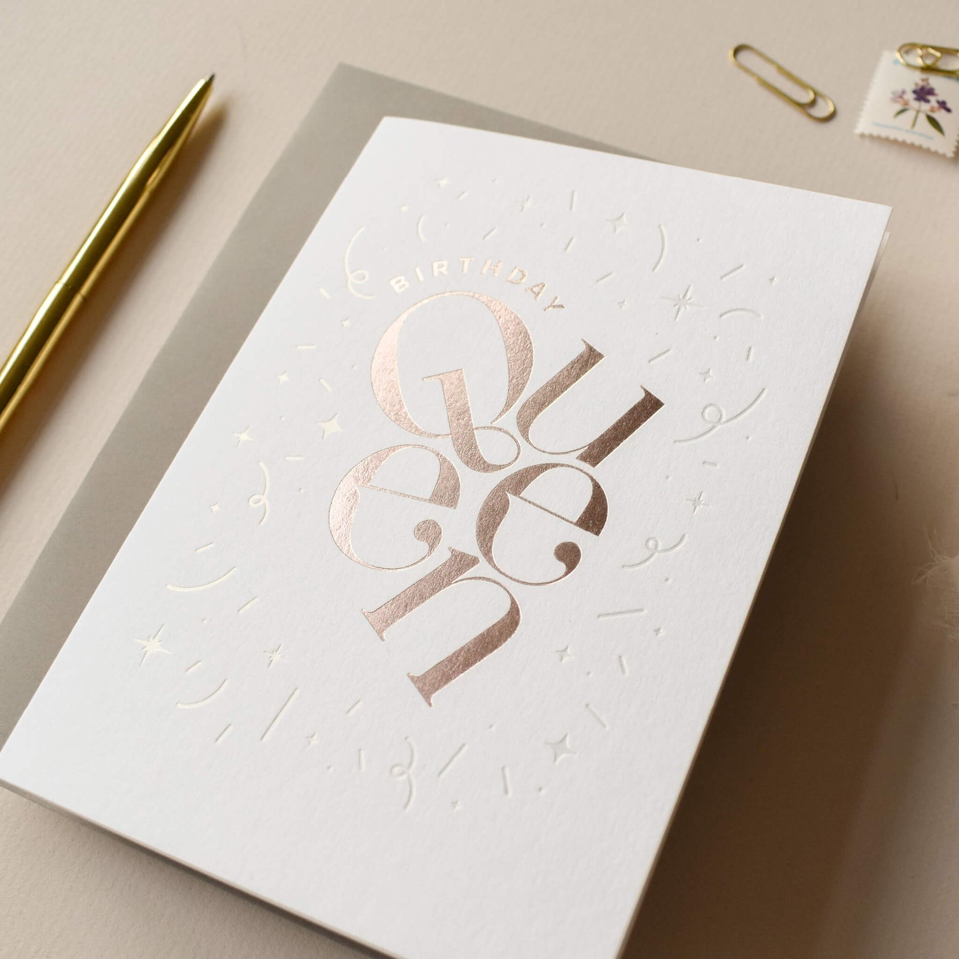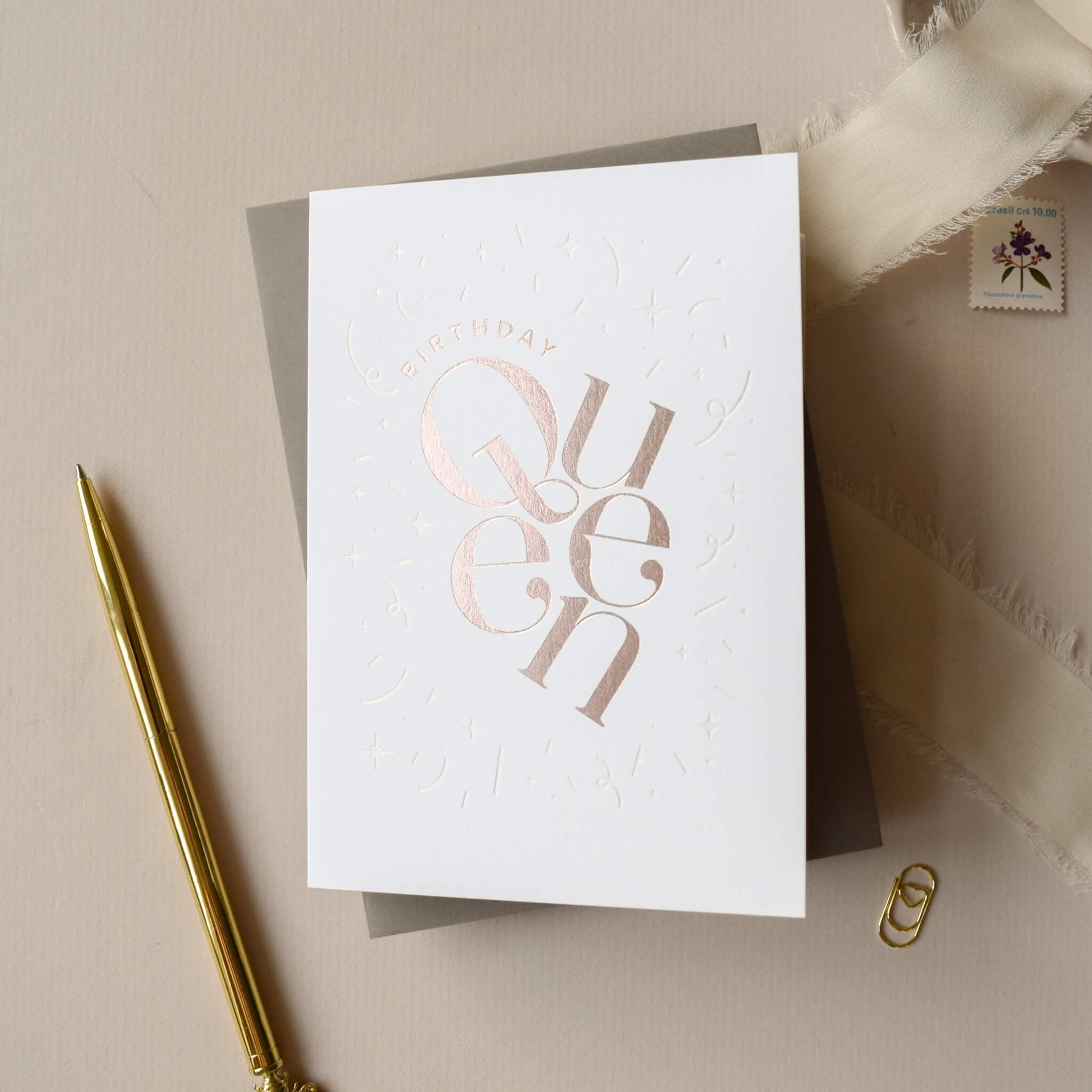 Celebrate in style with this luxurious ‘Birthday Queen’ card. Featuring a bold, modern typographic design in printed in premium metallic rose gold foil. The text is surrounded by a cascade of stars and confetti printed in soft pearlescent foil for extra sparkle. Printed on beautifully thick, high-quality paper, it’s a show-stopping card fit for a queen, it's guaranteed to make her day.