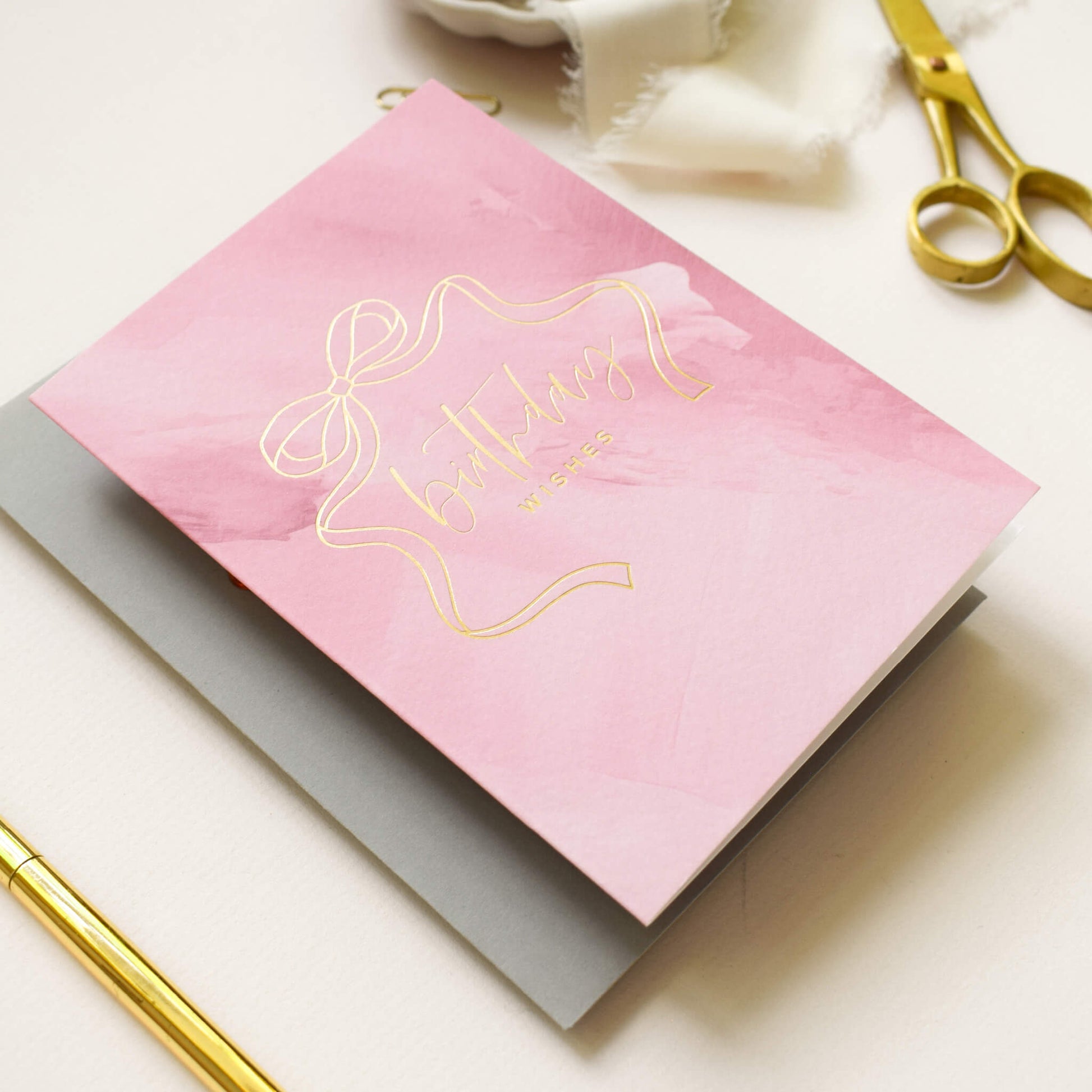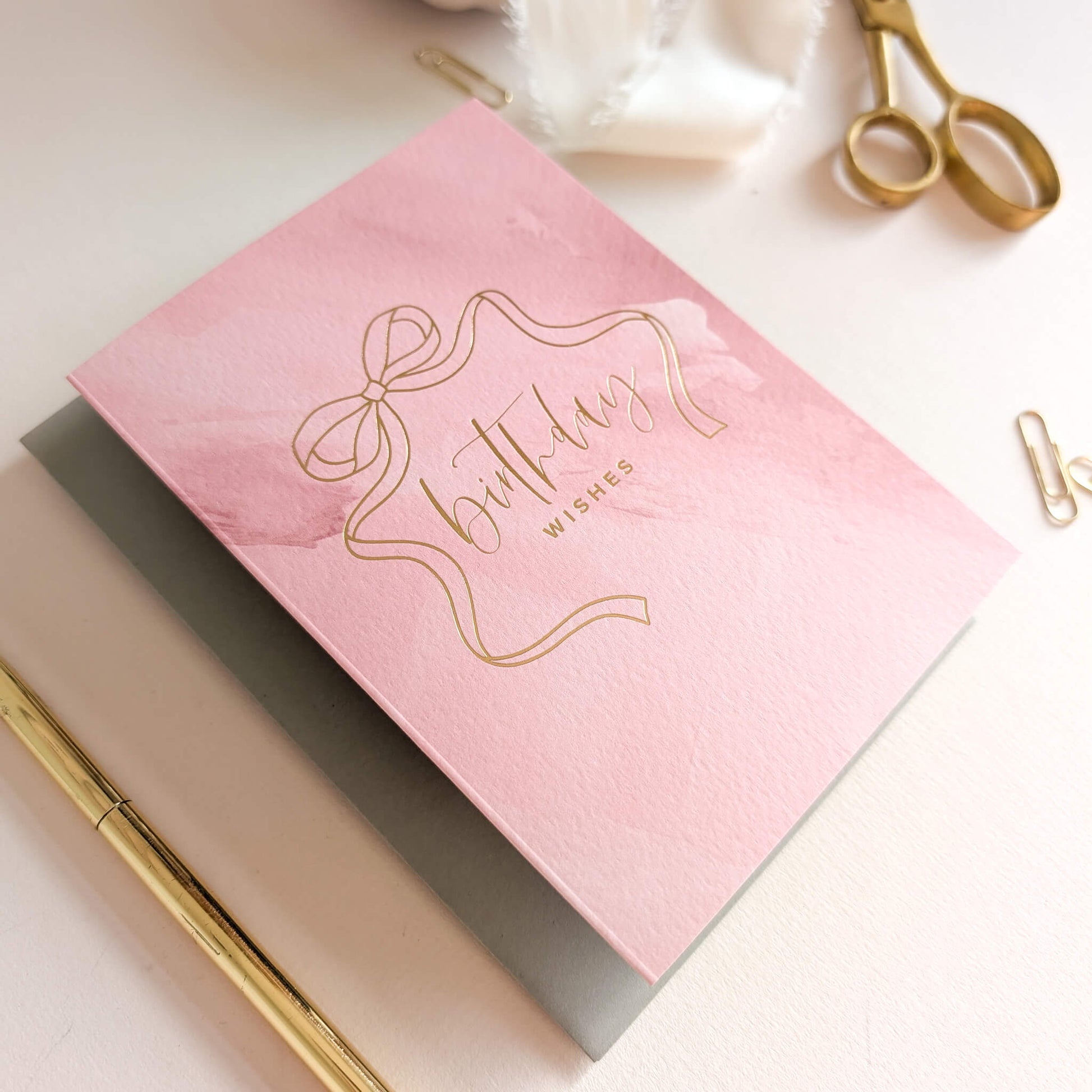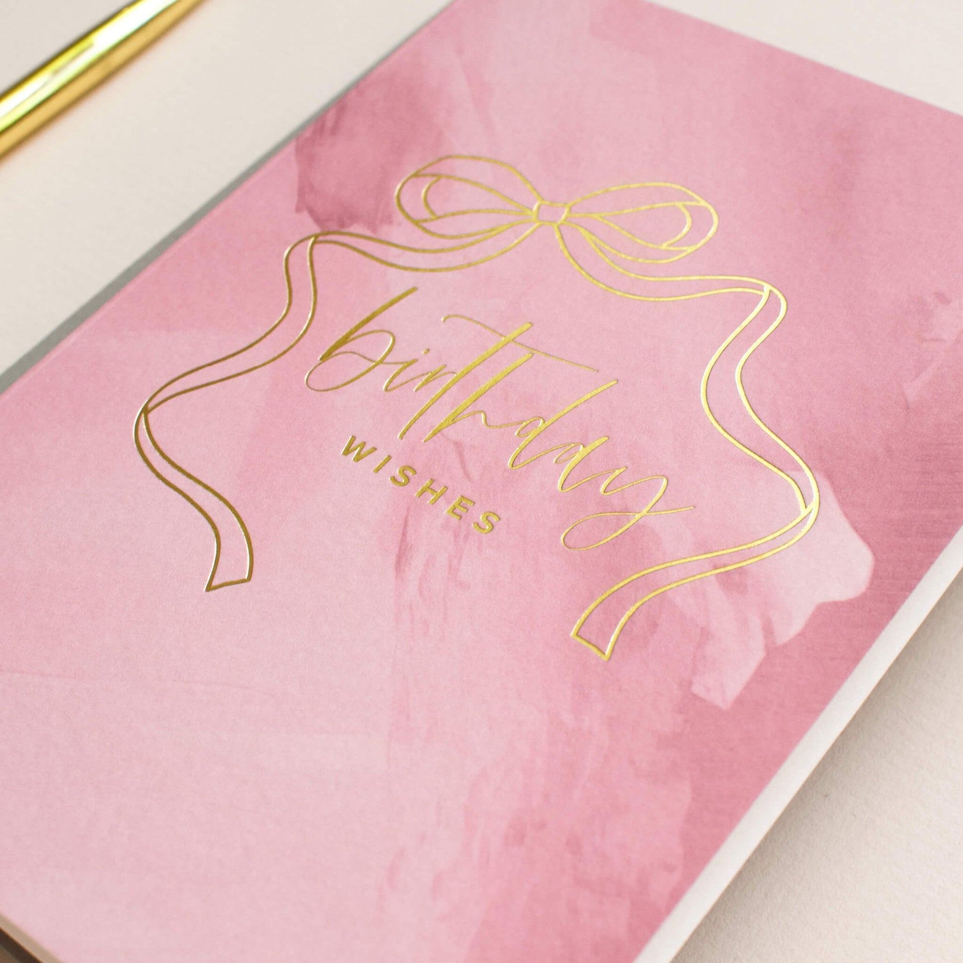 This elegant 'Birthday Wishes' card features a pale pink painted-style background, topped with a striking gold foil bow and hand-lettered calligraphy text. The bouncy, modern lettering style paired with the shimmering foil detail makes this a playful yet luxurious way to celebrate a birthday.