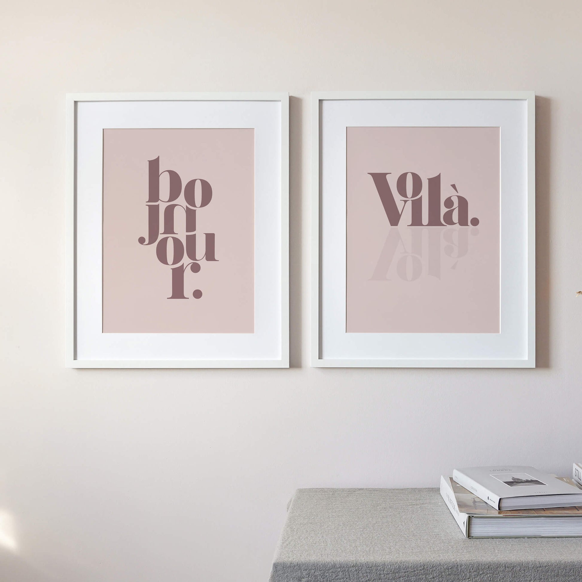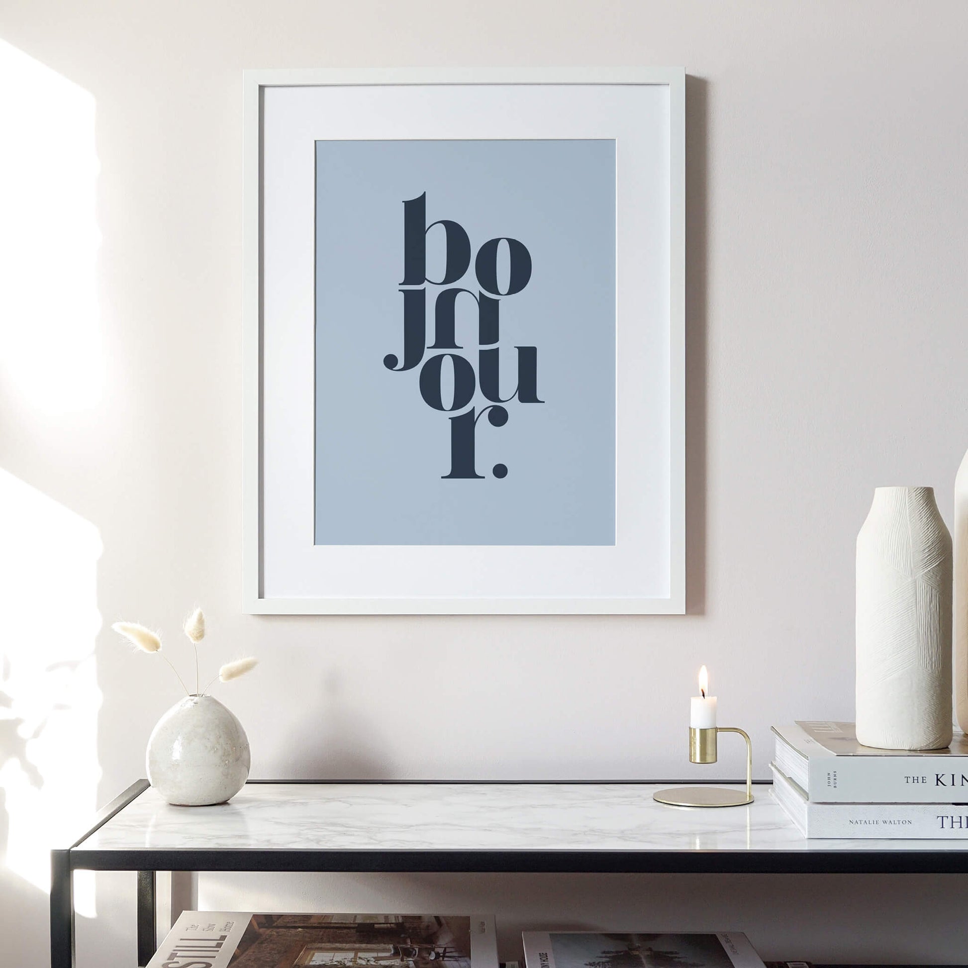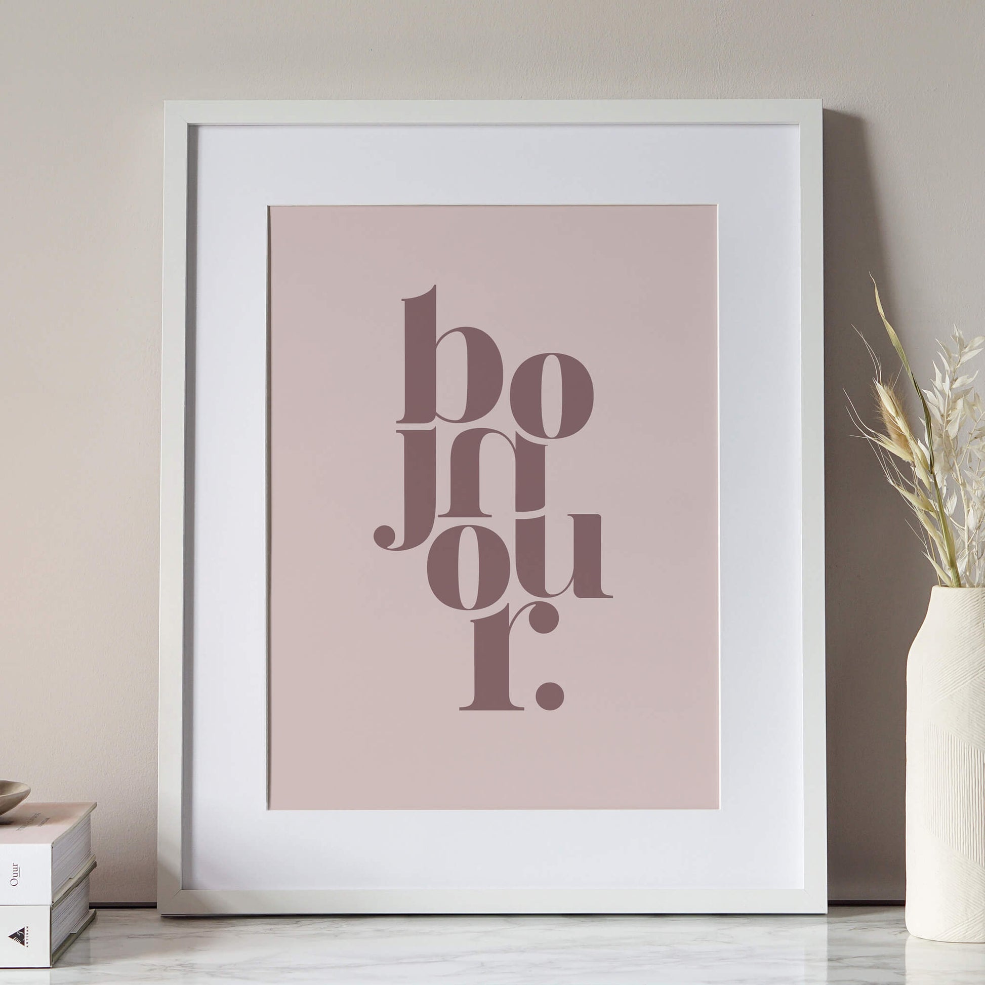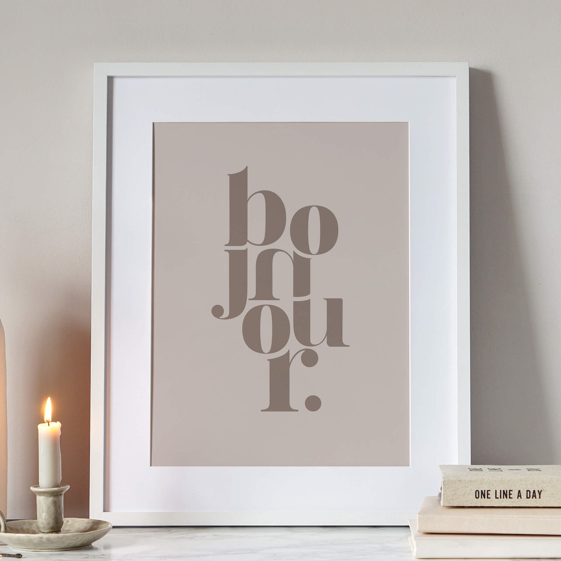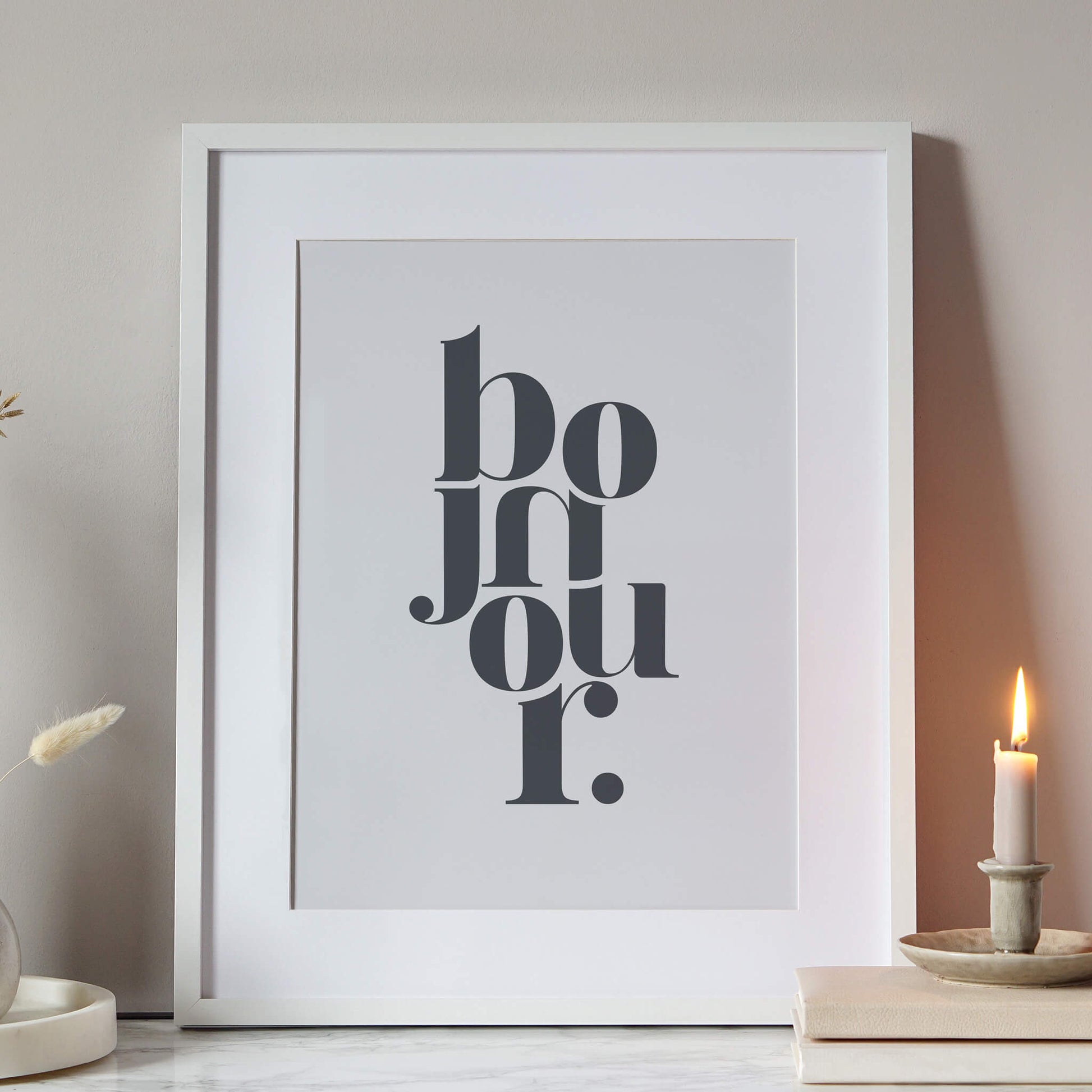 This Bonjour print is available in six stunning shades to ensure that there will be one that will match your home decor perfectly. All of the variations have a coloured background with a darker complimentary colour for the text.