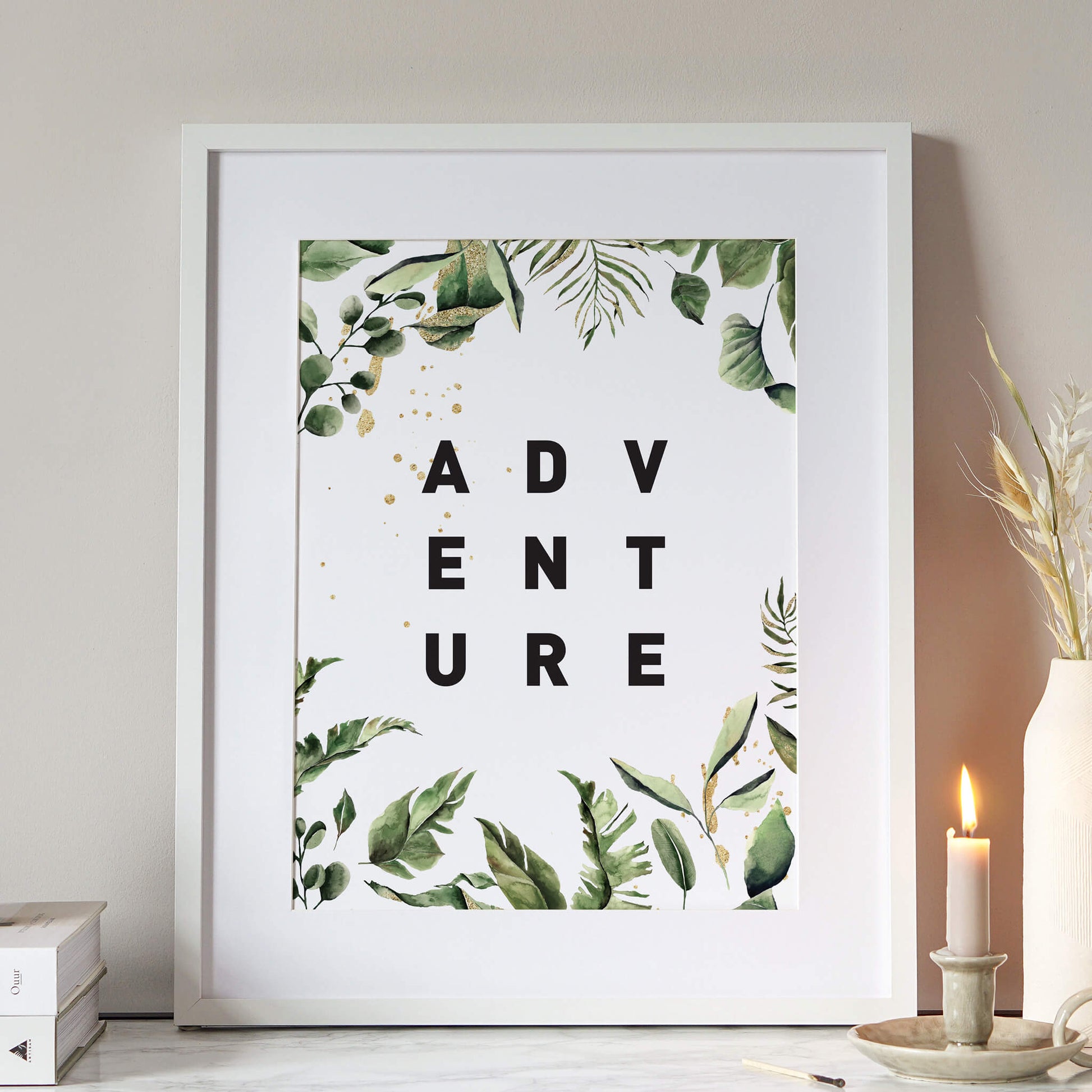 This luscious botanical adventure print is one from my jungle print collection. Combining bold typography with beautiful botanical leaves this print will help you create a sense of the wild outdoors inside your home in a glamorous way.