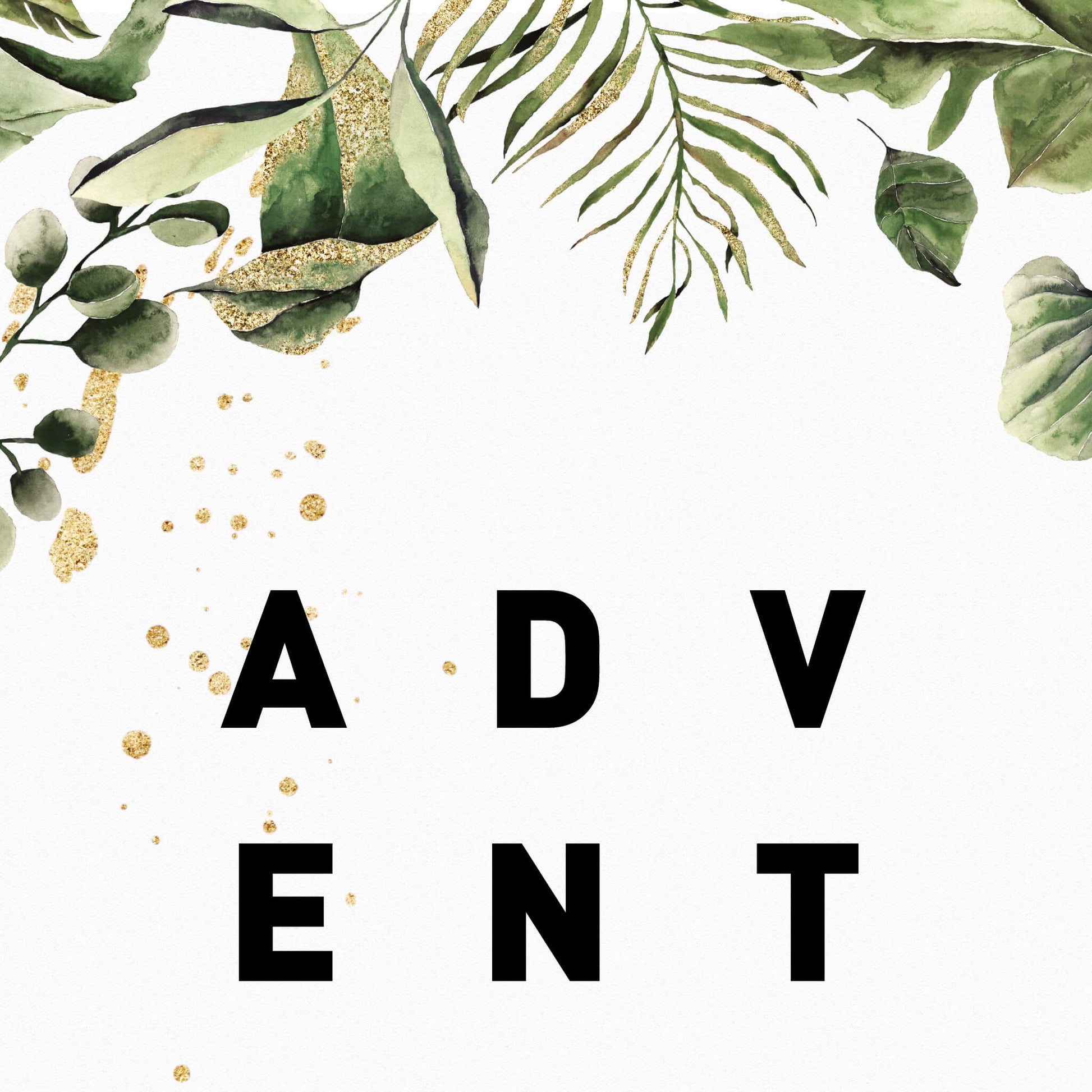 The leaves on this botanical adventure print were originally hand painted with watercolours before being digitised, adorned with delicate gold flecks and arranged into a delicate border to frame the text which has been set in the centre of the page. The word adventure has been broken up into three lines and has a lot of spacing between each letter which gives it a very graphical feel.