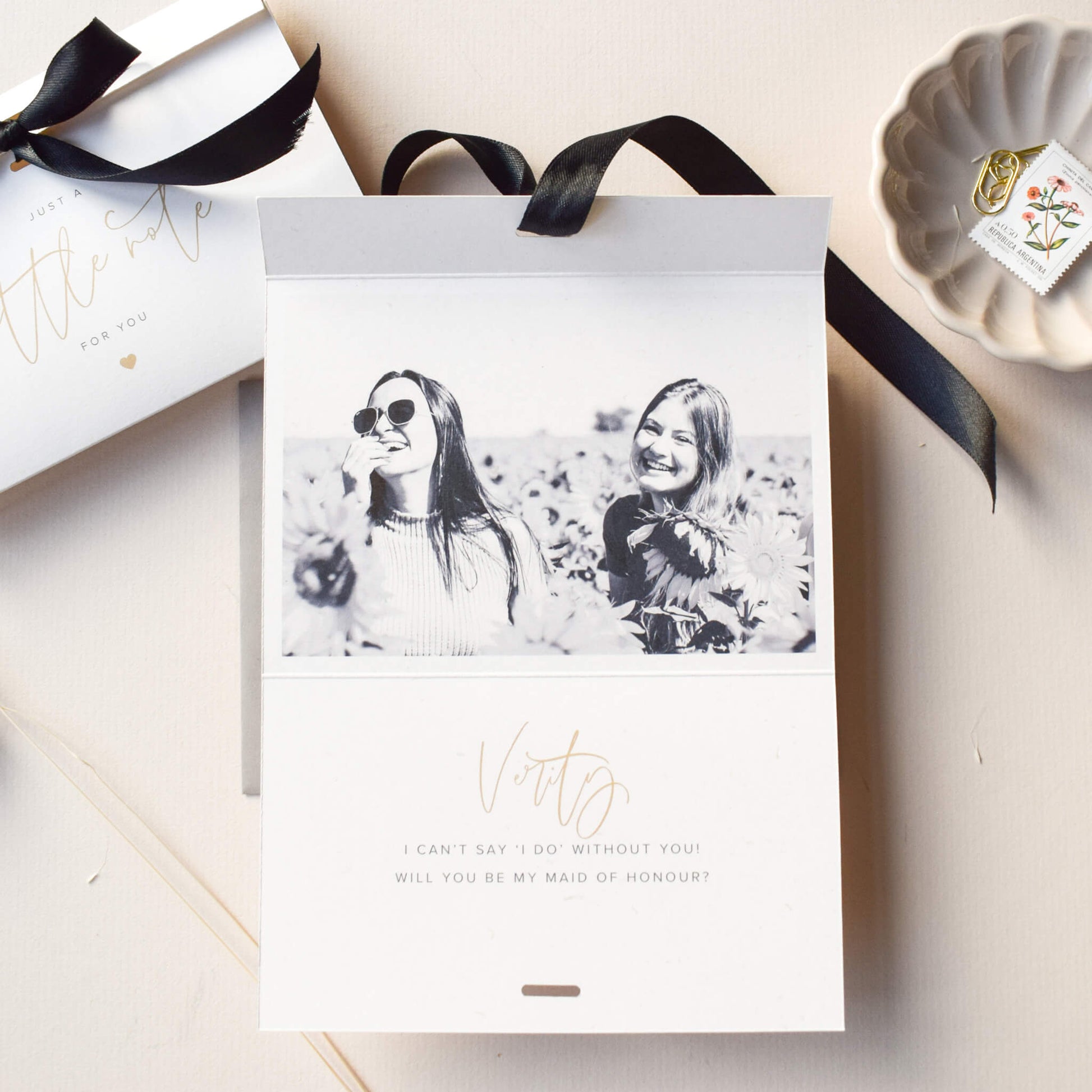 This personalised bridesmaid proposal card is designed to be a cherished keepsake, that will ensure you can ask that important question in style. The front of the card reads, "Just a little note for you". Your bride tribe just have to untie the elegant satin ribbon bow to reveal a black and white photo and your personalised message asking them to be a bridesmaid, maid of honour or flower girl.