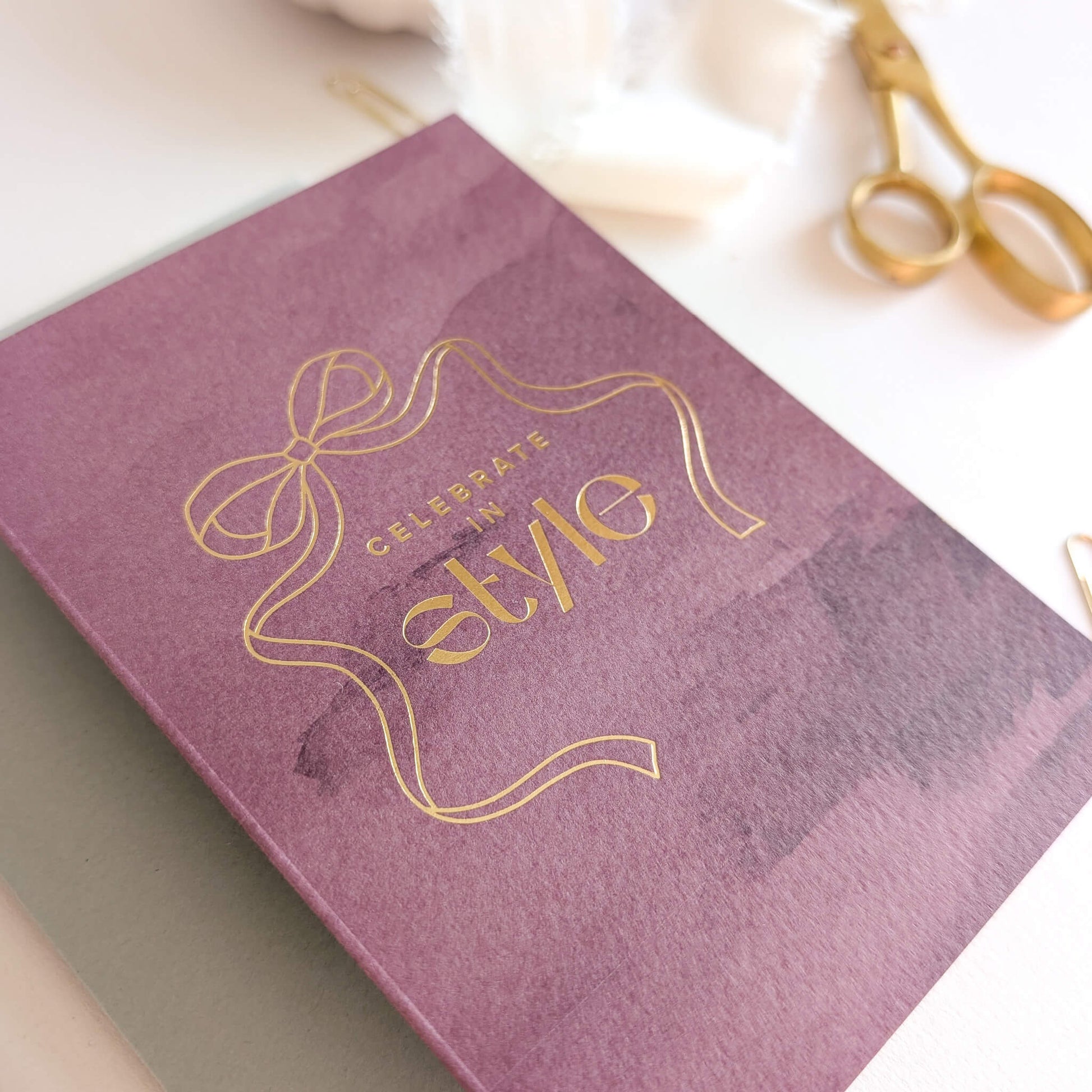 This luxury greeting card reads 'Celebrate in Style', with the word Style in a quirky, modern font for a fresh and distinctive look. A large shimmering gold foil bow sits above the text, giving the design an extra touch of glamour. The rich burgundy painted-style background makes the gold foil details pop, creating a bold and sophisticated card that’s perfect for marking special occasions.