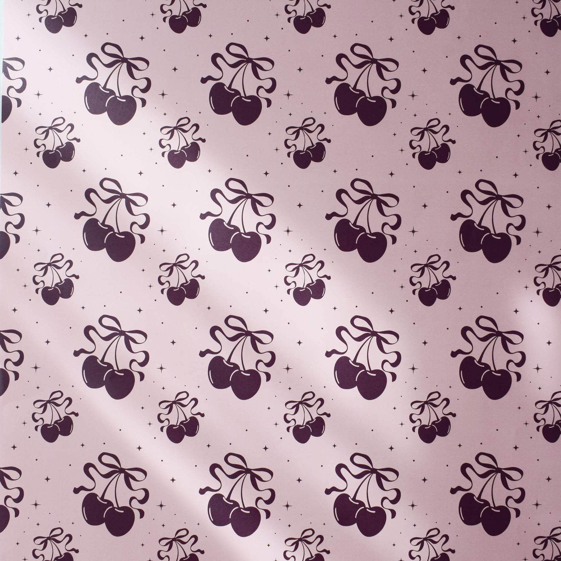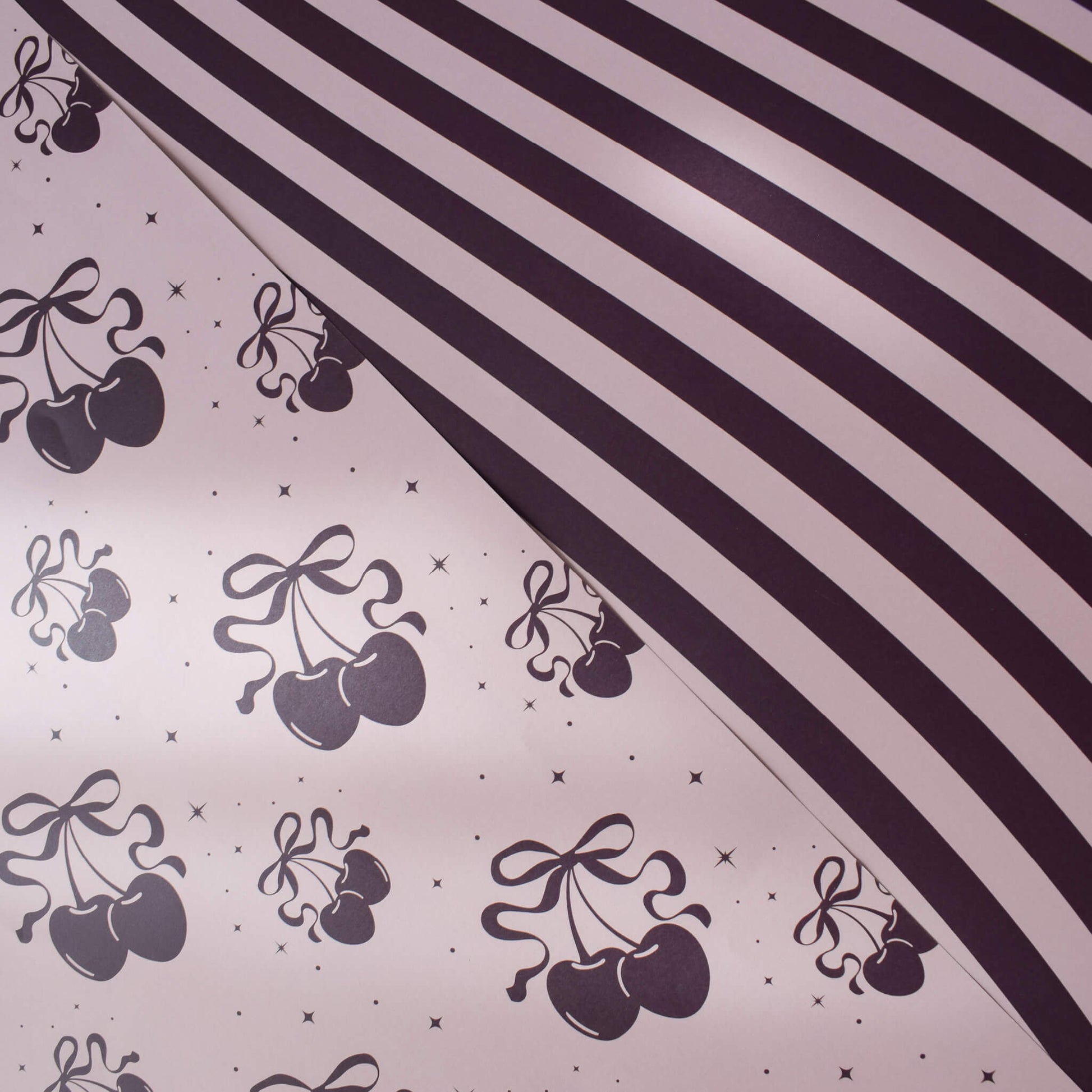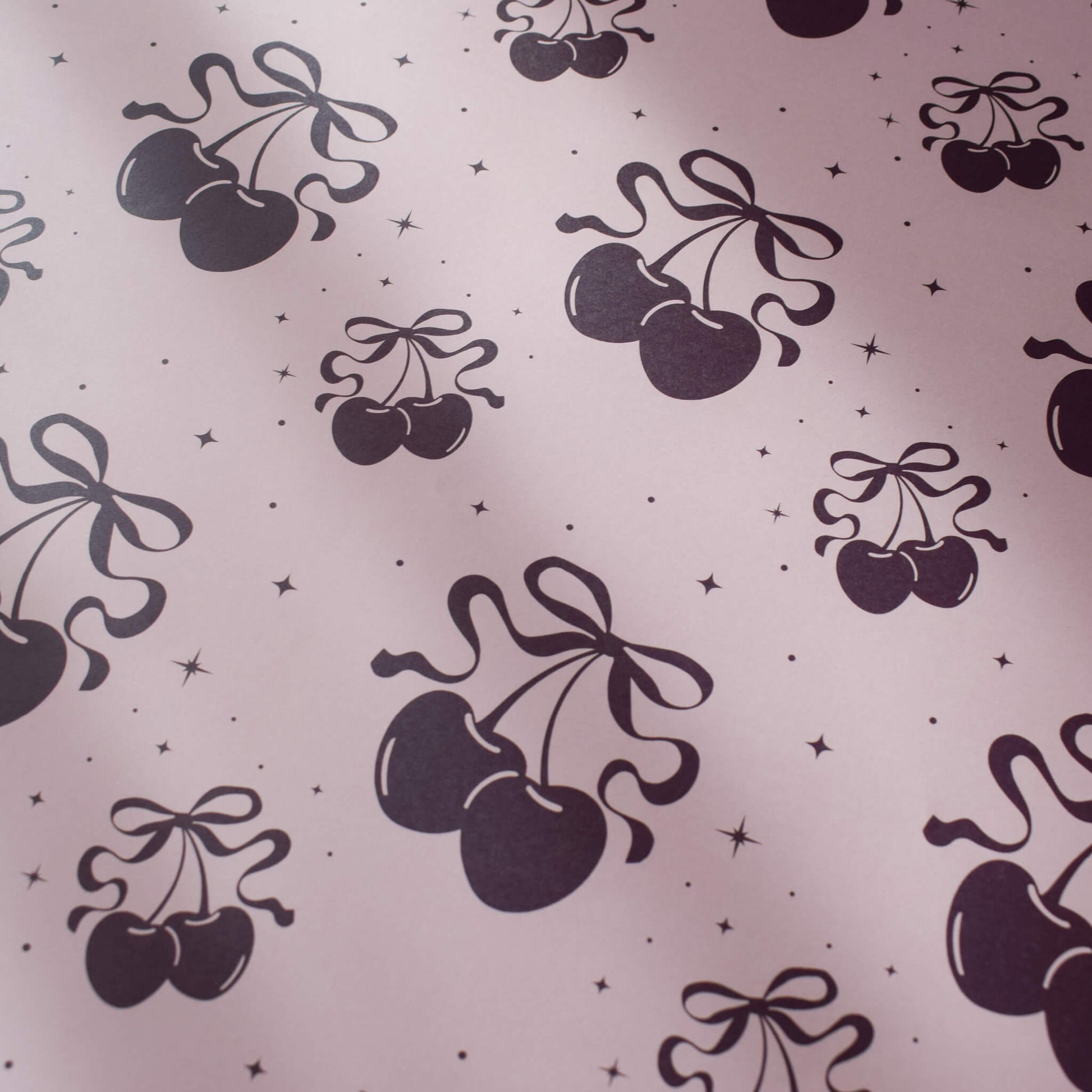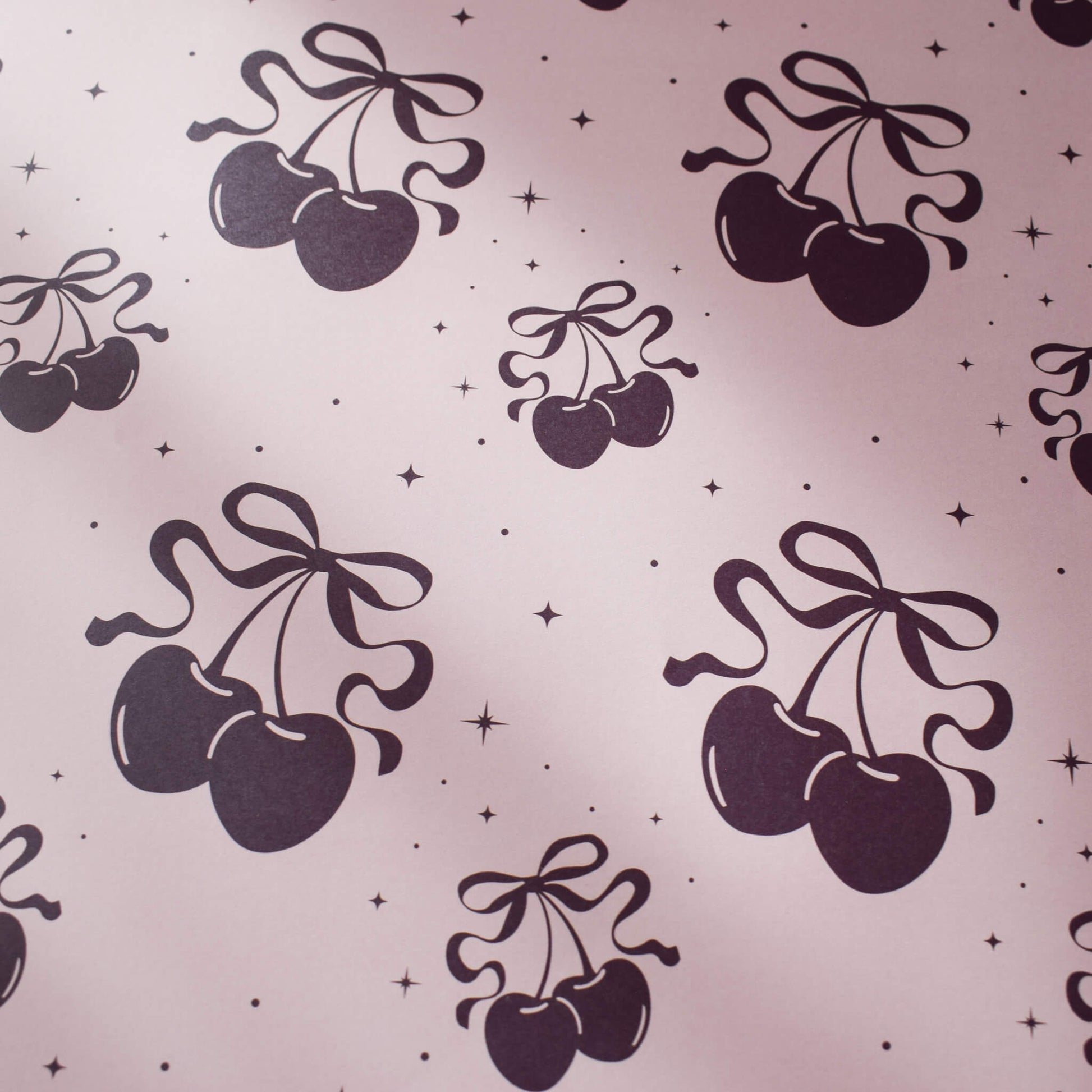 This cherry print gift wrap features burgundy cherries, twirling ribbons and stars on a pale pink background, it's sweet with a touch of sparkle. A playful design for birthdays, celebrations or just to make them smile. Comes as two folded sheets, each 700mm x 500mm.