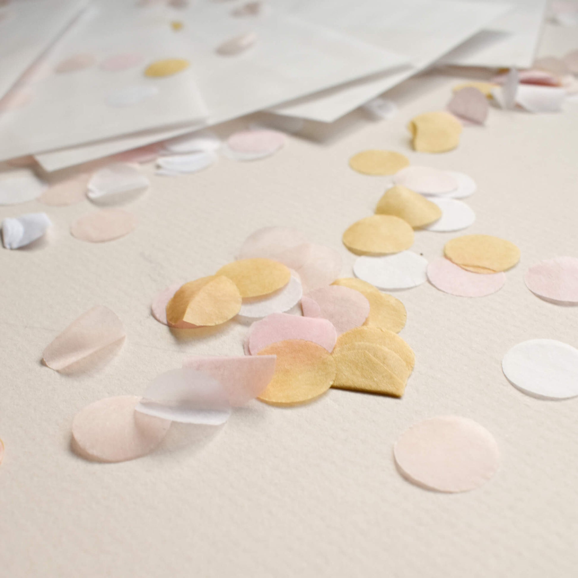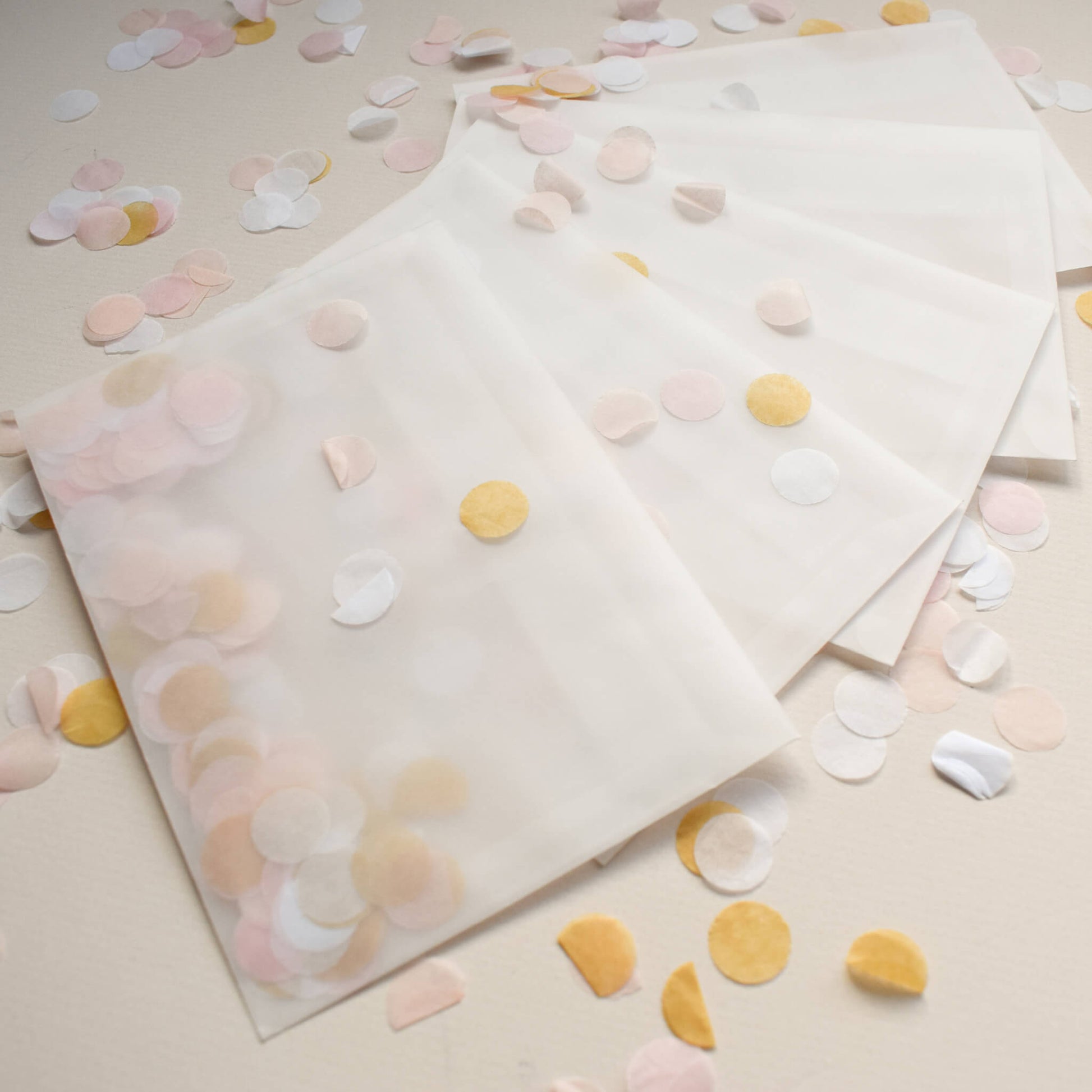Each envelope is delicately crafted from premium vellum, renowned for its exquisite transparency and velvety texture, offering a glimpse of the delightful surprise within. Bursting with an assortment of confetti in soft pink, white and gold hues, every envelope promises a moment of joy and wonder upon opening.