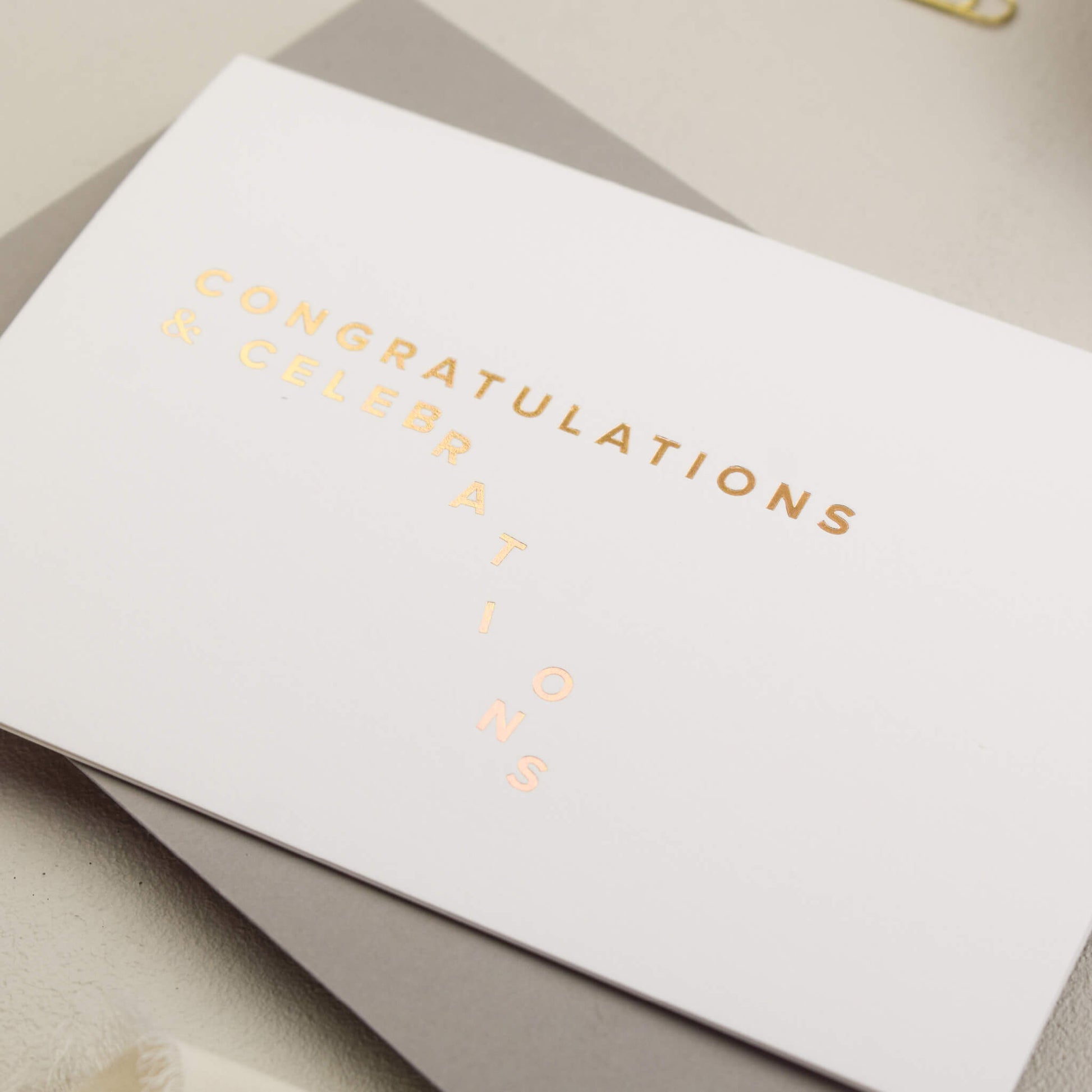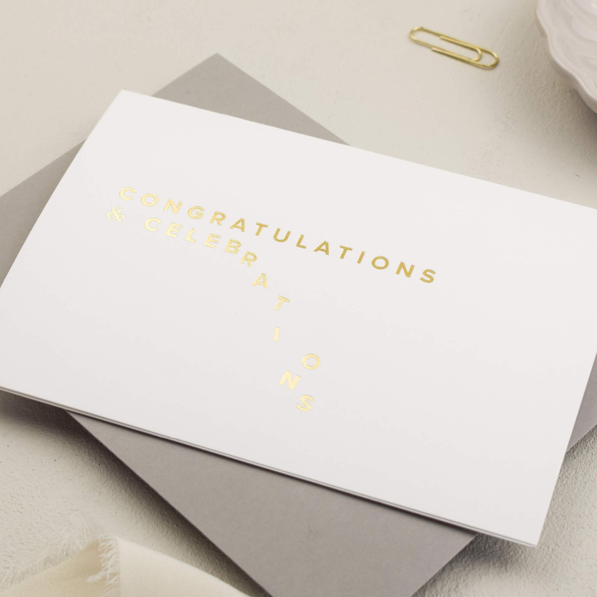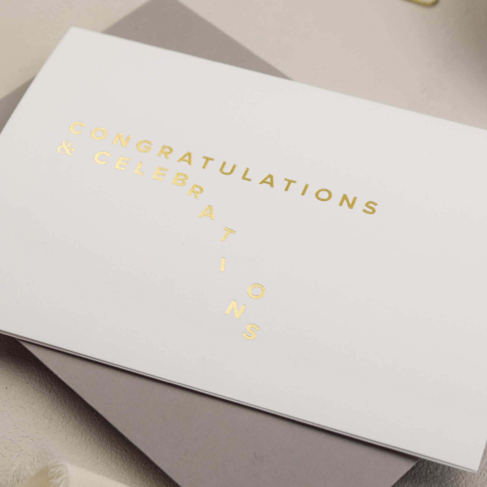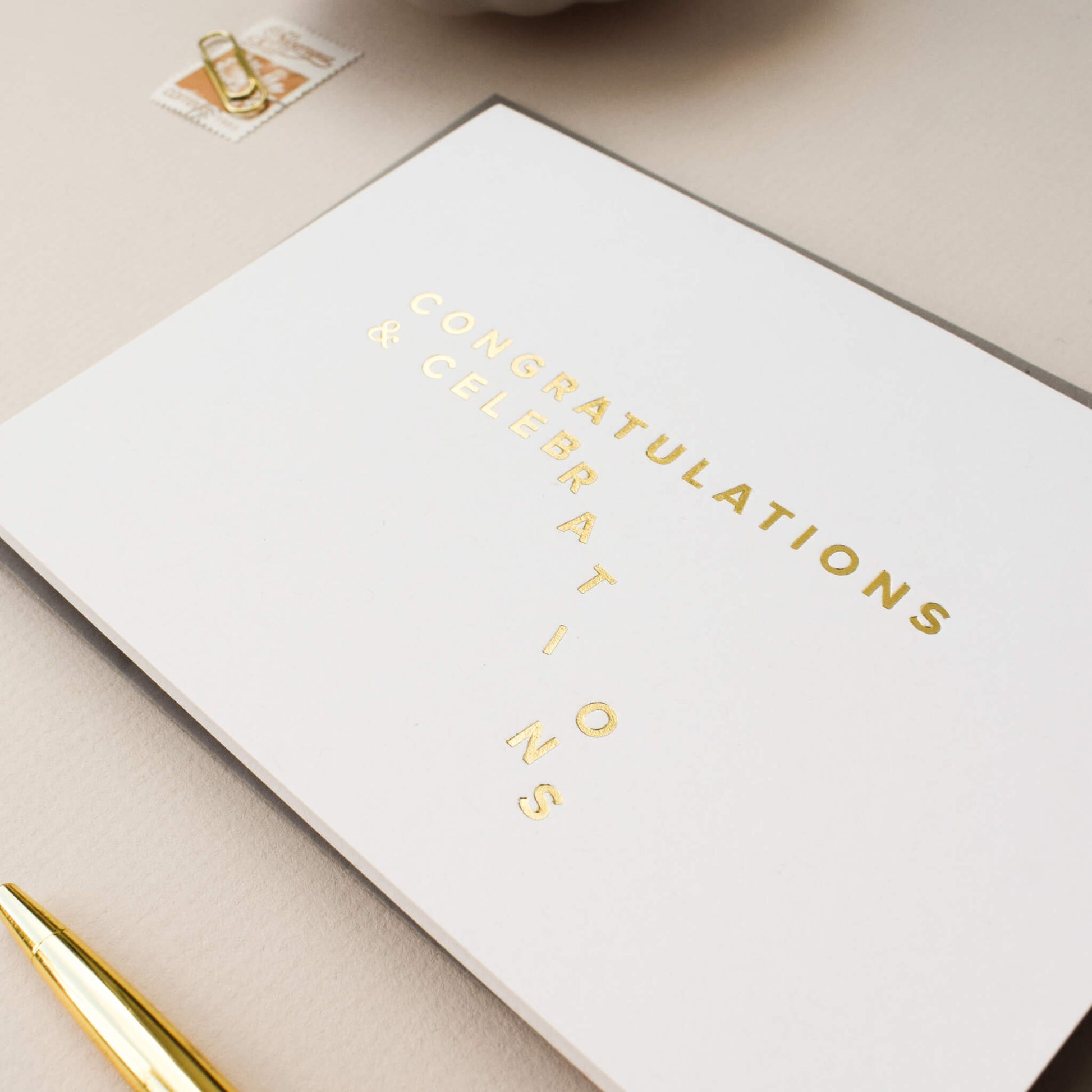 This simple but incredibly stylish typographic card features the words 'congratulations & celebrations’ in a modern sans serif font. The letters of ‘celebrations’ cascade beautifully down the page in a typographic representation of someone who has celebrated a little bit too much.
