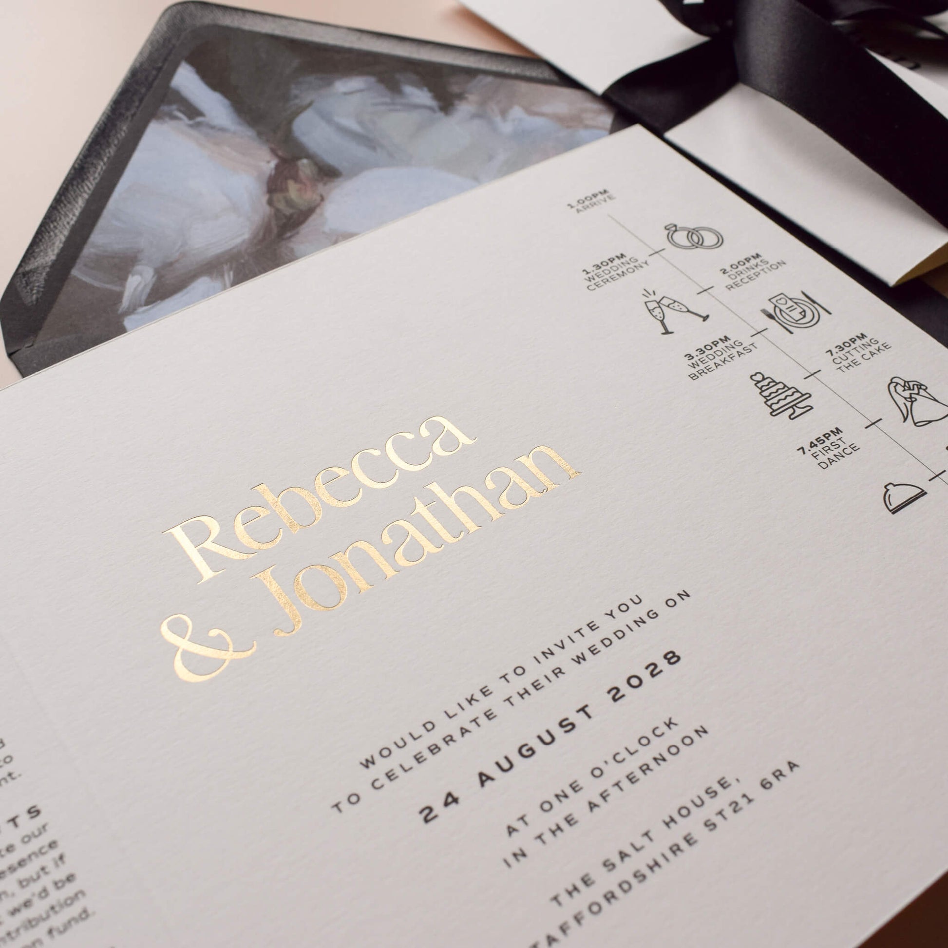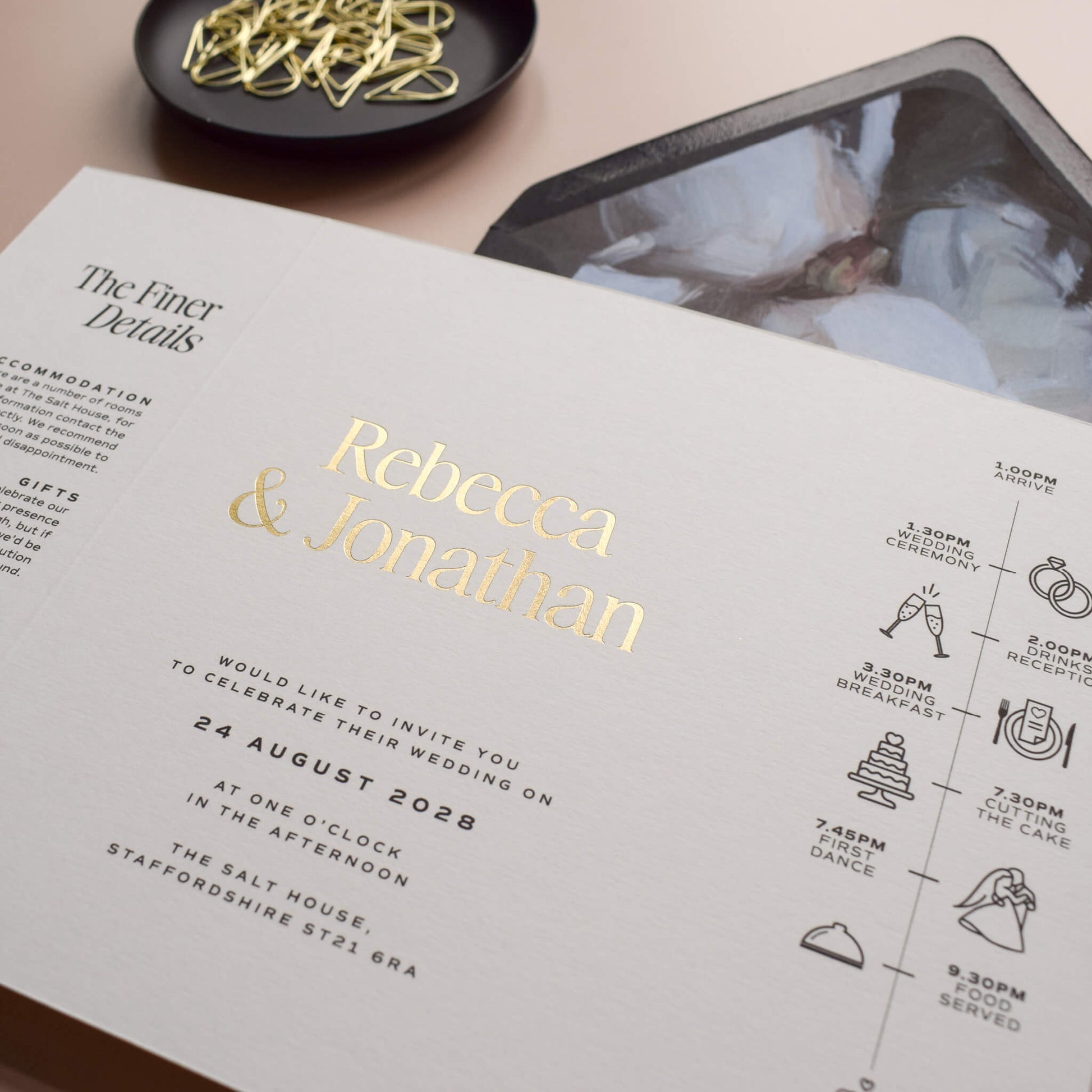 Printed on beautifully textured premium paper, the Lumina wedding invitation is designed to feel both minimal and luxurious. The hot foil printing technique creates a subtle indentation in the paper alongside a delicate metallic shine, adding depth and tactile detail to the design.