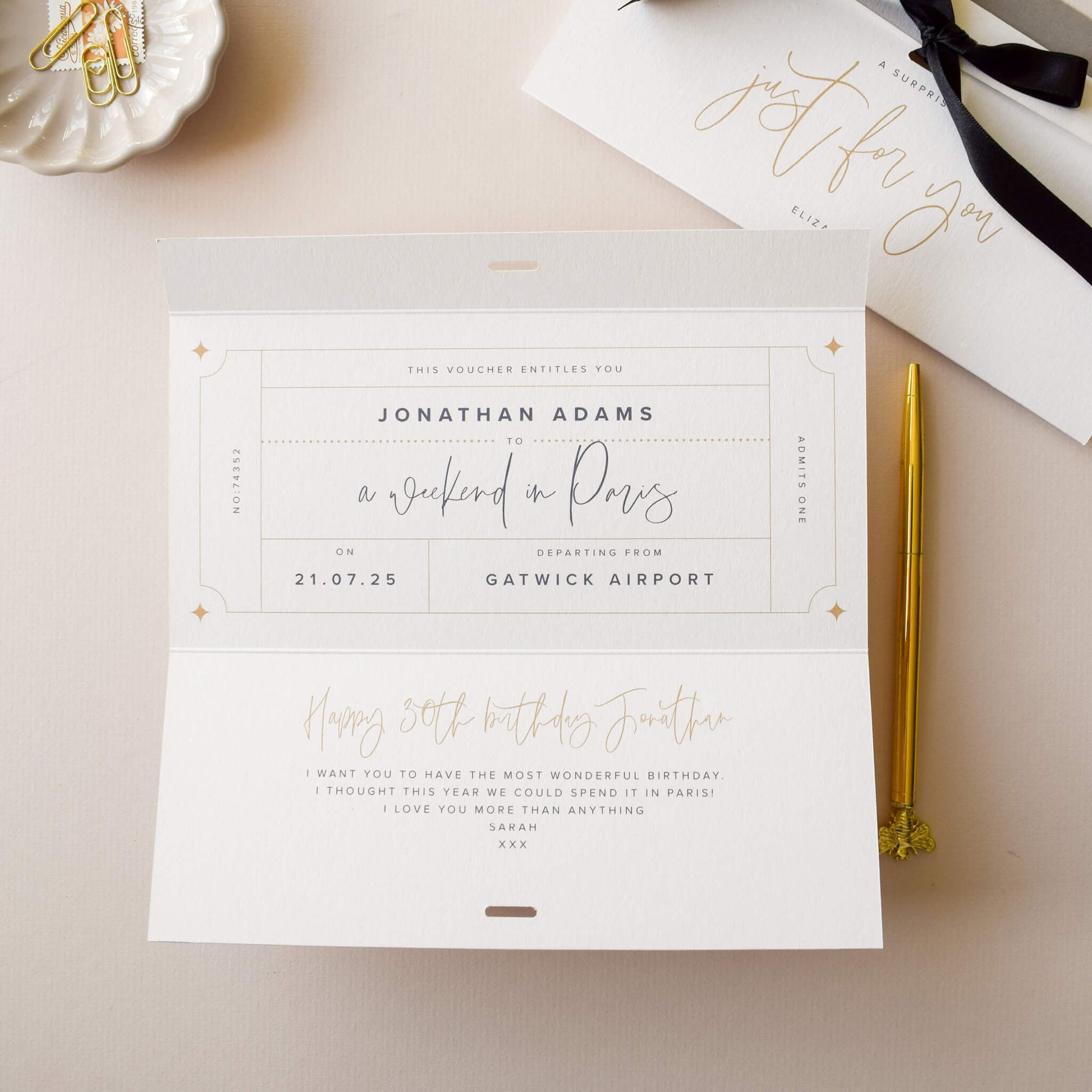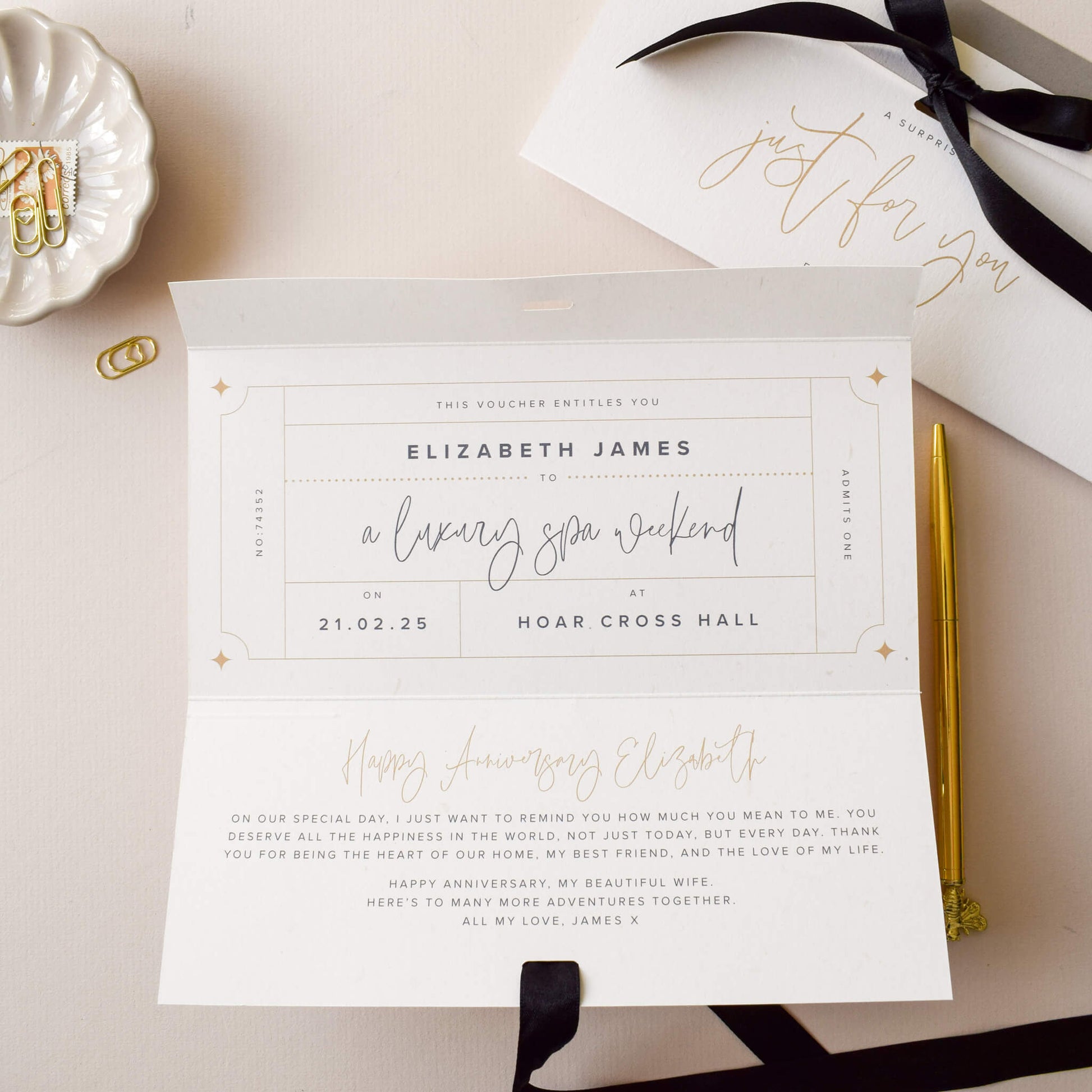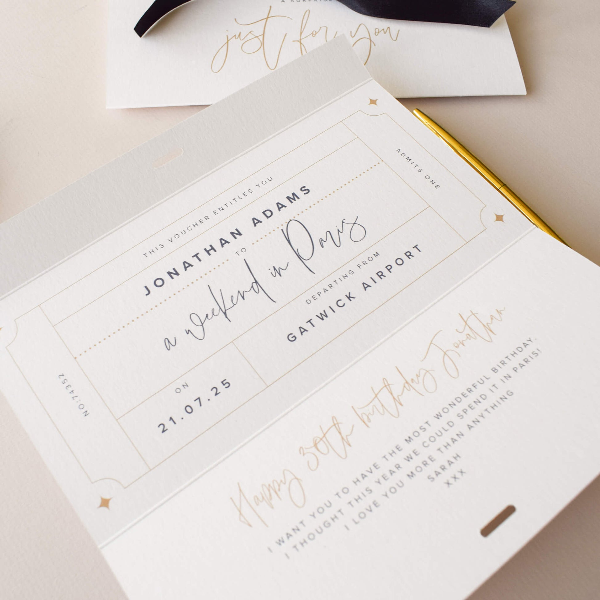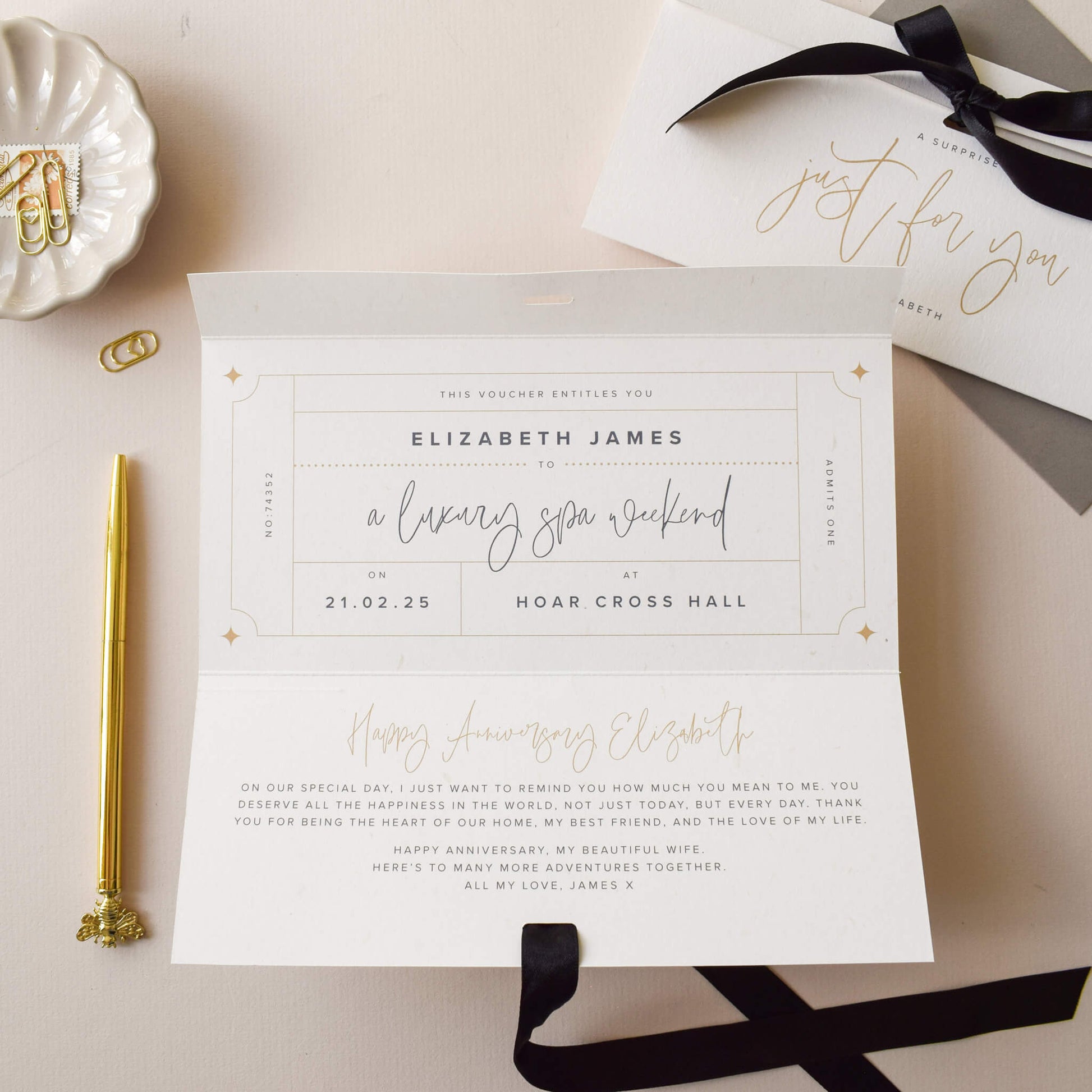 Whether it’s a spa day, theatre trip or even a city break, this beautifully designed personalised voucher card elevates the excitement of the occasion. The front features the words 'Just For You' and their name. When your loved one unties the black satin ribbon and opens the card, they'll discover a personalised voucher for their experience.