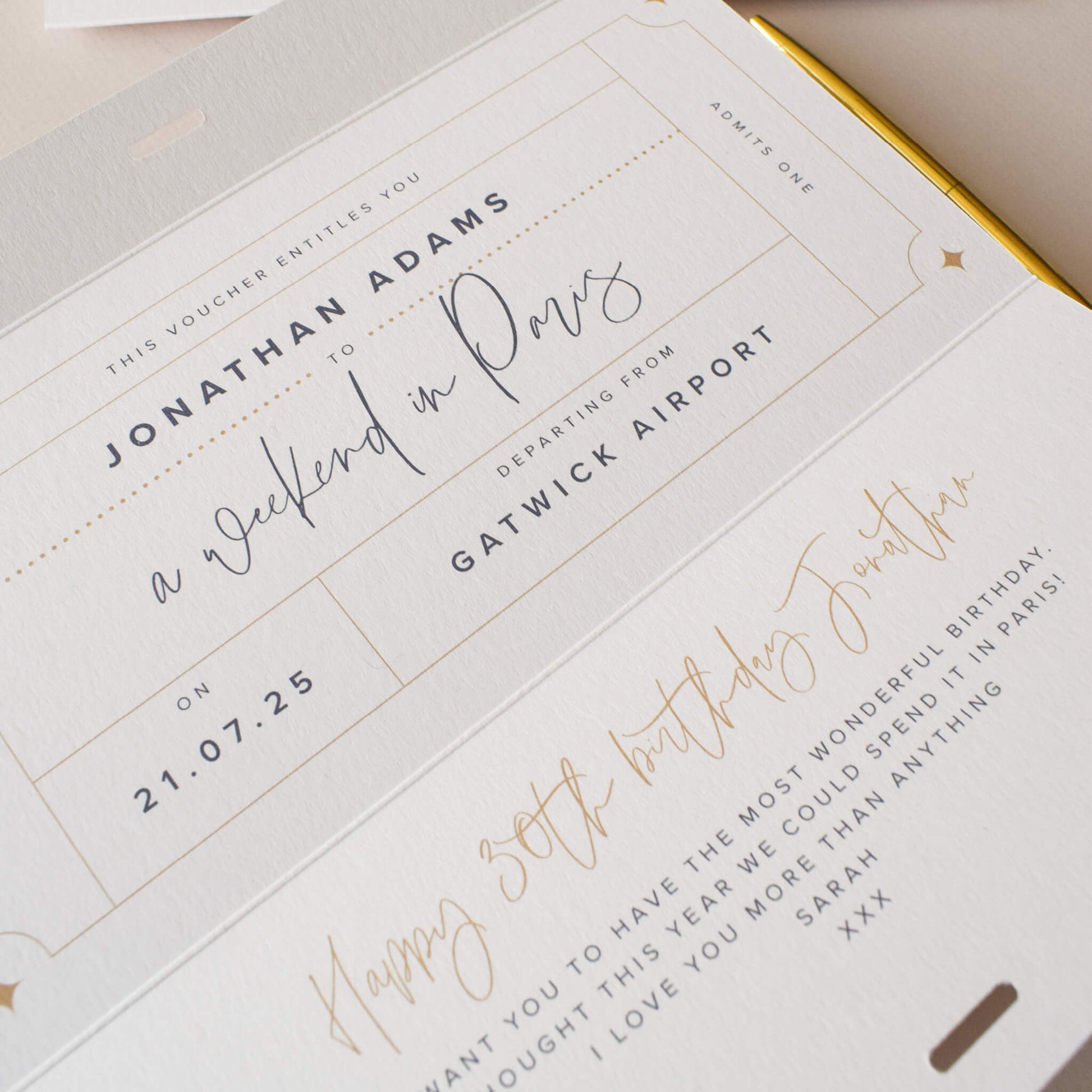 Please include the recipient's name, the details of the experience (such as the event, date, venue, or departure location) and a meaningful message for that extra special touch.