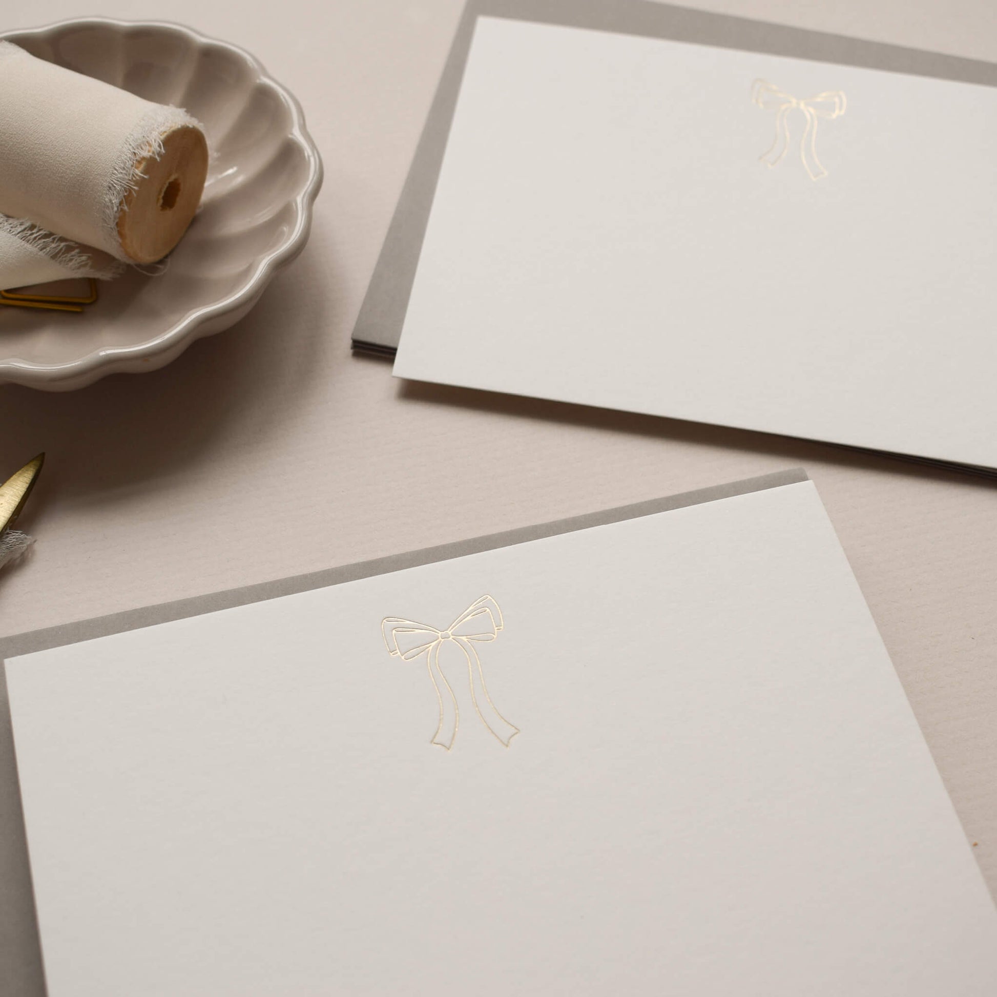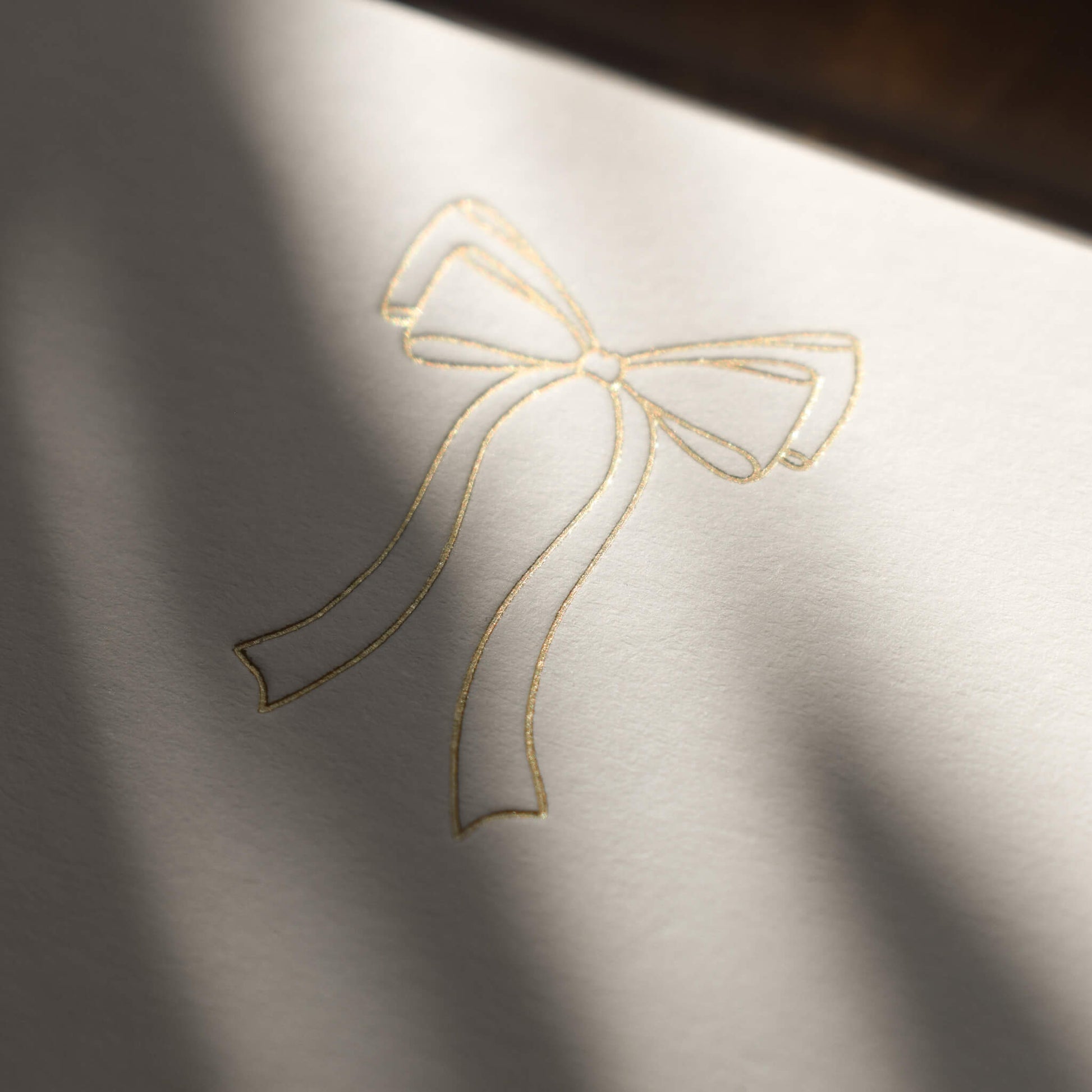 Add a touch of timeless elegance to your stationery collection with these luxury gold bow notecards. Printed in shimmering gold foil on premium white card, each notecard features a delicate bow design at the top centre, making them perfect for writing thoughtful thank you notes, heartfelt messages or stylish everyday messages.