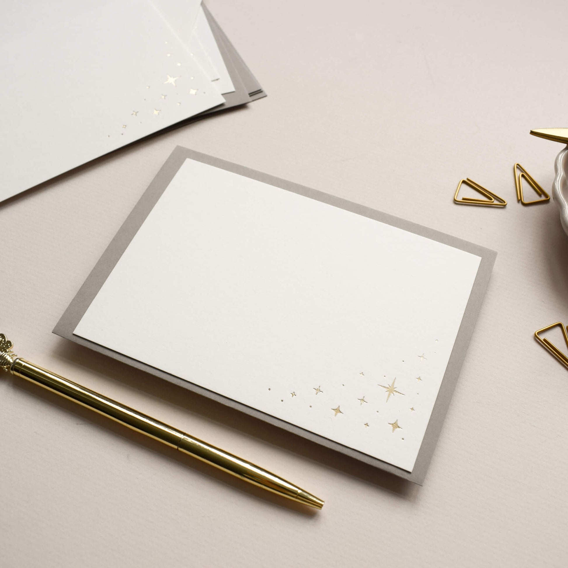 Send your messages with sparkle using these luxury gold star notecards. Each A6 notecard is crafted from premium white card and hand-printed with a delicate cluster of gold foil stars in the corner, offering just the right balance of elegance and shine.