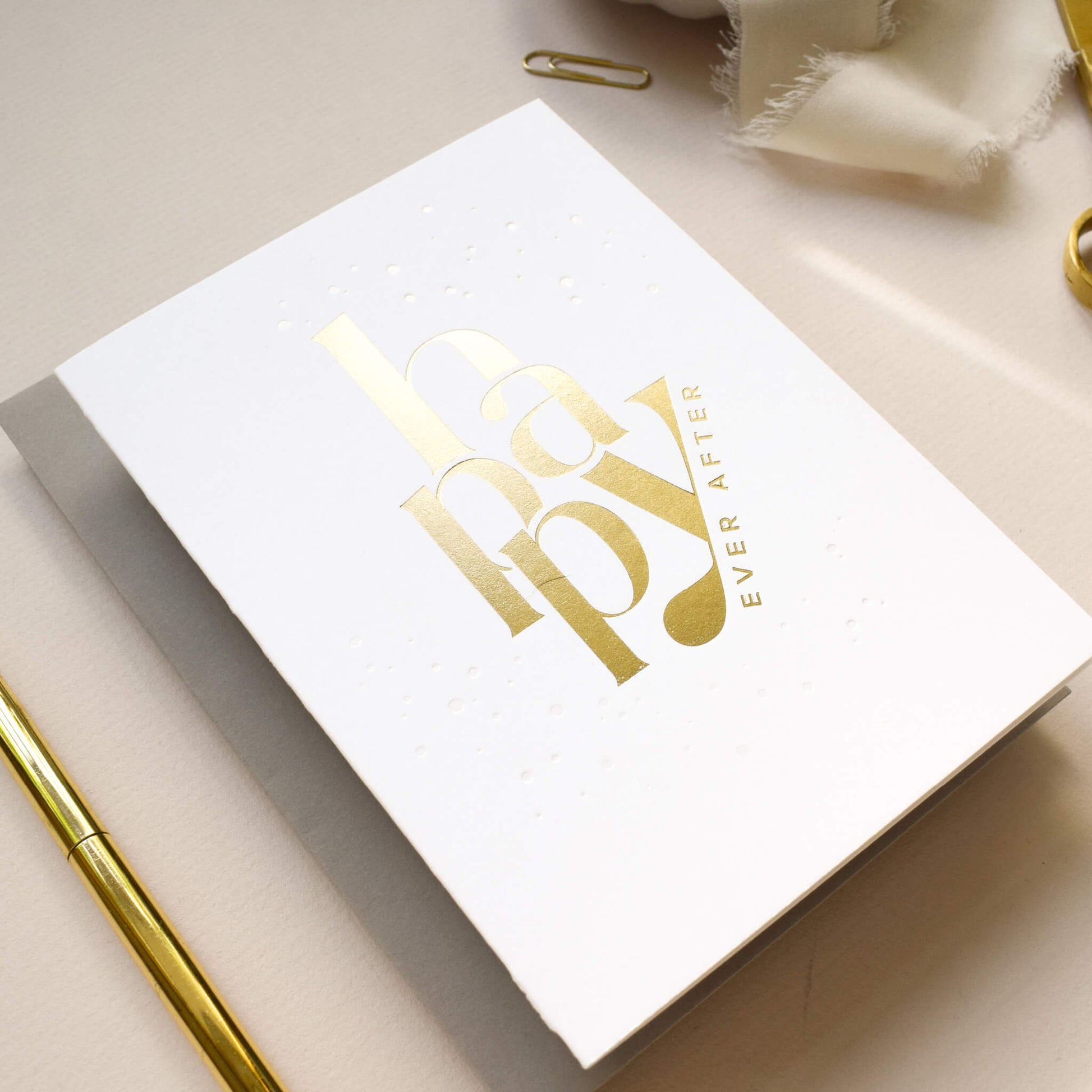 This luxurious card featuring the words 'Happy Ever After’ is the perfect card to celebrate a wedding or anniversary. Featuring a modern and bold, typographic design, printed in premium gold foil onto stunning paper this stand-out card is bound to delight the lucky recipient.