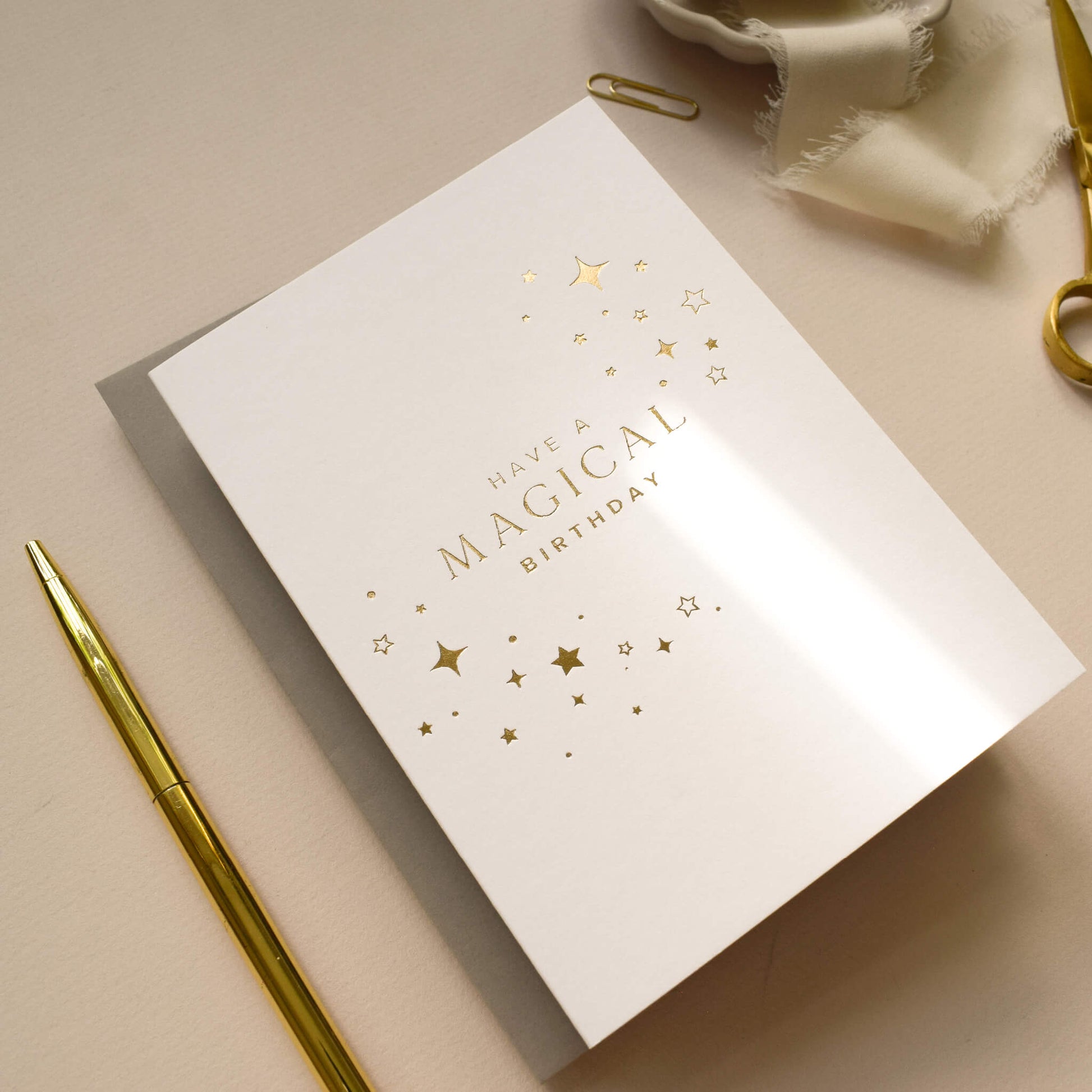 This luxury birthday card features the words 'have a magical birthday' printed in gold foil and is surrounded by gold foil stars which make this a gorgeous card for any special birthday, no matter if it’s for family, friend or colleague.
