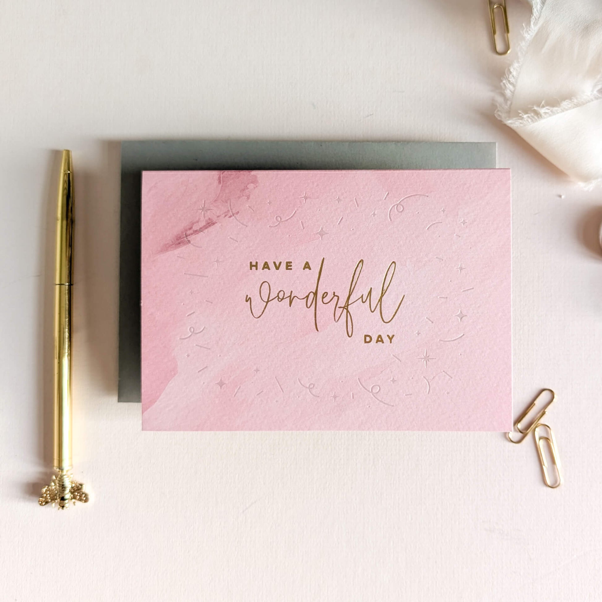 This luxury card features the words 'Have a Wonderful Day', with Wonderful highlighted in elegant calligraphy at the centre of the design. The text is beautifully enhanced with subtle transparent gloss foil, which creates a playful confetti effect around the lettering, a detail that catches the light in the most delicate way. Set against a pale pink painted background, the design is both joyful and refined.