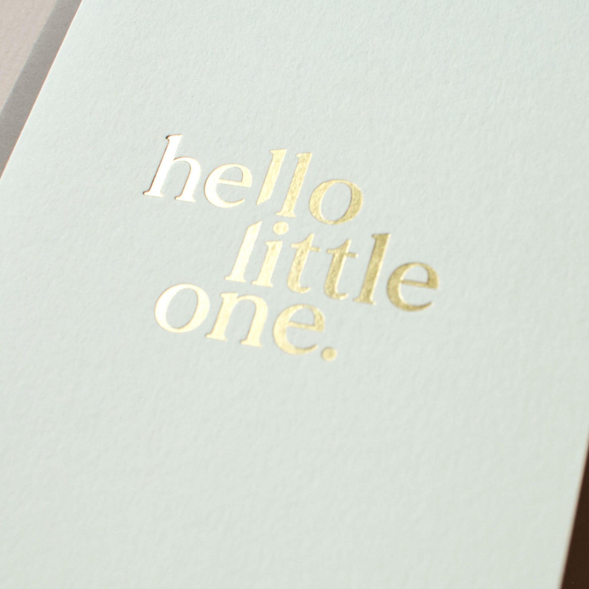 This beautiful card featuring the words 'hello little one’ printed in gold foil onto beautiful mint green is perfect for celebrating the arrival of a new baby. The minimalistic typographic design works perfectly with the stunning texture of the paper and the luxurious foil.