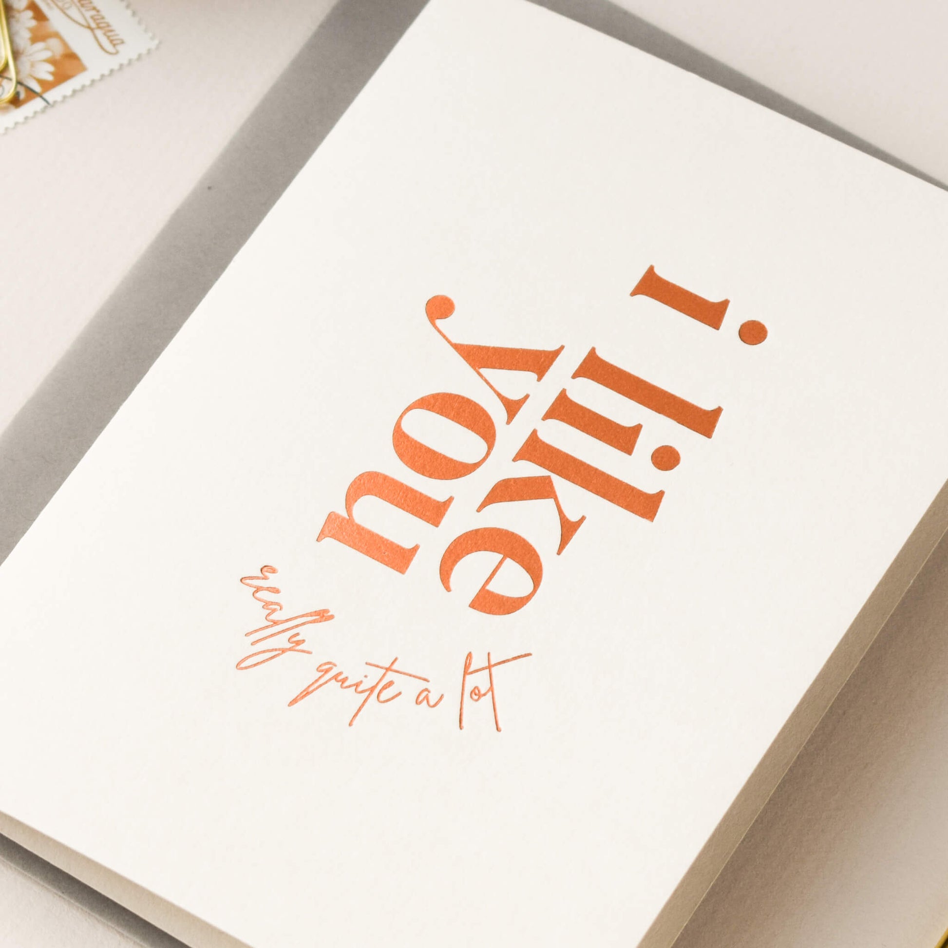 Express your affection in style with this enchanting ‘I like you’ card. Whether it's your beloved partner or your dearest friend, this card is the perfect way to remind them of how you feel. Crafted with meticulous care, this card is printed with bright copper foil onto a warm stone coloured card and has an irresistible charm that is sure to leave a lasting impression. The text, in a handwritten-style typeface, is thoughtfully arranged in a gracefully arched shape, which adds a touch of personalised warmth, making it an exceptional keepsake for your loved one.