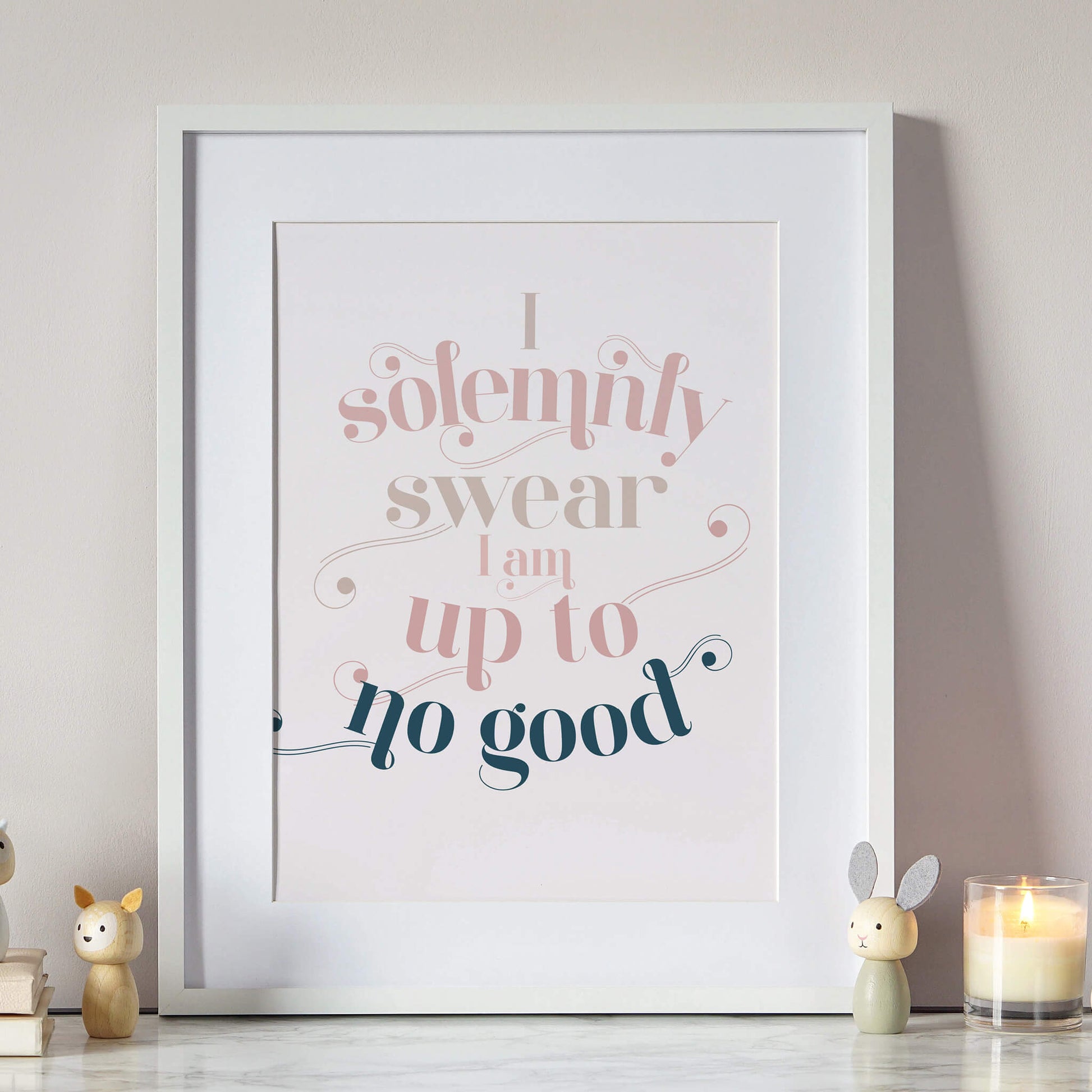 This ‘I solemnly swear I am up to no good’ print combines a great quote in a classic Didot style typeface with a meticulously selected colour palette and the result is a timeless print that your child is sure to love, no matter how old they are. When I designed this range it was important to me to create a selection of prints that weren’t too childish, so that they could stay in your child’s room indefinitely, but also to help you to create a stylish space that you would love as much as your children do.