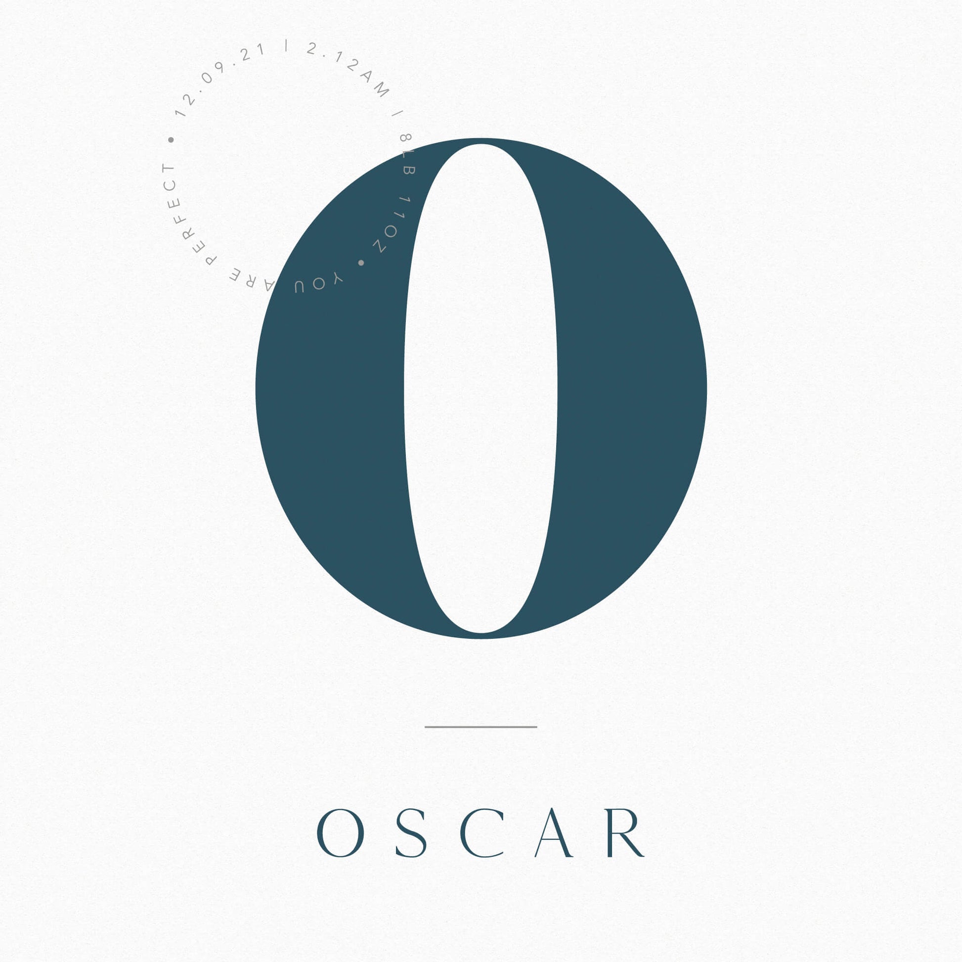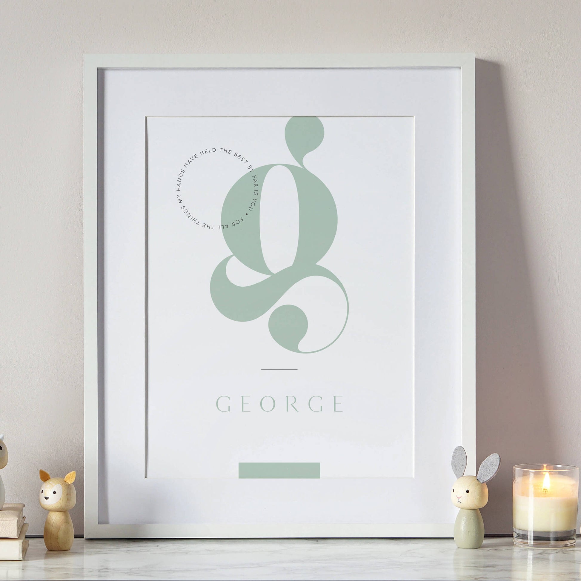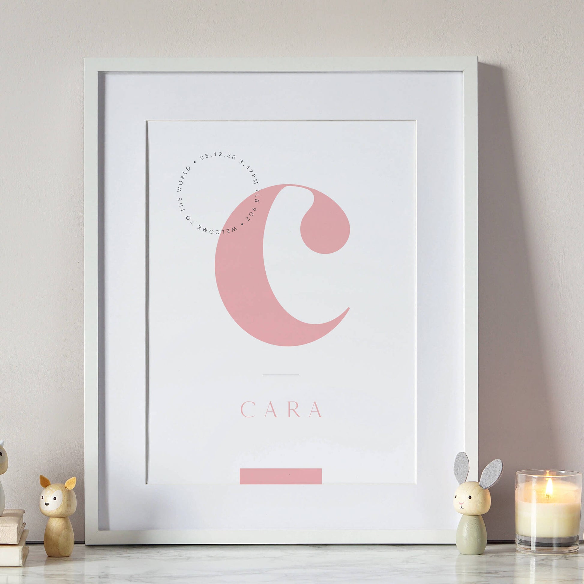 Your child’s initial is placed prominently in the centre of the print in an elegant typeface with their name placed below. Towards the top left of the print there is also space to include details of their birth such as date, time, weight, or if you’d prefer you can include a personal message.
