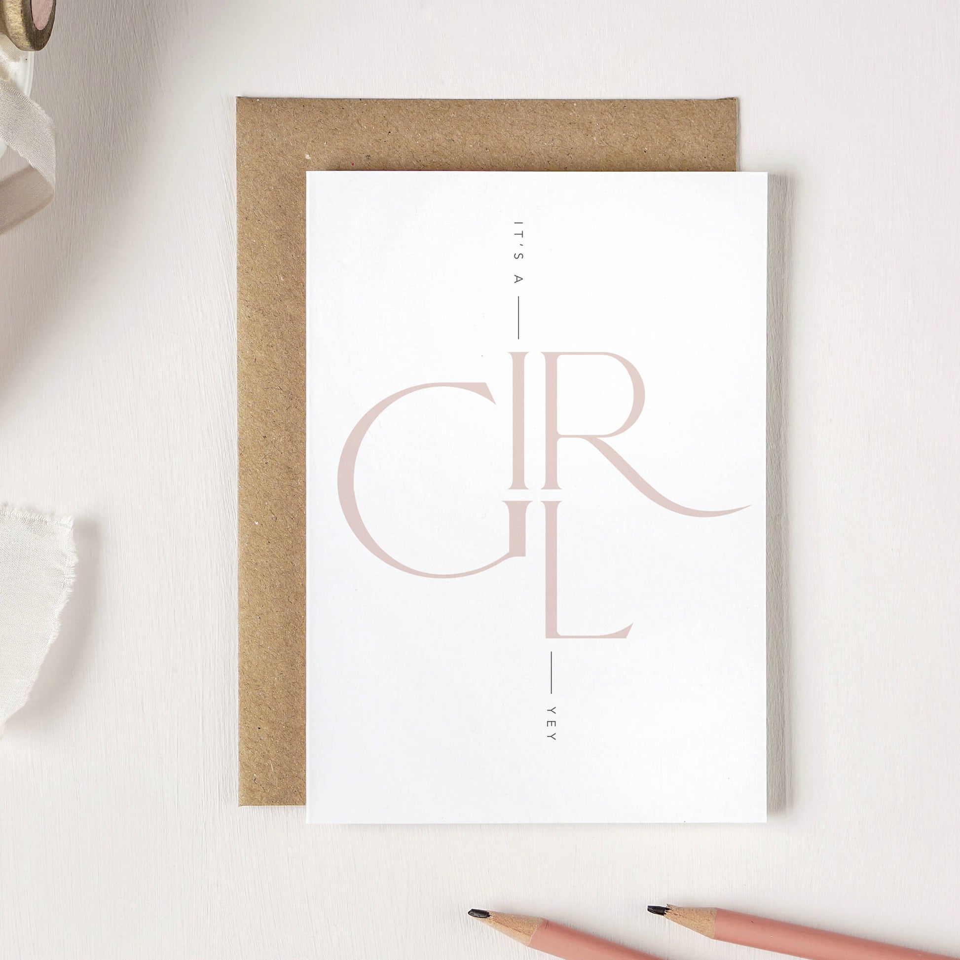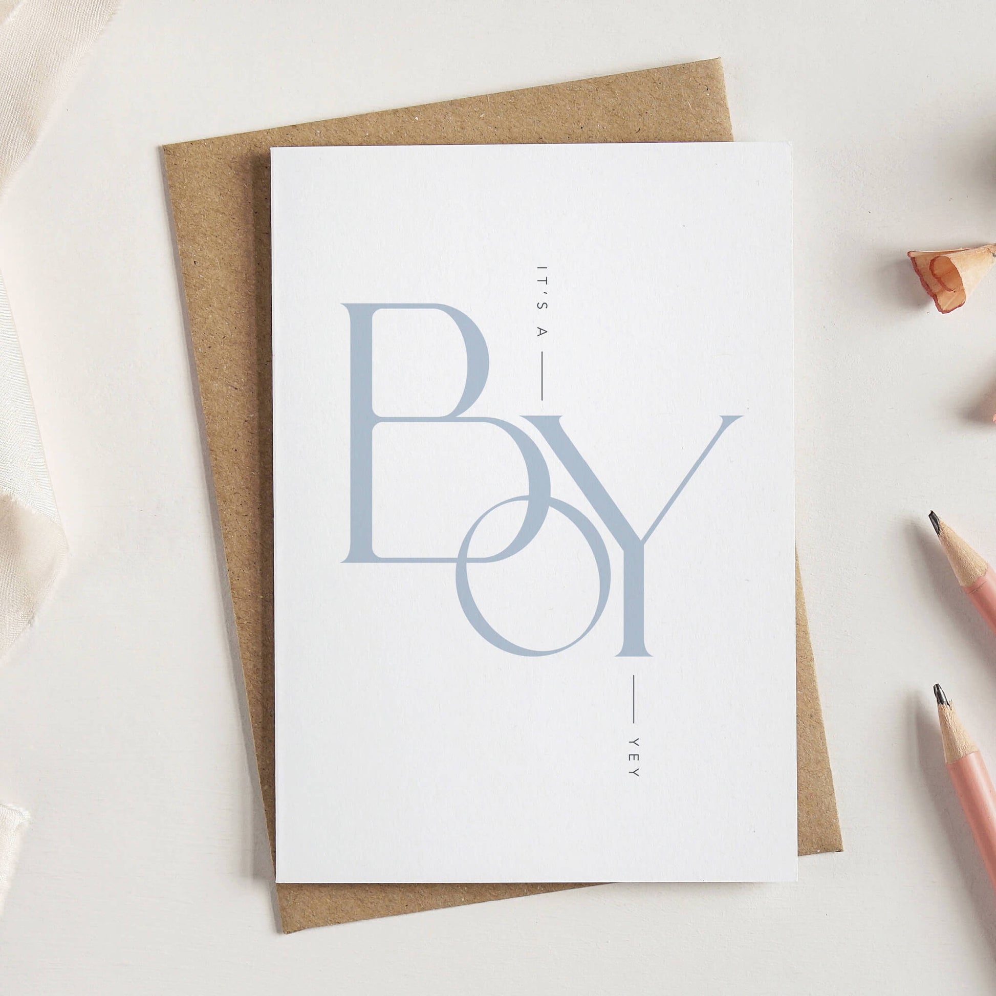 A more stylish and sophisticated take on a gender reveal card, these typographic cards feature the words boy and girl in ice blue and blush pink respectively.