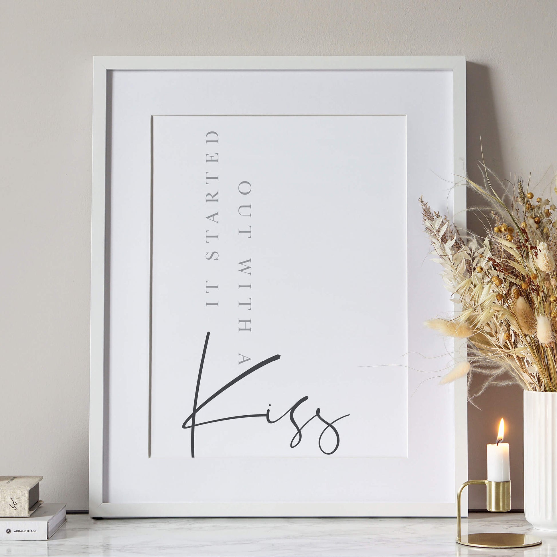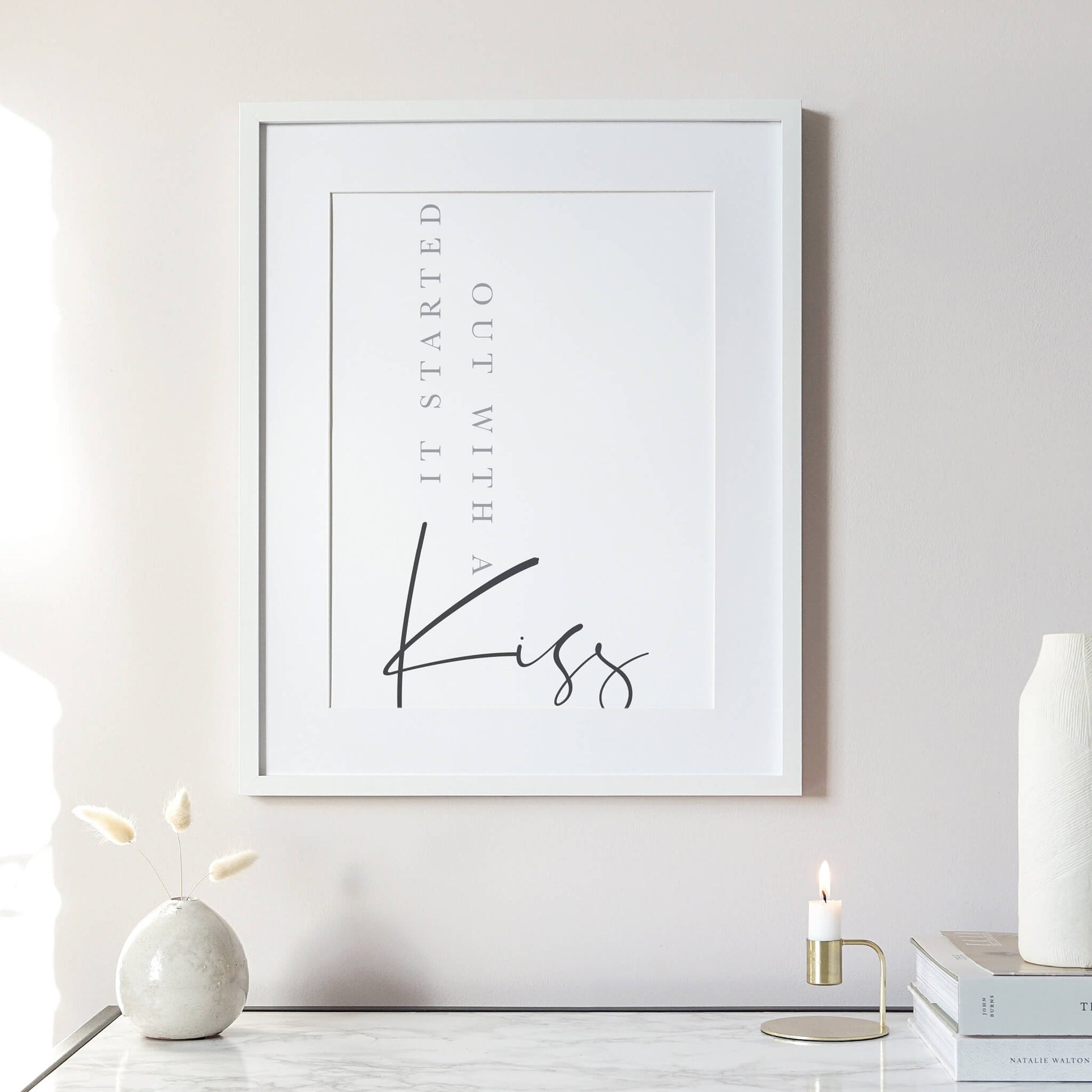 The minimalistic style and colour of this 'It started out with a kiss' print means that it's great for various rooms in your house, but it makes a particularly good bedroom print.