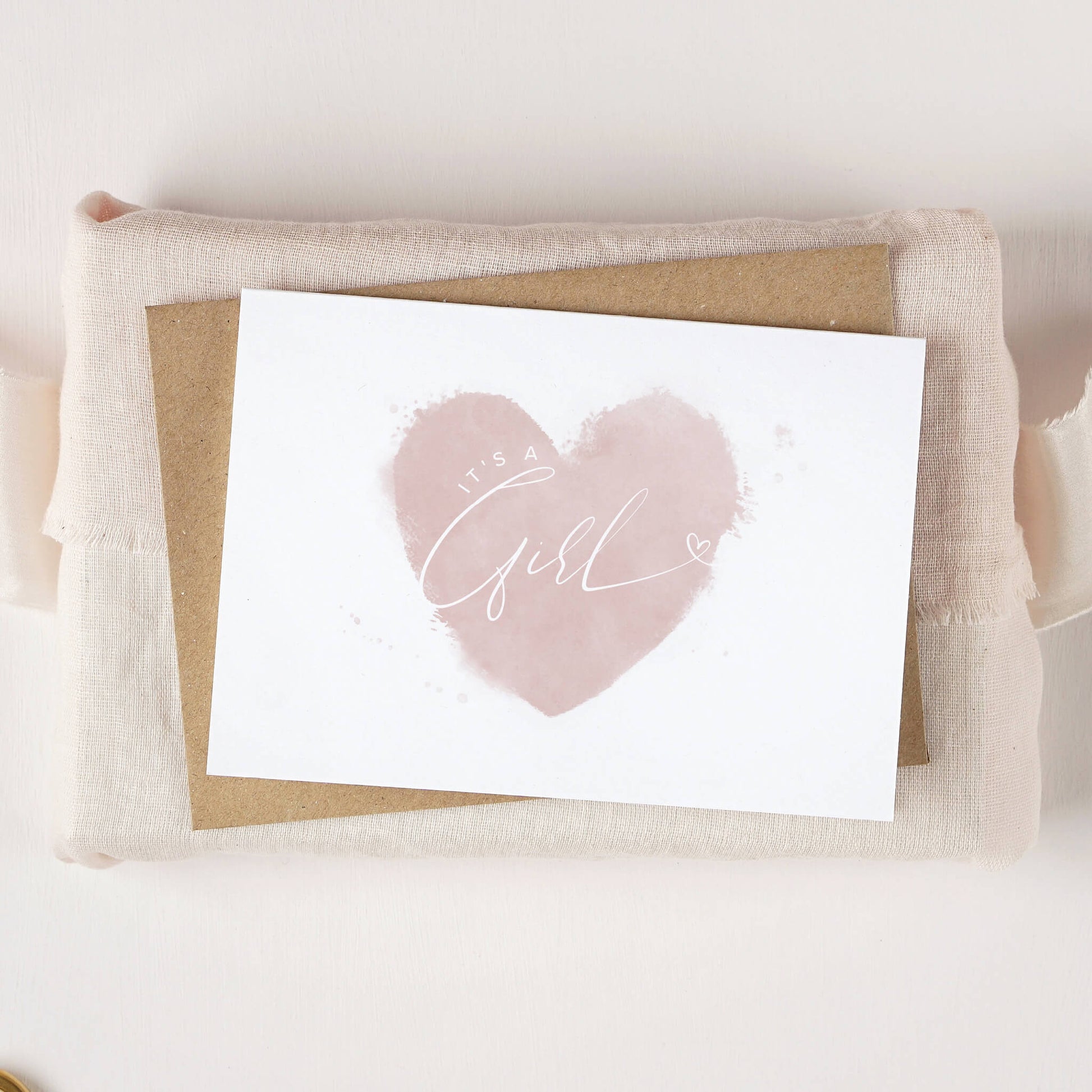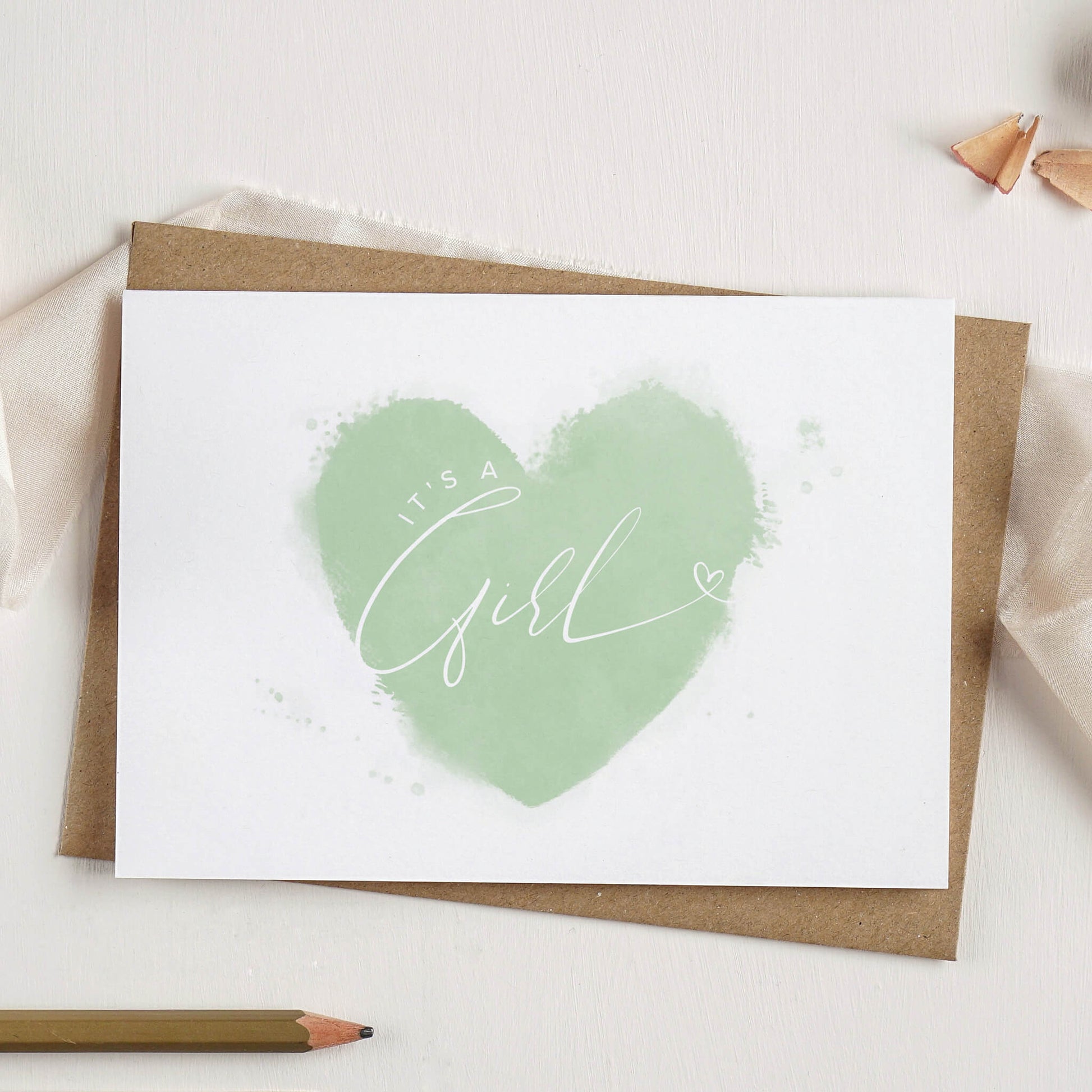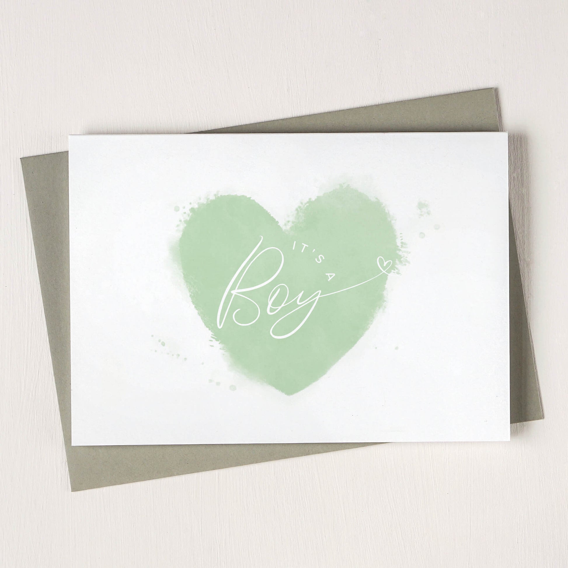 This new baby card featuring a soft watercolour heart is available in a range of delicate colours including pink, blue, blush and green. The set of two contains one pink girl card and one blue boy card.