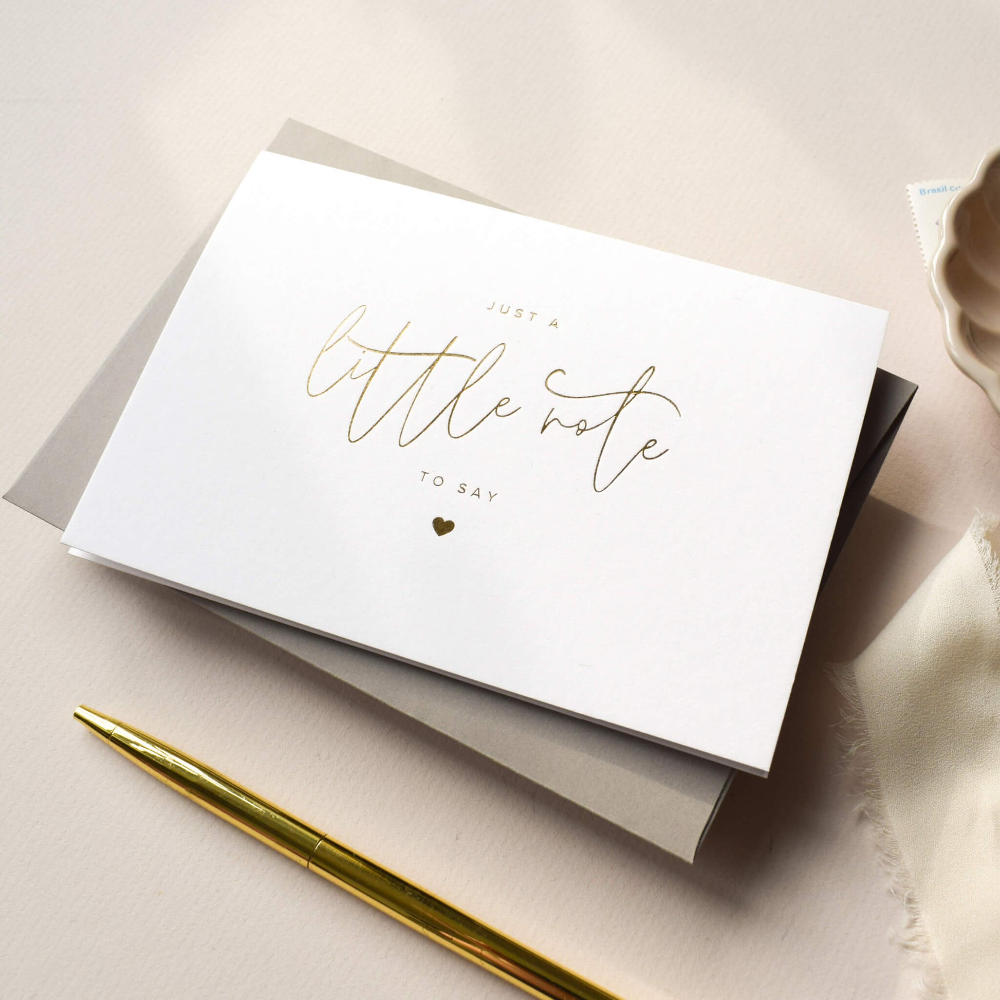 This beautifully simple gold foil card features the phrase "just a little note to say" perfect for all sorts of special moments. Whether you're revealing your pregnancy, sharing exciting news or simply sending a thoughtful message to a friend, this card is designed to suit any occasion.
