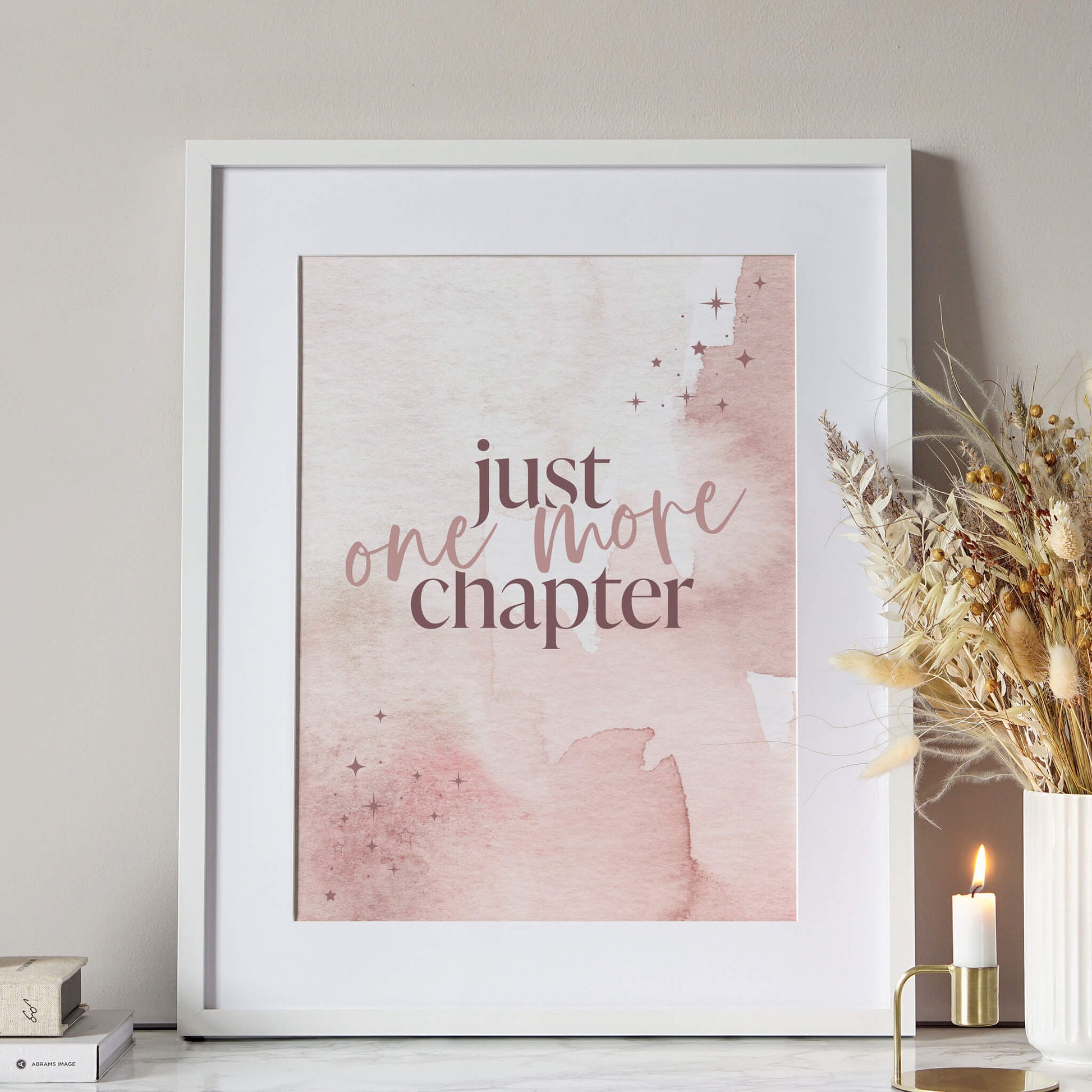 For those who can’t resist turning just one more page, this ‘Just One More Chapter’ print captures that familiar feeling perfectly. The mix of classic serif and handwritten fonts gives it a lovely balance, with ‘one more’ cutting diagonally across the centre in a soft, flowing script. Tiny stars sweep in from both corners, meeting the text in the middle for a magical finishing touch.