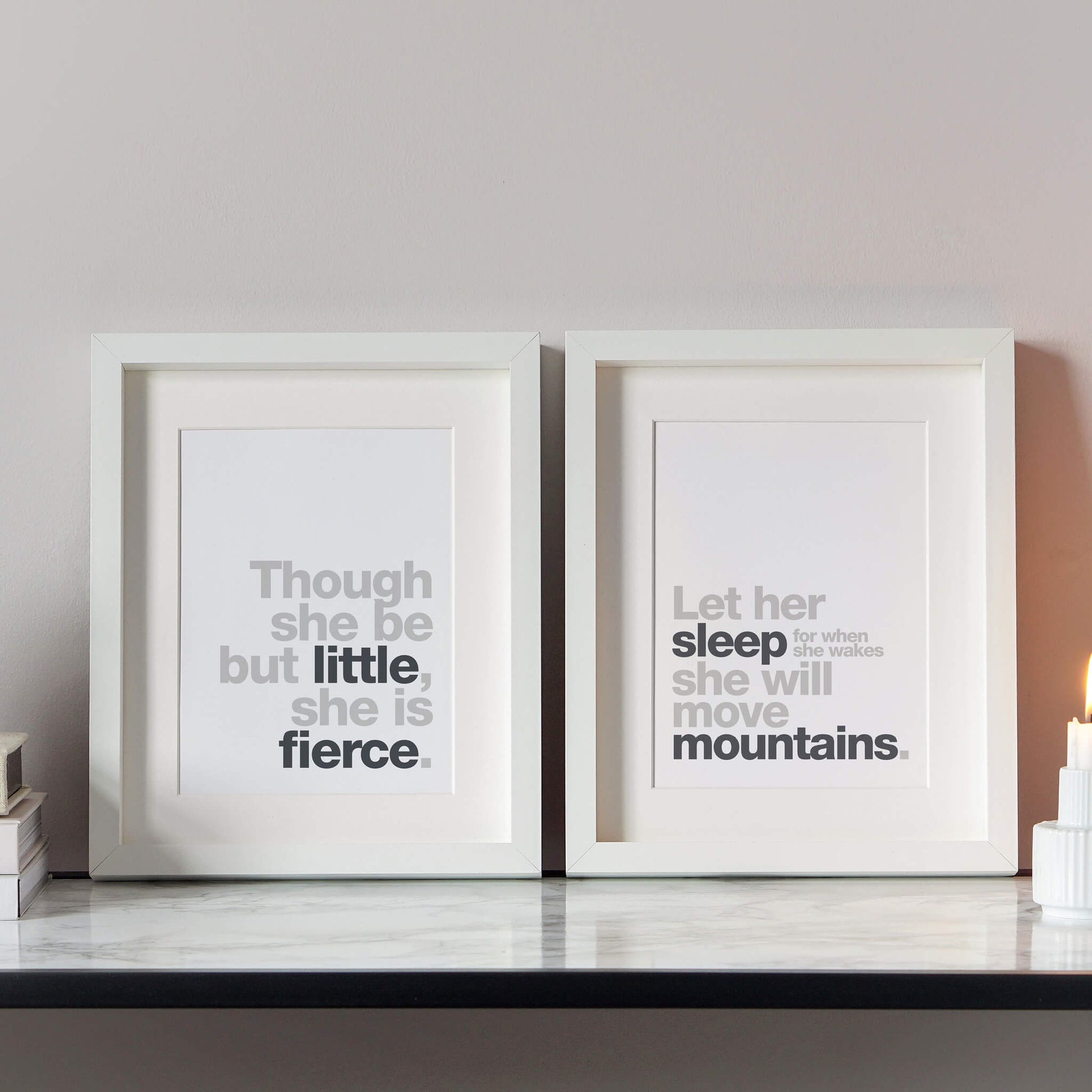 If you are looking for a set of nursery prints or children’s bedroom prints, I also have a coordinating print featuring a wonderful quote from Shakespeare ‘Though she be but little, she is fierce’. These two prints look stunning when they are displayed as a pair. Get 20% off when you buy any three prints at any size, so you could also treat yourself as well as your little one.