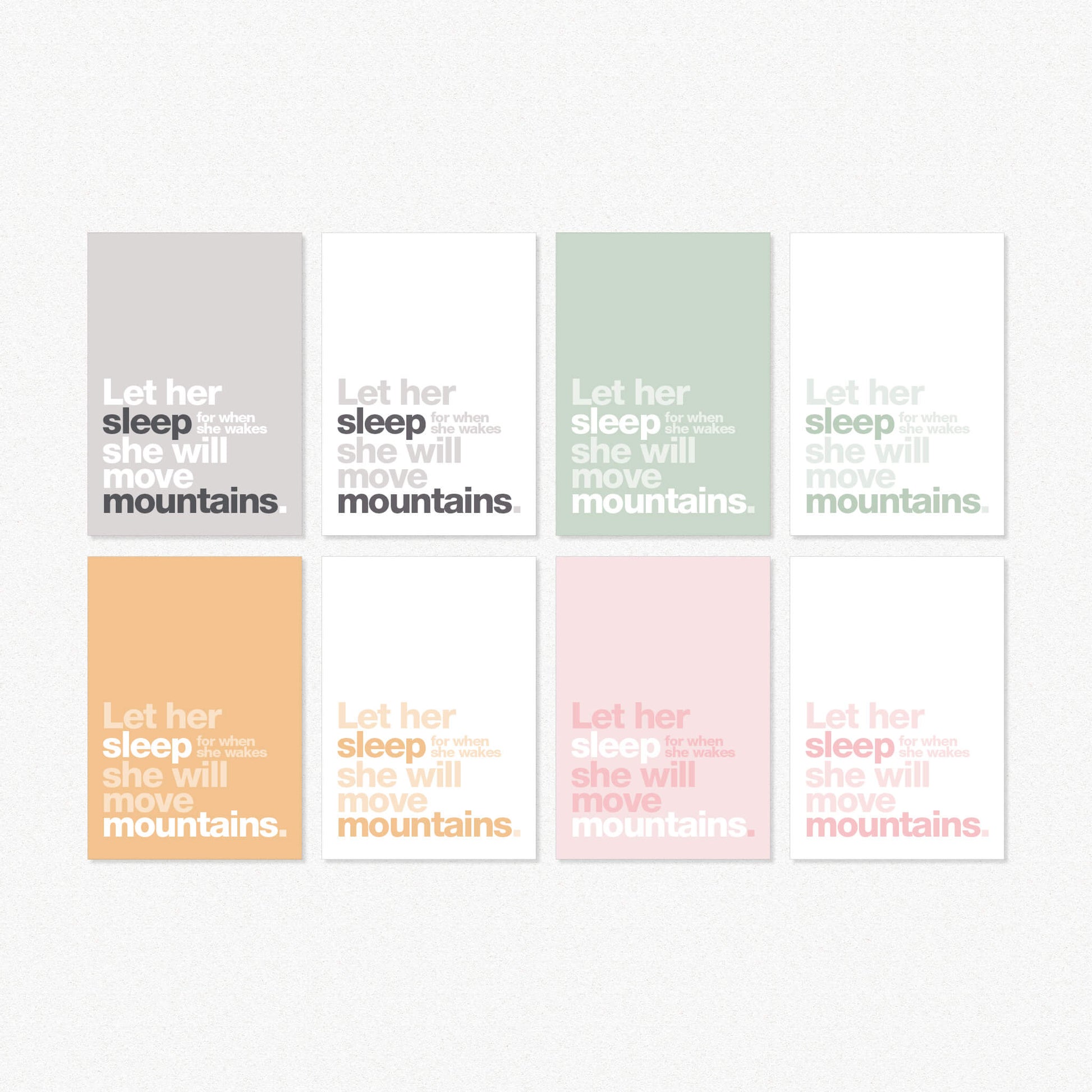 As a mother to two small girls, one of whom has a very relaxed attitude to the concept of sleep, this quote is very fitting and as it’s a very popular print I know that I’m not the only one who thinks so. If you love this quote, but have a little boy who will be moving mountains when he wakes then I am able to change the ‘she’ to a ‘he’.