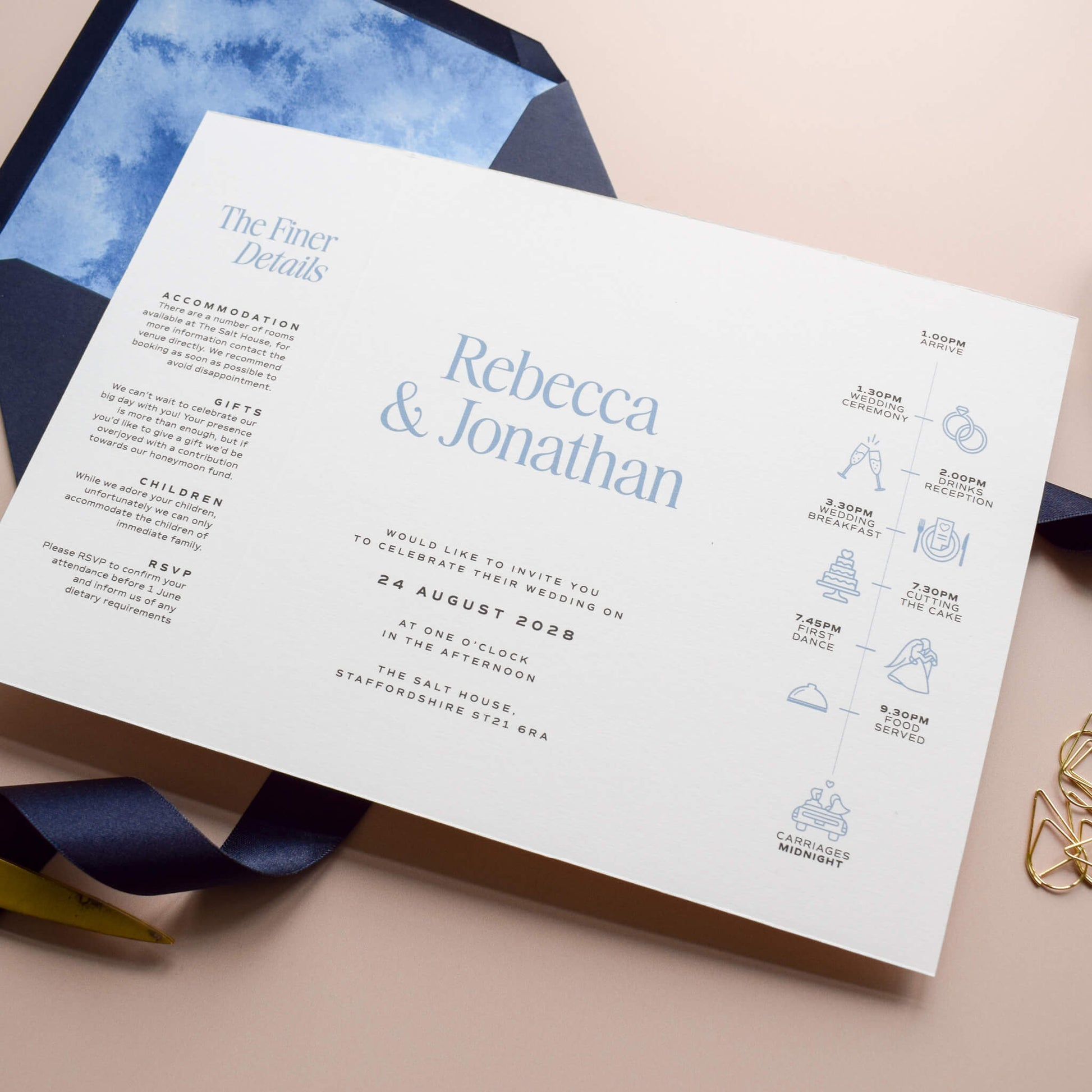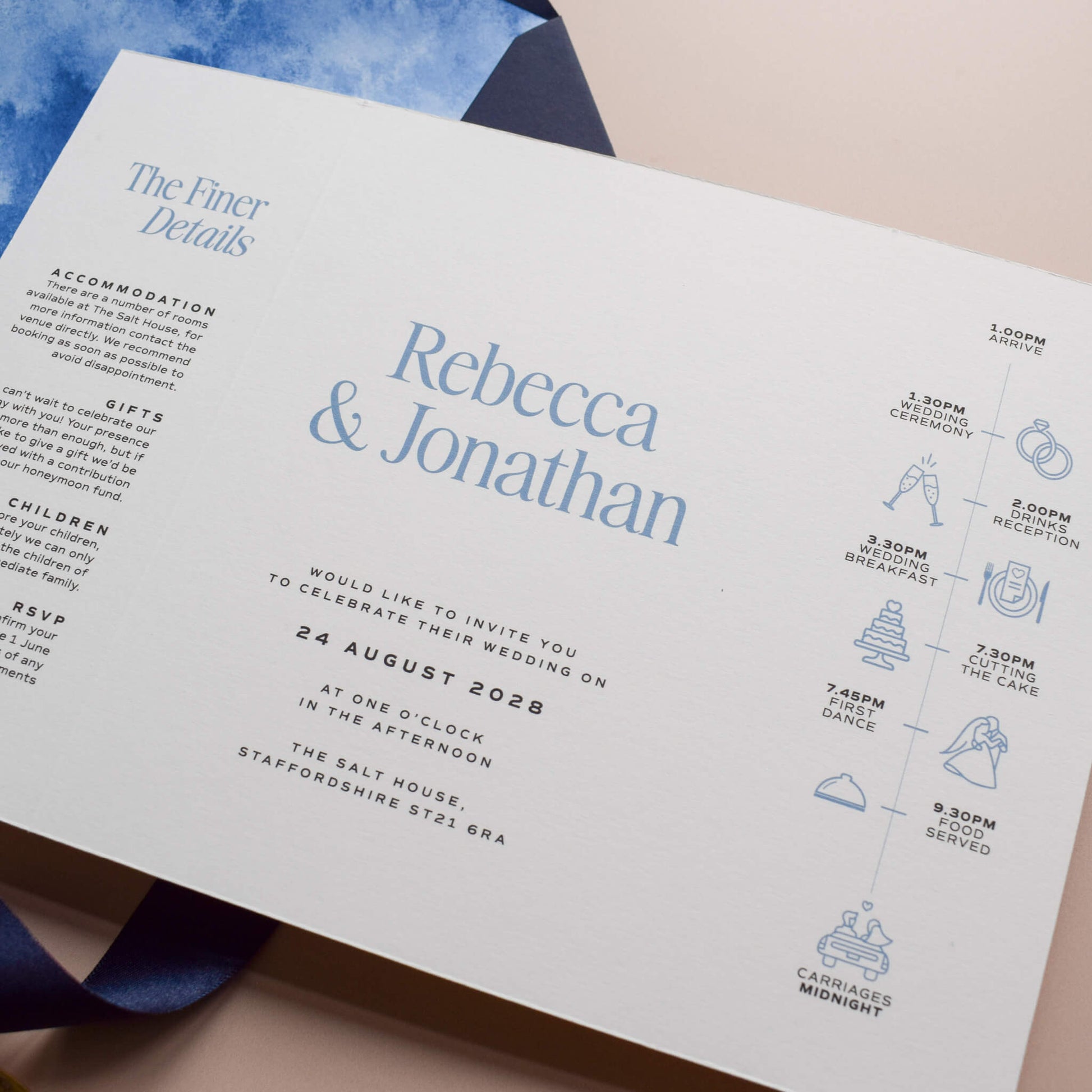 Within five working days you will receive a digital copy of your customised invitation suite via email for you to check and approve. Read more about the process here.