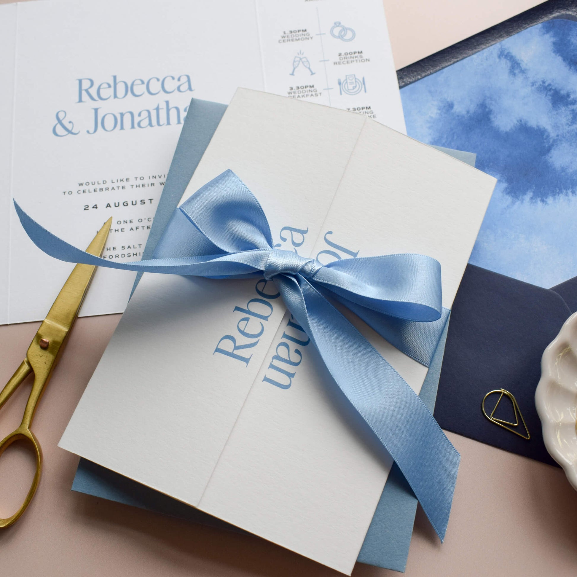 My semi-custom wedding stationery collections have been created to give you a design to base your invitations on, if you wish you can change various elements to make them unique and to reflect your personality and style. As well as changing the wording you are also able to change the colour of the paper, foil, print, envelopes and include various additional elements to enhance your stationery.
