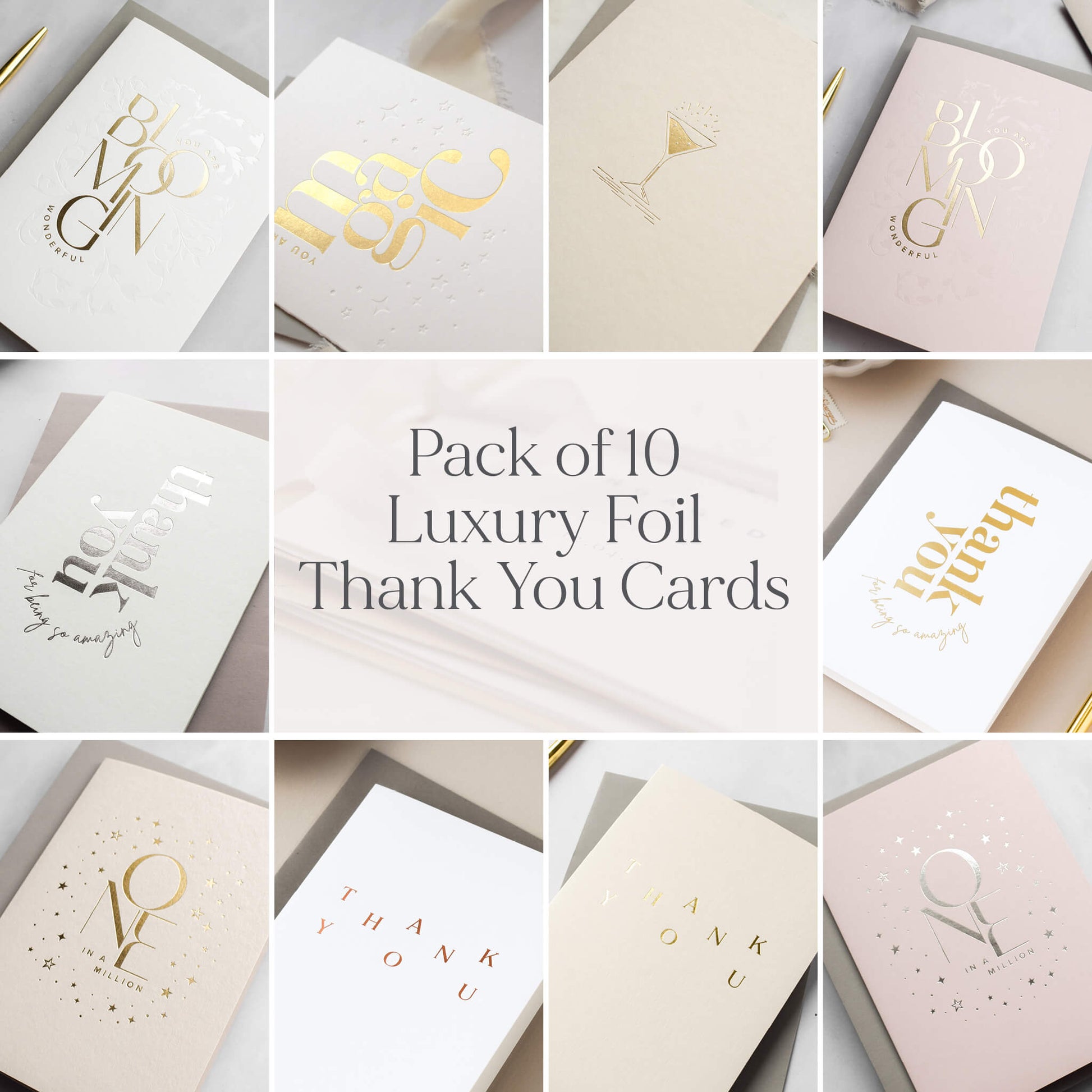 Be prepared for any unexpected special occasions and be ready to send your thanks to friends or family with this pack of ten luxury thank you cards, all printed in foil onto luxurious heavyweight card. This luxury card bundle contains the following foil greeting cards: