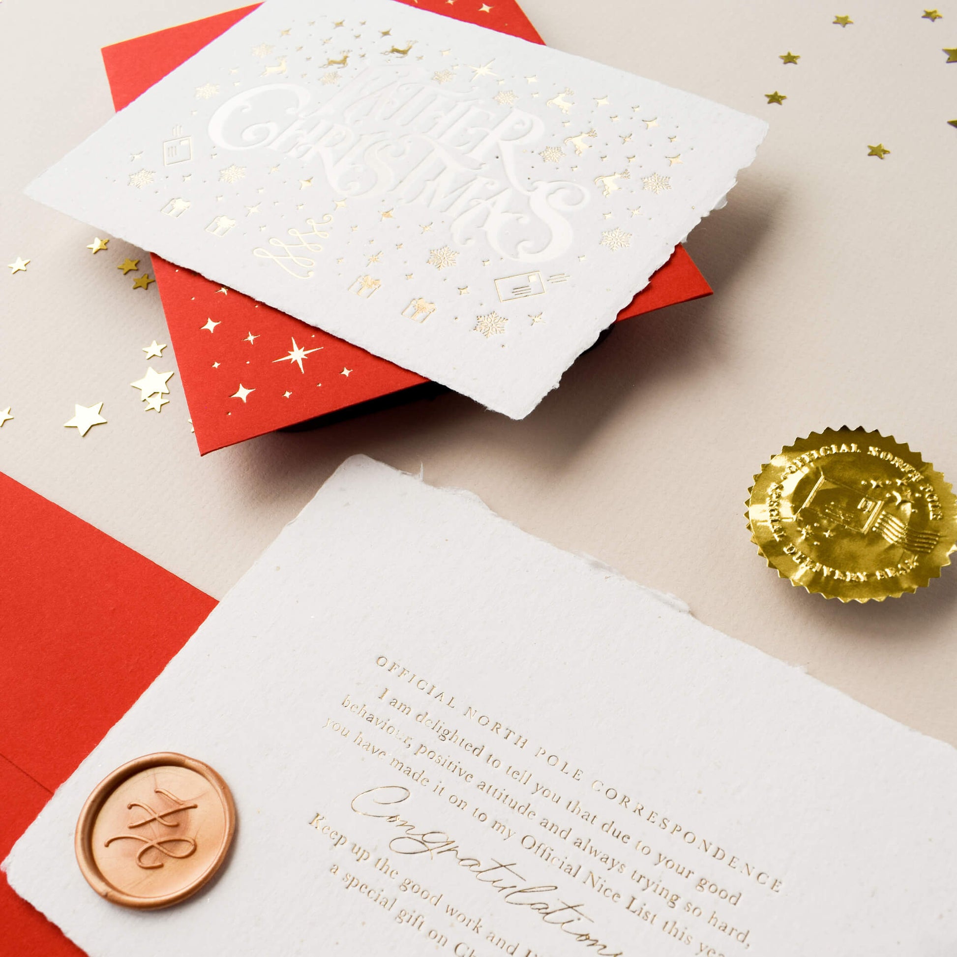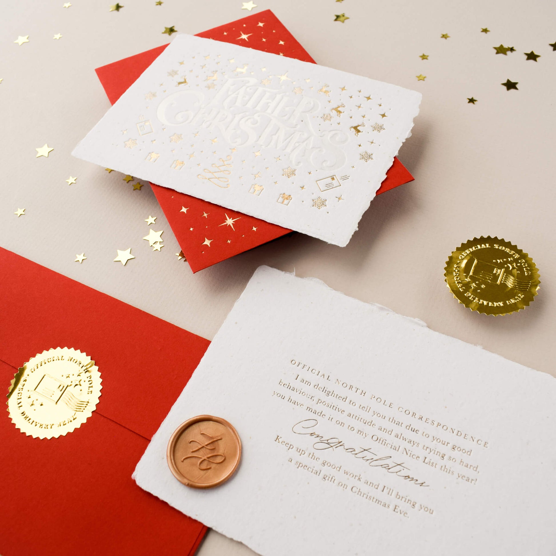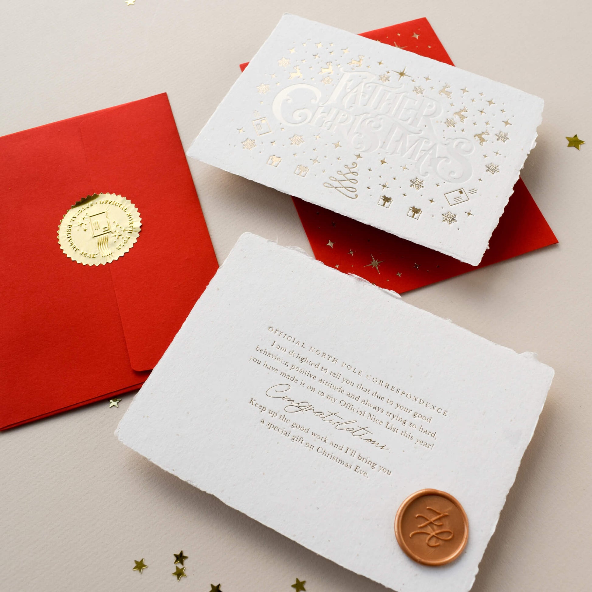 This postcard features the words 'Father Christmas' printed in pearlescent foil and surrounded by a magical, festive illustration printed in metallic gold foil. The other side has a message from Father Christmas that reads 'Official North Pole Correspondence. I am delighted to tell you that due to your good behaviour, positive attitude and always trying so hard, you have made it on to my Official Nice List this year. Congratulations. Keep up the good work and I'll bring you a special gift on Christmas Eve'. To authenticate the postcard it is finished with Father Christmas' personal wax seal.