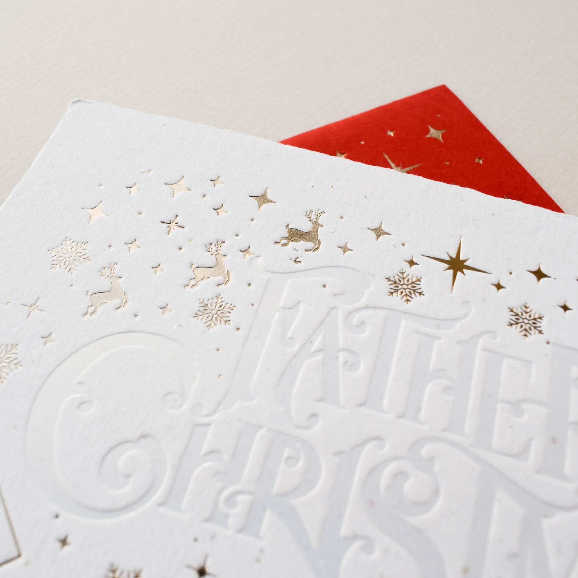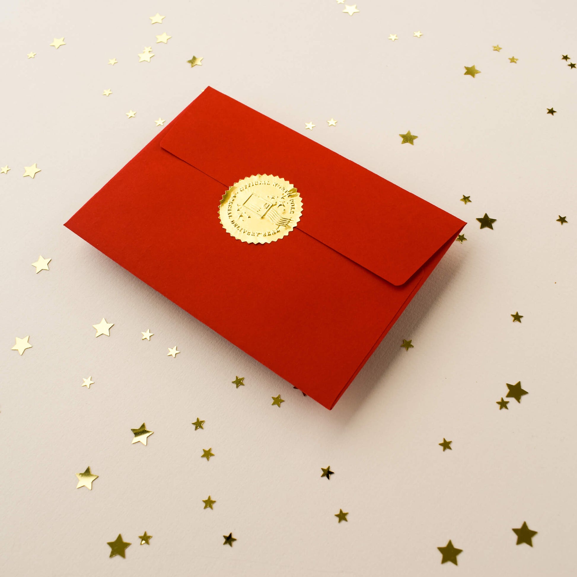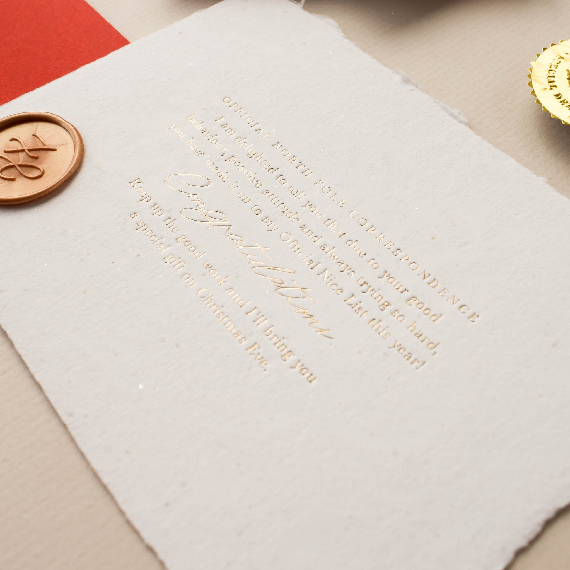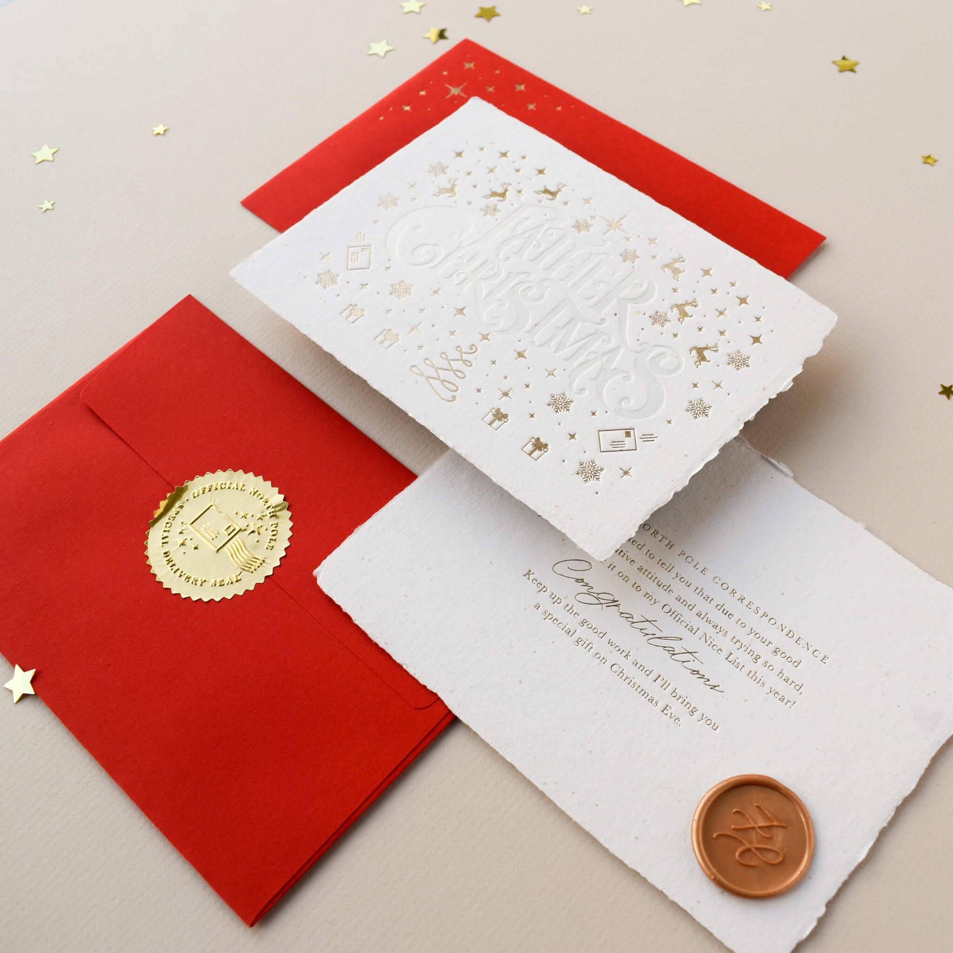 This postcard features the words 'Father Christmas' printed in pearlescent foil and surrounded by a magical, festive illustration printed in metallic gold foil. The other side has a message from Father Christmas that reads 'Official North Pole Correspondence. I am delighted to tell you that due to your good behaviour, positive attitude and always trying so hard, you have made it on to my Official Nice List this year. Congratulations. Keep up the good work and I'll bring you a special gift on Christmas Eve'. To authenticate the postcard it is finished with Father Christmas' personal wax seal.