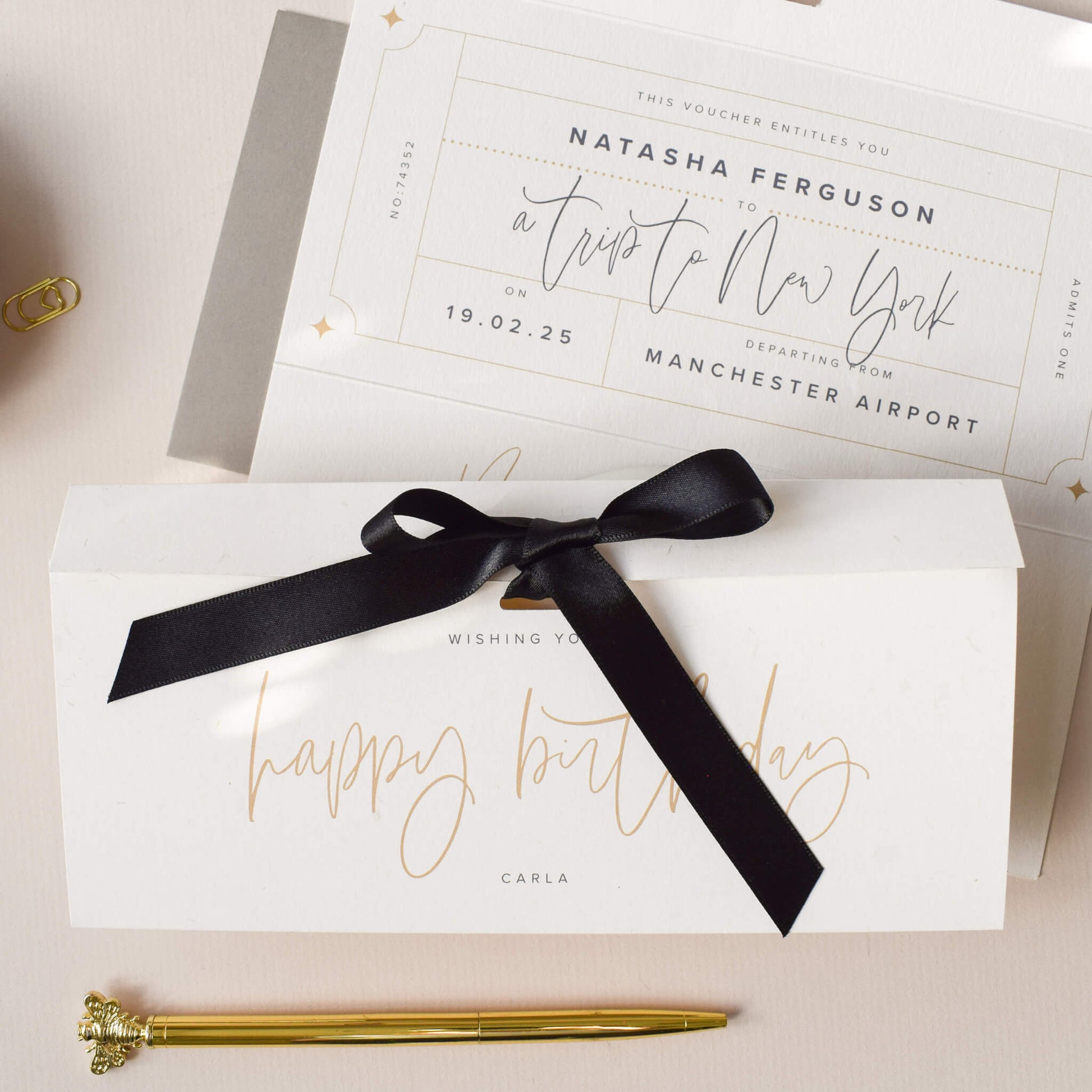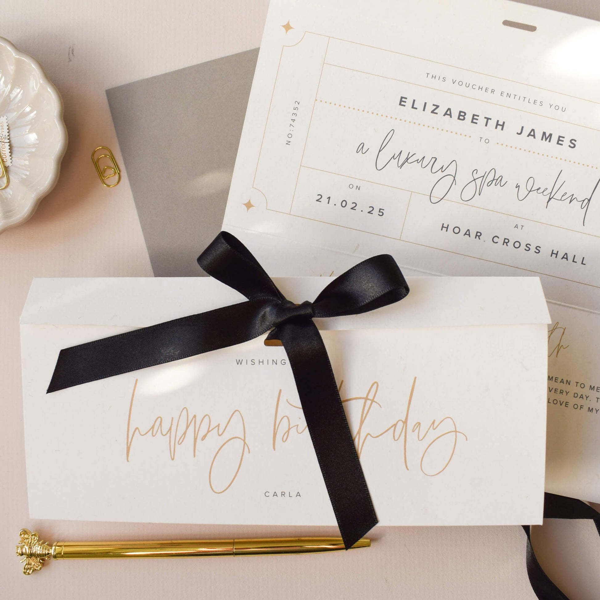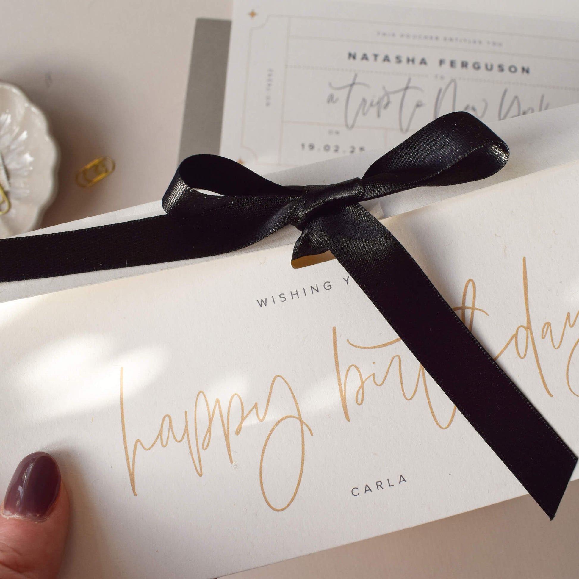 Whether it’s a spa day, theatre trip or even a city break, this beautifully designed personalised voucher card elevates the excitement of the occasion. The front features the words 'Wishing You A Happy Birthday' and their name. When your loved one unties the black satin ribbon and opens the card, they'll discover a personalised voucher for their experience.