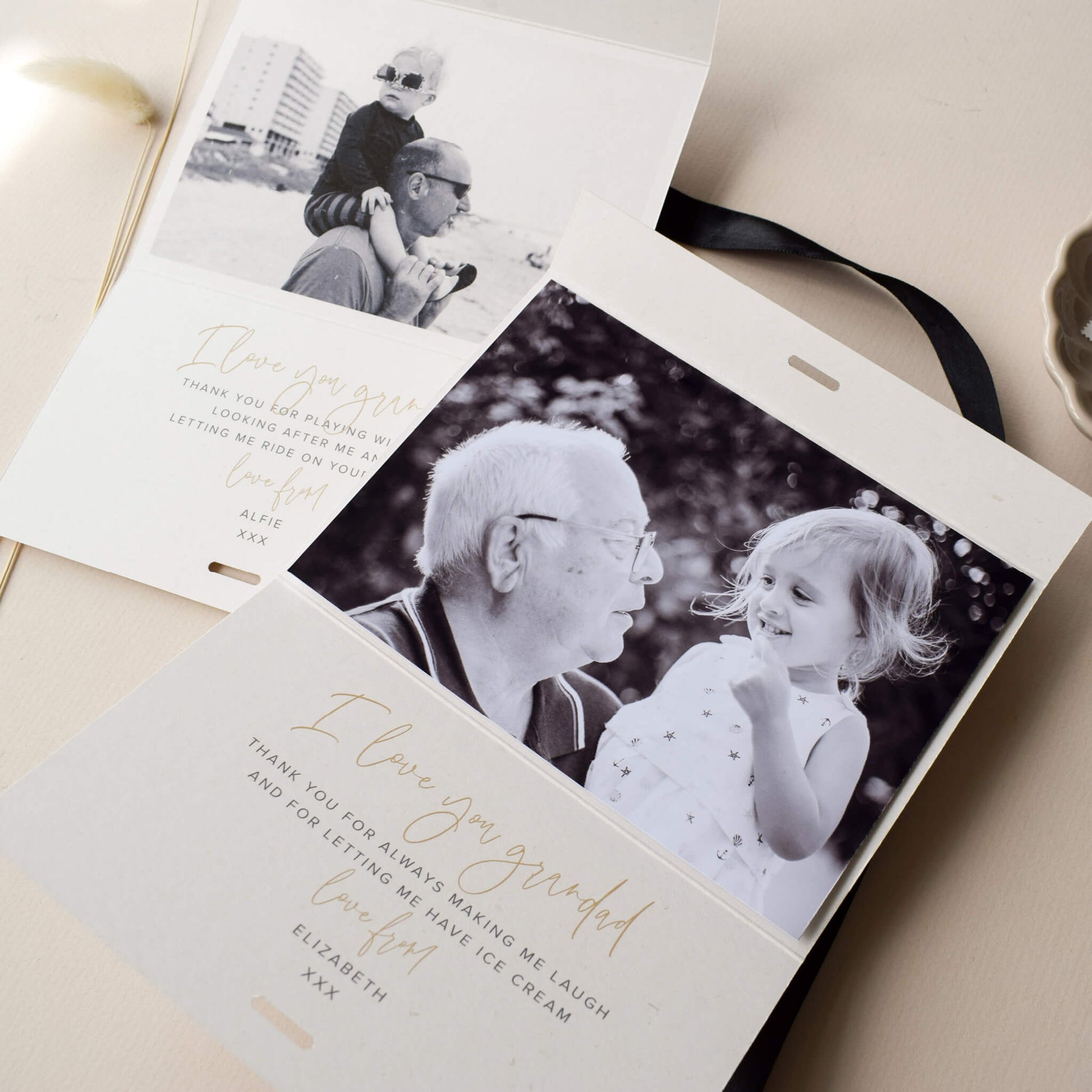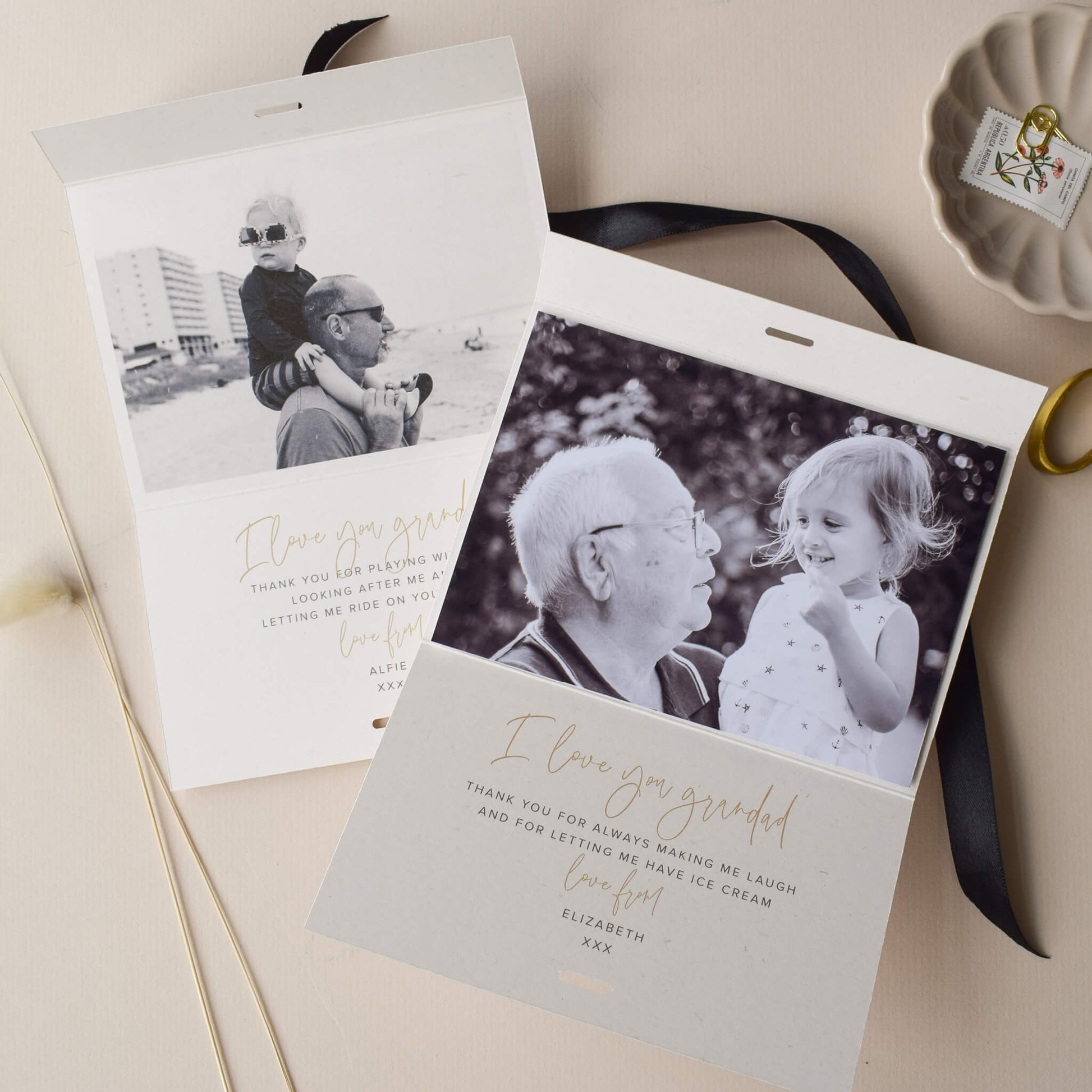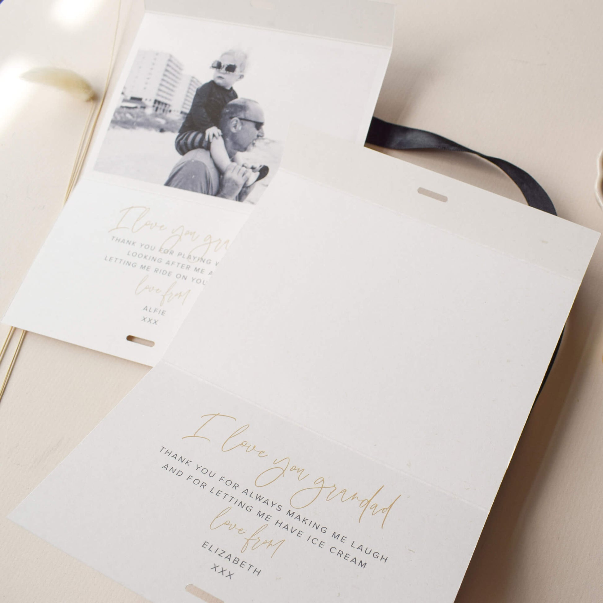 Make Father's Day truly unforgettable for Grandad with a unique, personalised Father's Day Photo Card. Created to honour the incredible Grandads who bring love and joy into our lives, this card is designed to be a cherished keepsake. The front of the card warmly declares, "To the best grandad in the whole world." When he unties the elegant satin ribbon and opens the card, he'll discover a treasured photo that speaks volumes, because a picture paints a thousand words.