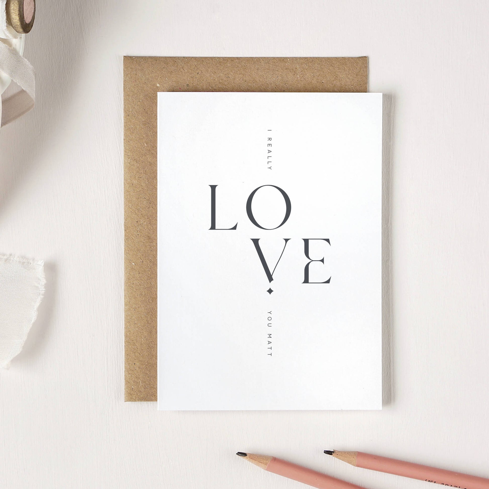 This card features the word 'love' in a decorative serif typeface and can be personalised to make it extra special. Whether it's romantic love, love for a family member or friend, you can say it with this card, because what could be better than receiving a beautiful card to remind you that you are loved.