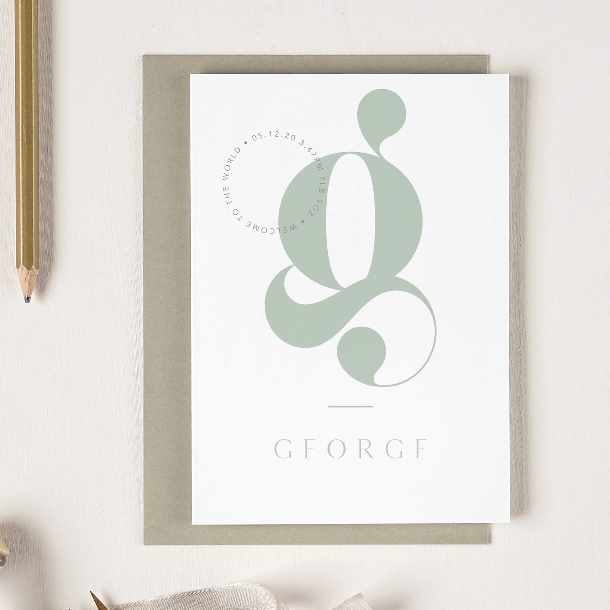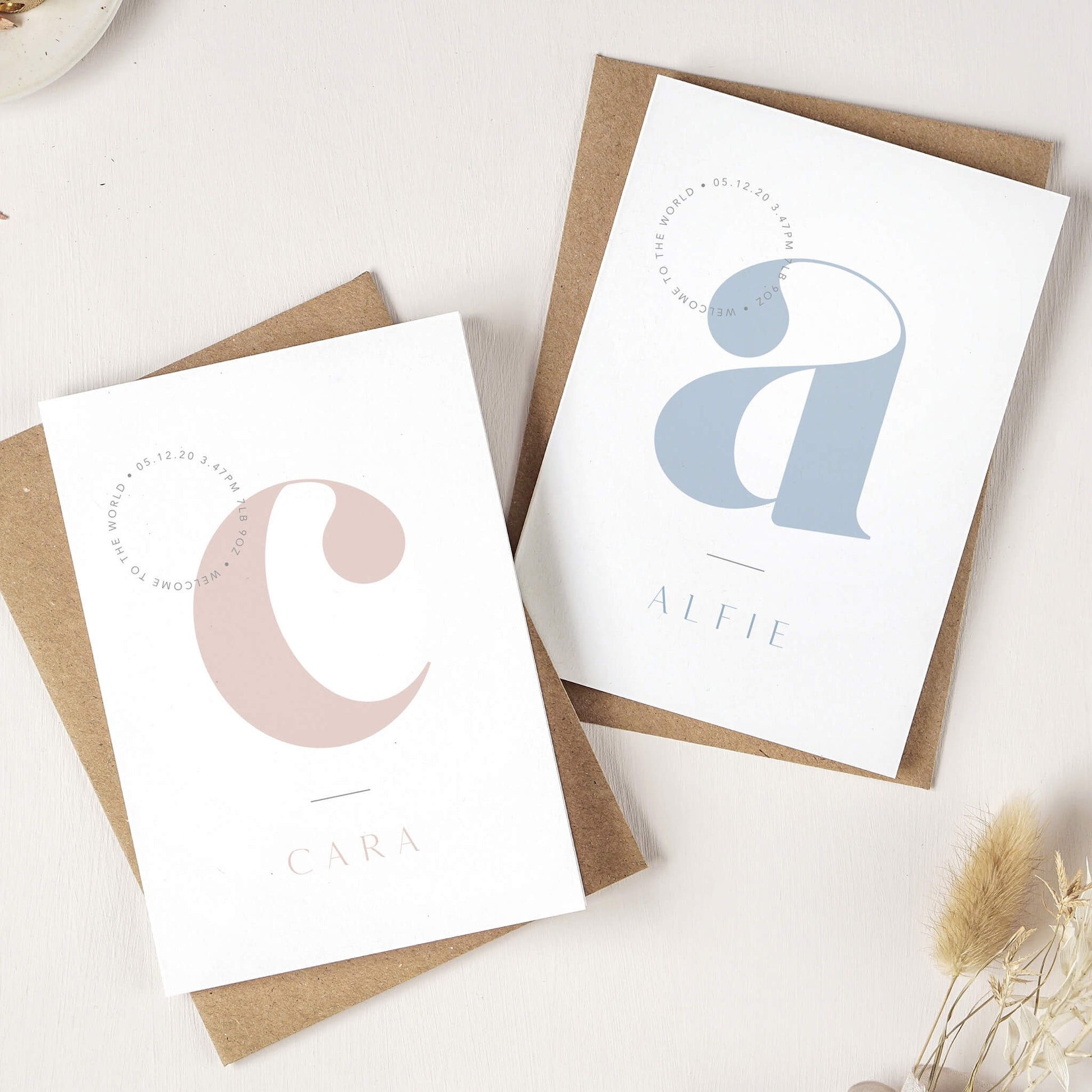 With an elegant, minimalistic design this card features the recipients initial and their name prominently in the centre of the card. There is also space to include a personalised message or birth details in smaller text at the top left of the card.