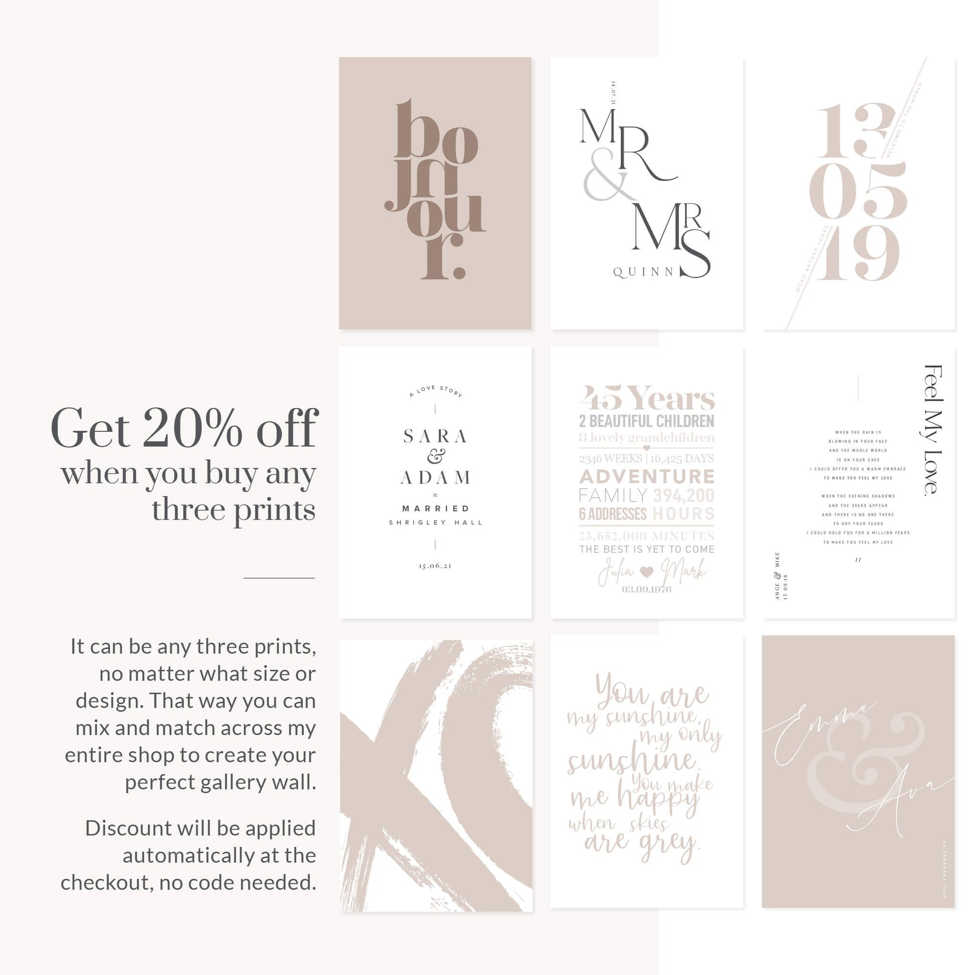 All of my prints are designed to allow you to personalise them as I think this enhances and elevates a home print to create a treasured possession that you will love. This print is no different and although I've already included space to personalise it with names, address and date you can add any other special details that you would like. Just place a note on your order specifying all the details you want on your print and I will include them.