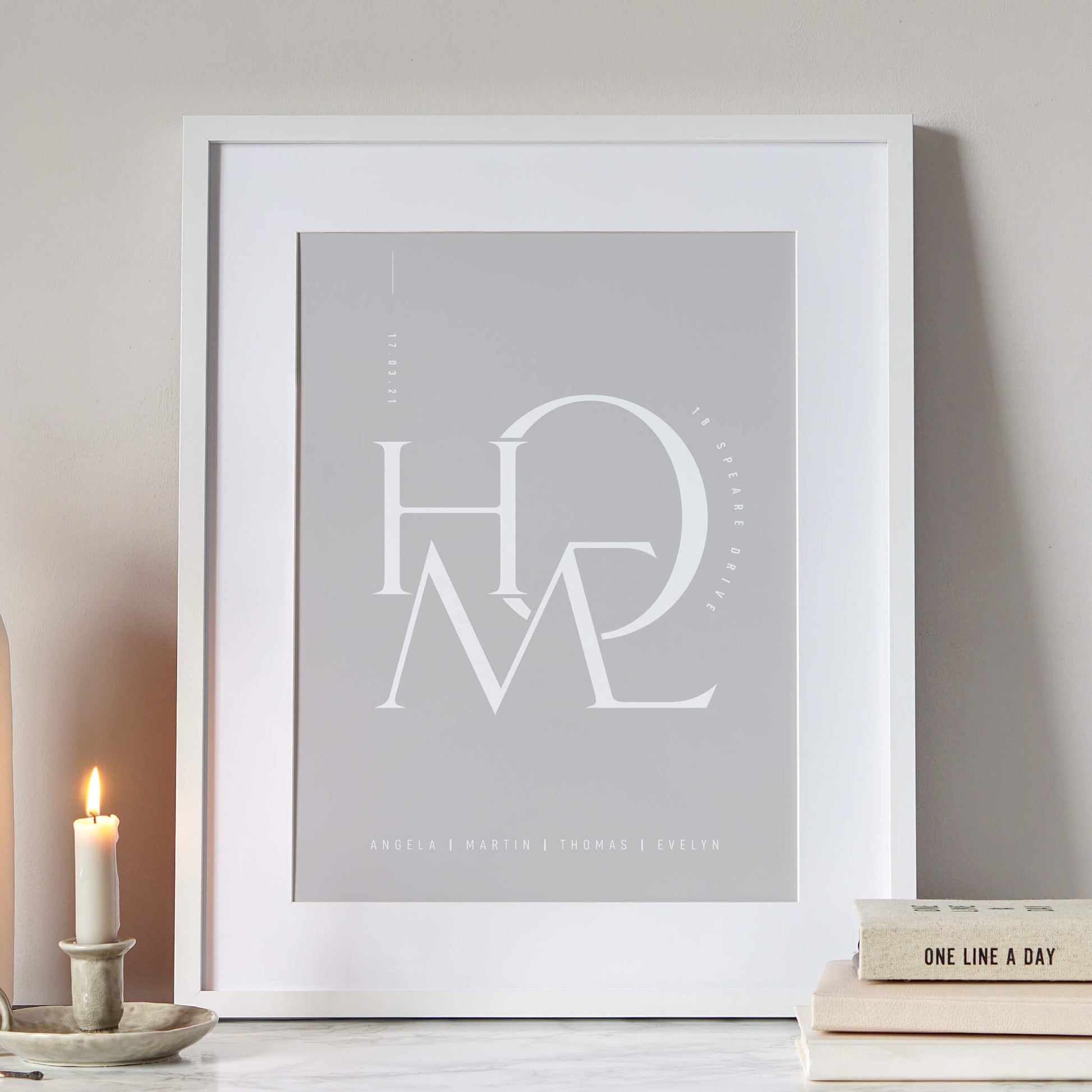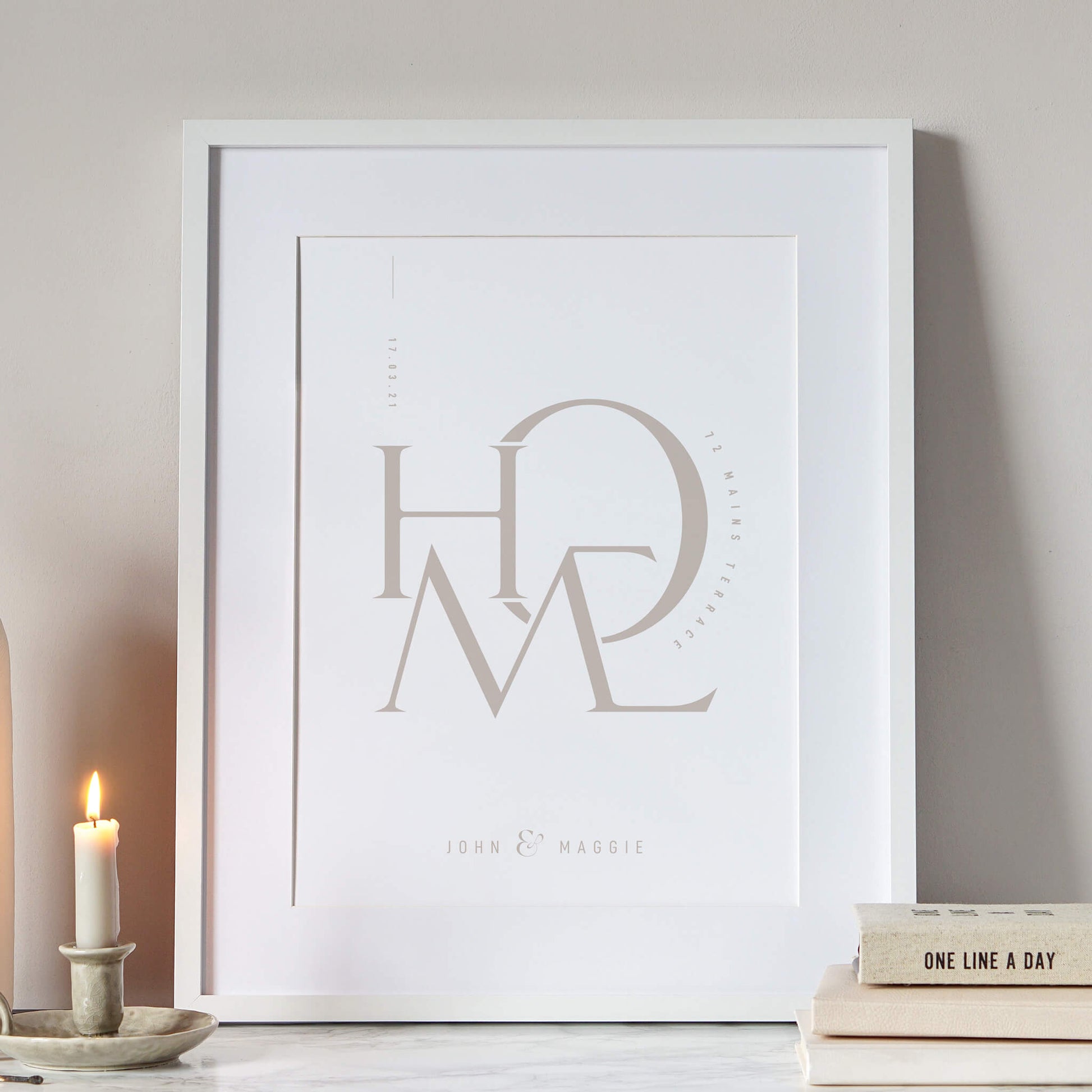 This new home print features a custom made icon meticulously created from the word home. Personalised with your home address, names and the date you moved in, this print makes a beautiful gift to celebrate a new home.